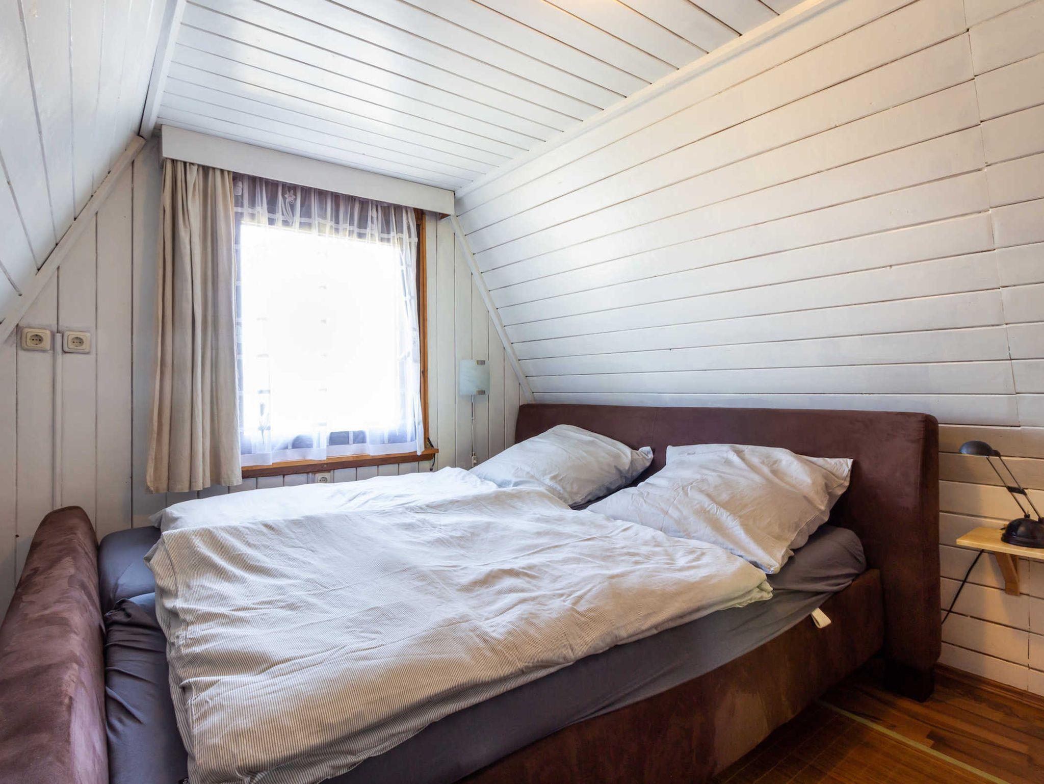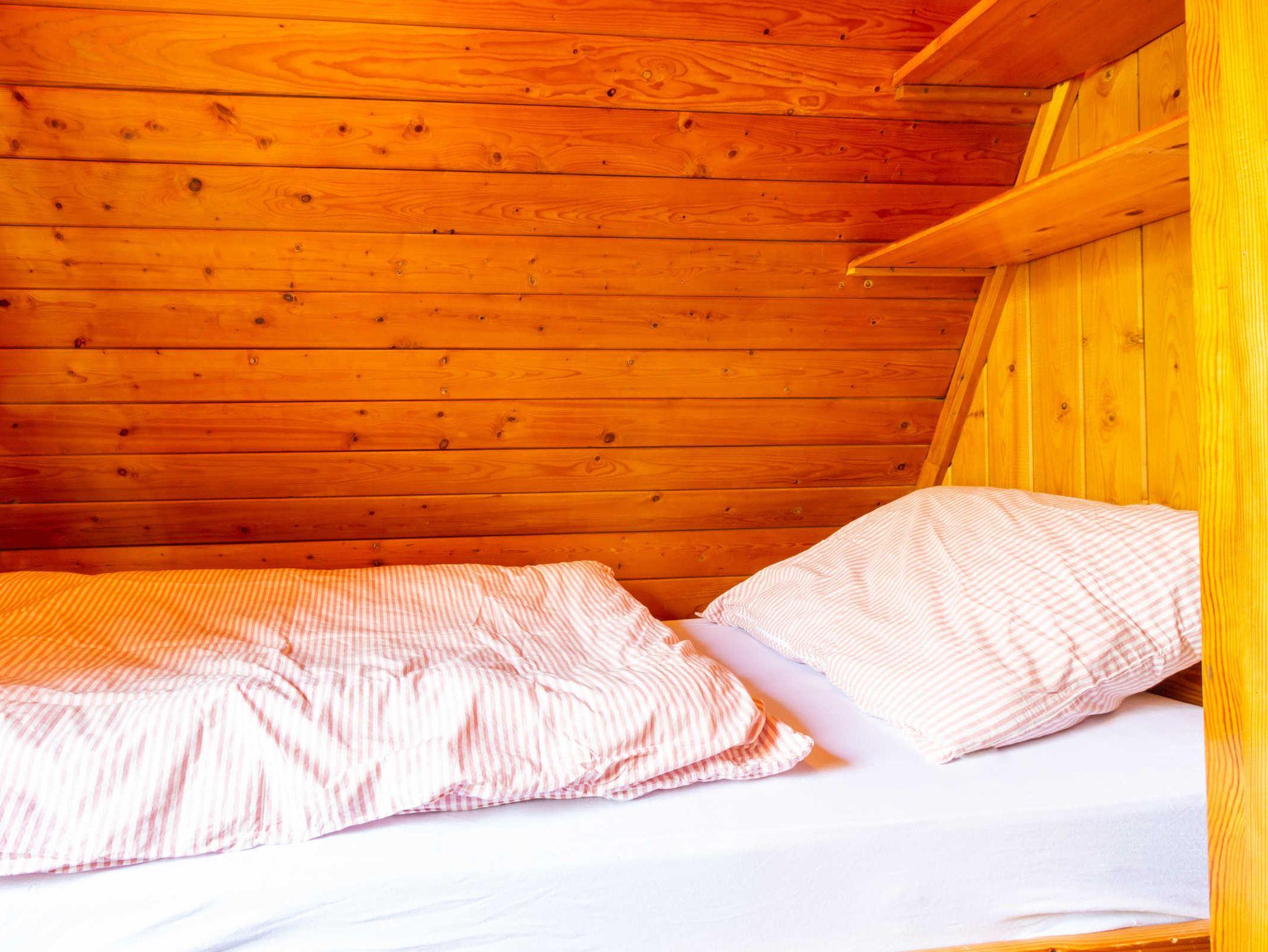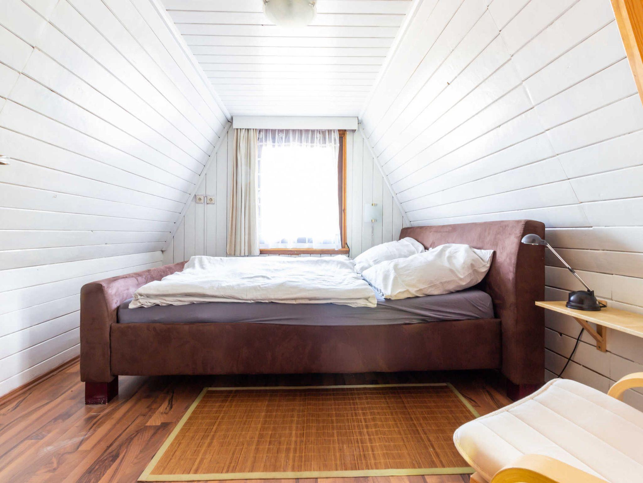 Über eine schmale Wendeltreppe gelangt man ins Obergeschoss mit zwei Schlafräumen.