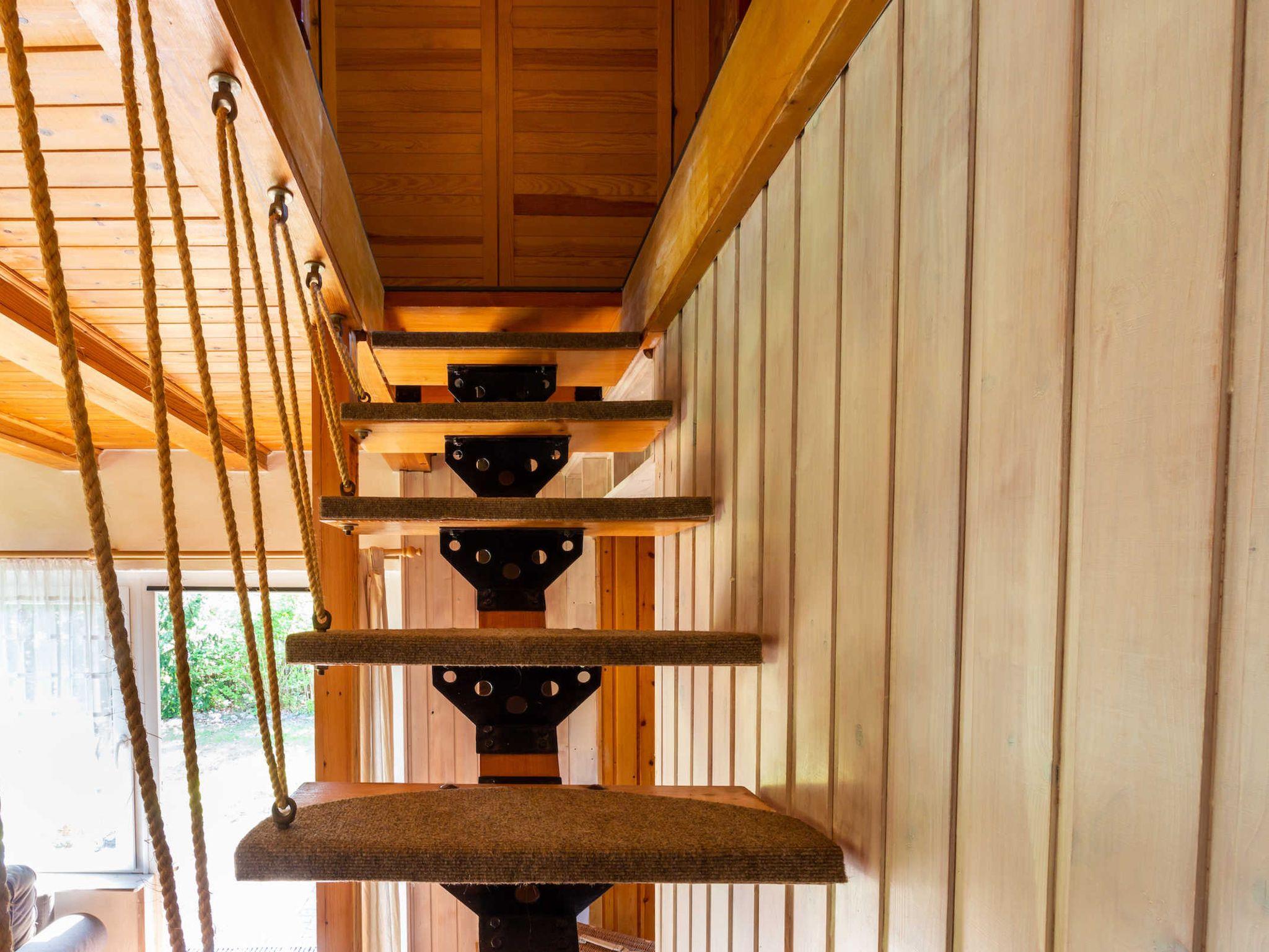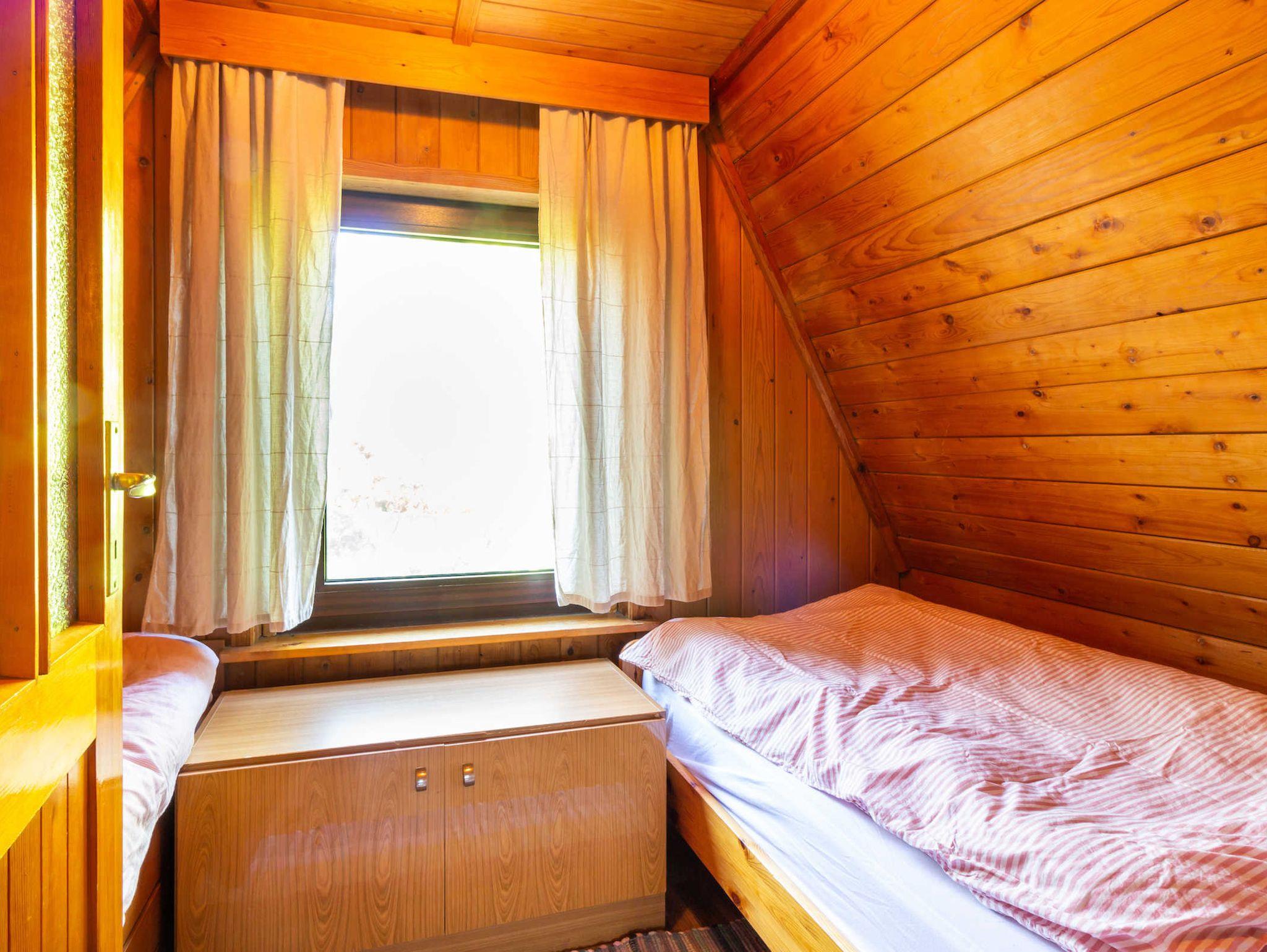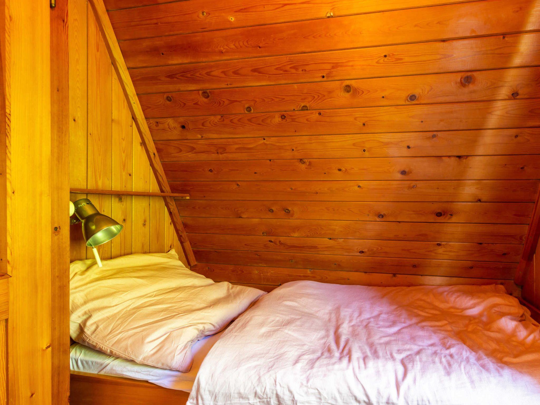 Über eine schmale Wendeltreppe gelangt man ins Obergeschoss mit zwei Schlafräumen.