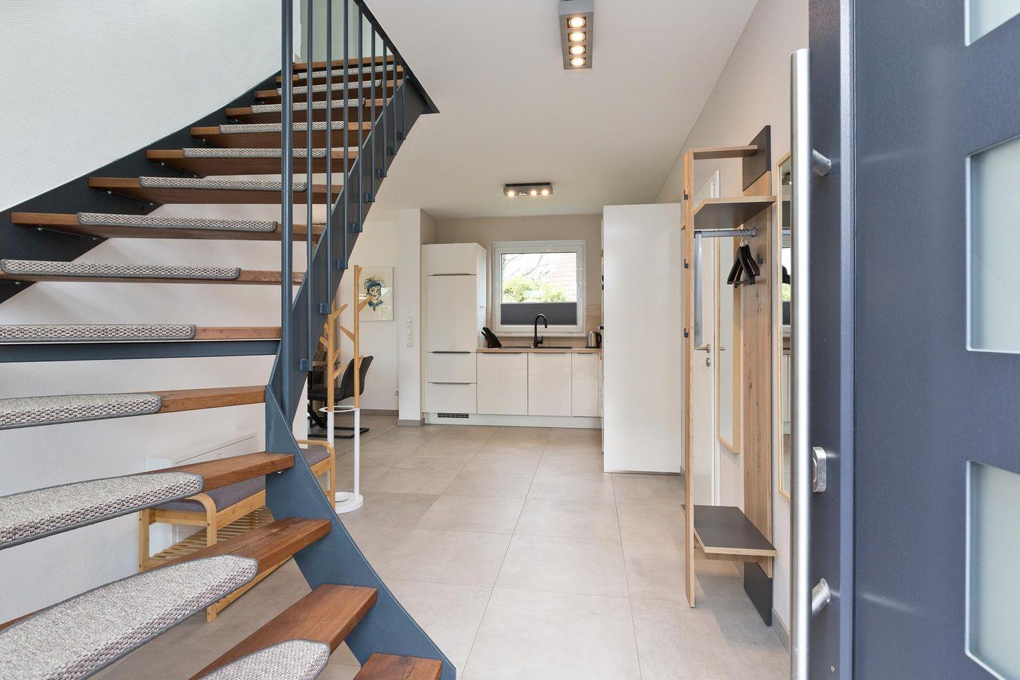 Im Erdgeschoss befindet sich der großzügige Wohn-Küchen und Essbereich. Hier erwartet Sie eine gehobene und exklusive Ausstattung mit einem Ecksofa, Couchtisch einer Wohnwand und einem 65 Zoll Fernseher, sowie Internetradio und einer 5G - Wlan Box (inkl. unbegrenzte Flat) auf allen Räumen verteilt. Hier haben Sie die Möglichkeit mit Ihren Lieben gemütliche Fernsehabende zu verbringen. Die Küche lässt ebenfalls keine Wünsche offen, hier befindet sich alles was man benötigt um ein tolles Essen zu zaubern und seine Lieben zu verwöhnen. Die Küche besitzt eine Nespressomaschine und eine Filterkaffeemaschine, Thermoskanne, Kaffeedose, Wasserkocher, Toaster, Schneidebretter, Handmixer, Küchenwaage, Sparschäler, Zitronenpresse, 60 teiliges Besteckset, 12 teilige Essgeschirrset, 12 teiliges Kaffeegeschirrset und ausreichend Gläser.