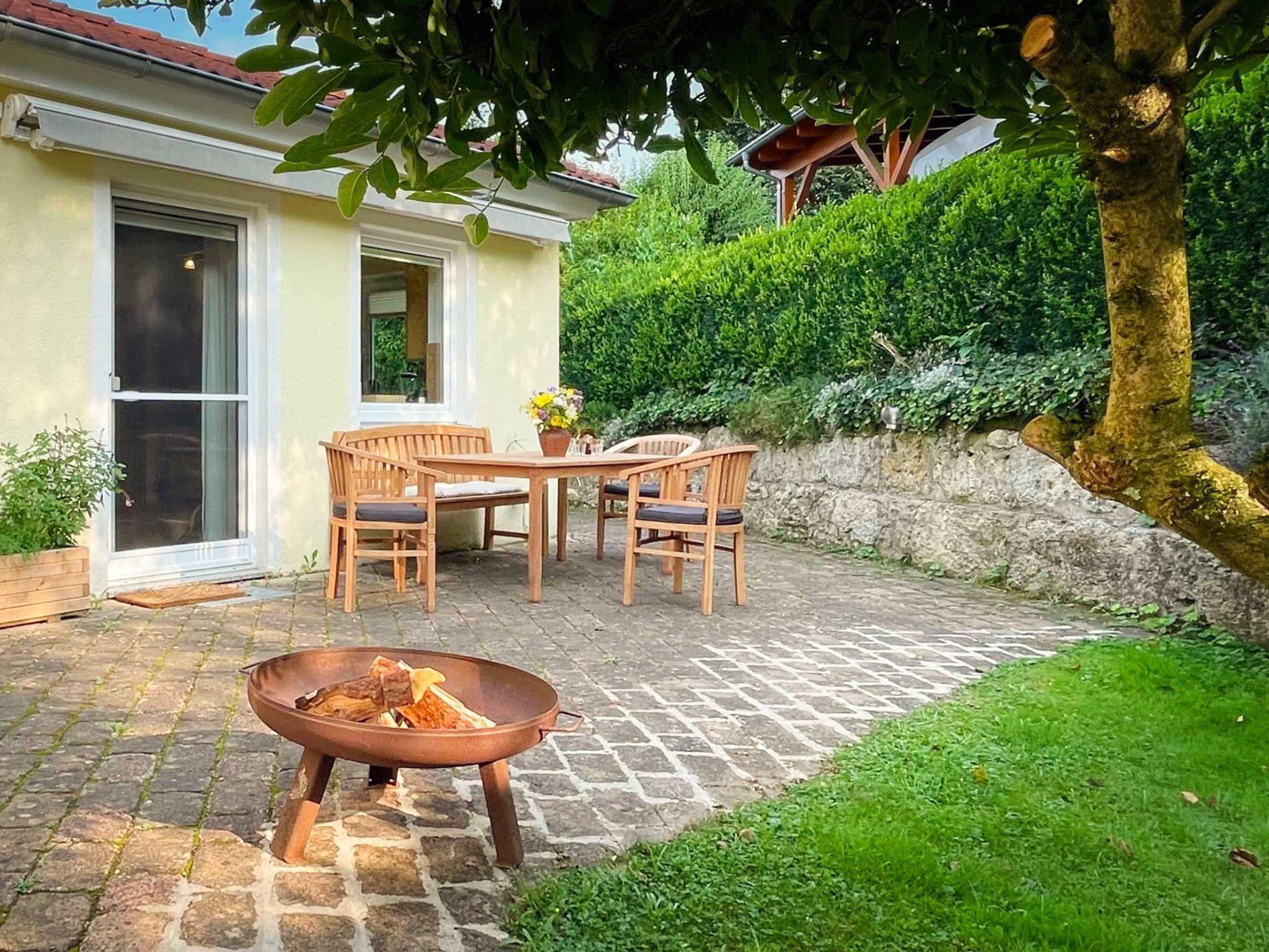 Die Terrasse mit Grillplatz, Feuerschale und Vollholzsitzgarnitur kann durch eine elektrische Markise zum angenehmen Schattenplatz umfunktioniert werden. Ob Sie auf dem Rasen Sonnenbaden oder sich in der Quelle ein kühles Getränk holen, Sie sollen sich rundum wohlfühlen.