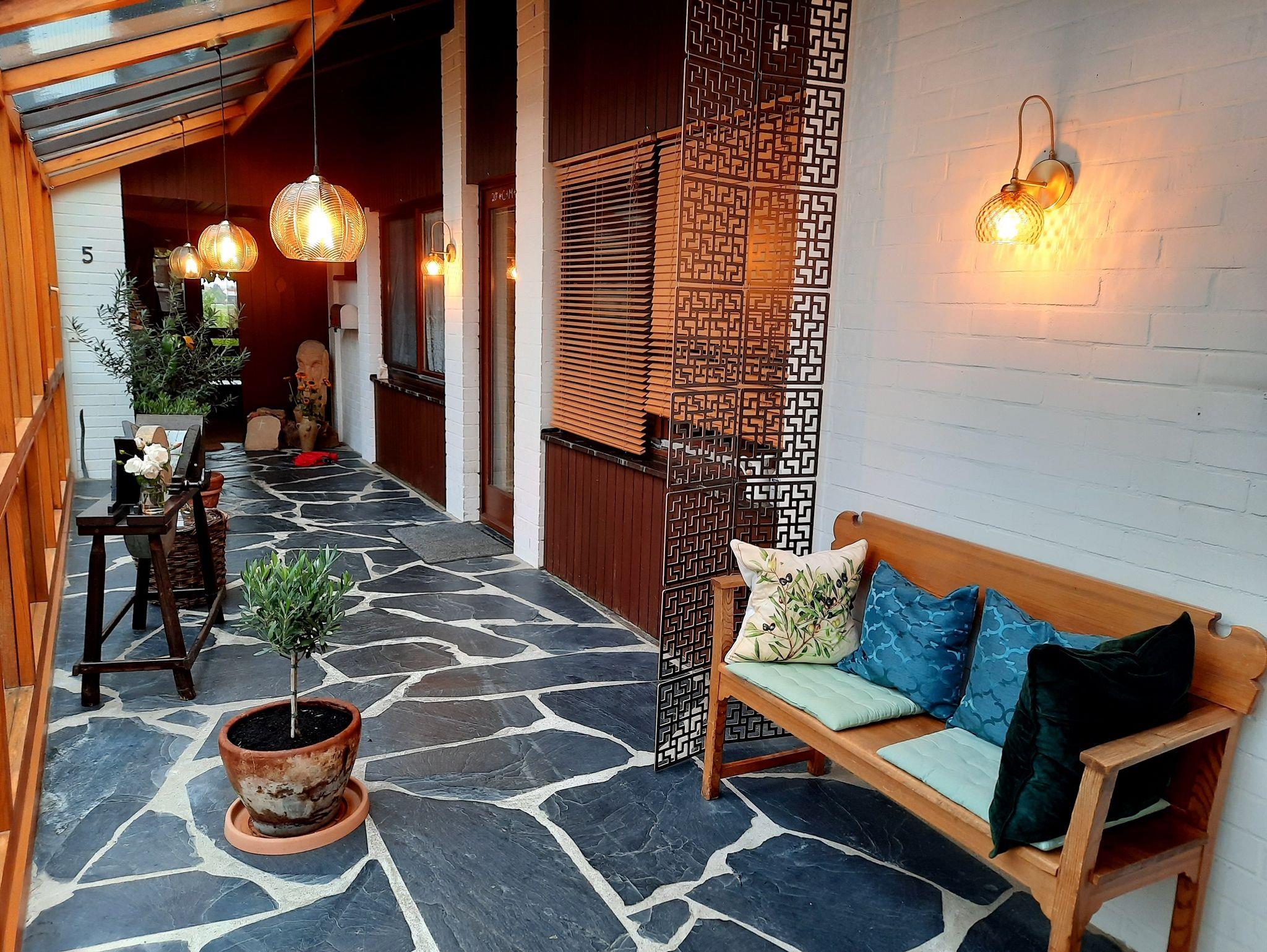Beide Domizile befinden sich im Nebenhaus und sind durch zwei Verbindungstüren voneinander getrennt. Den Eingangsbereich schützt ein Wintergarten, in dem unsere Olivenbäumchen wachsen.