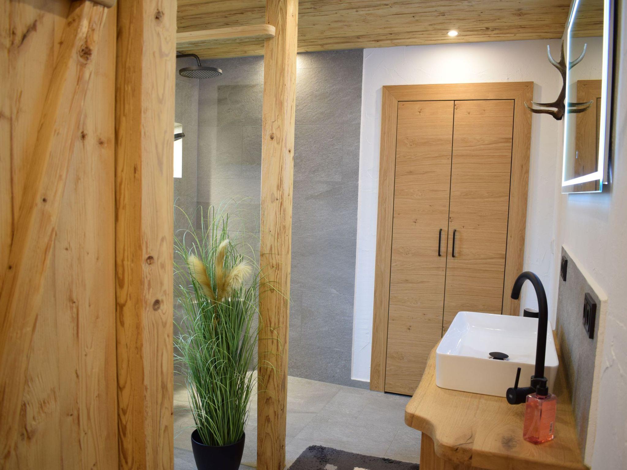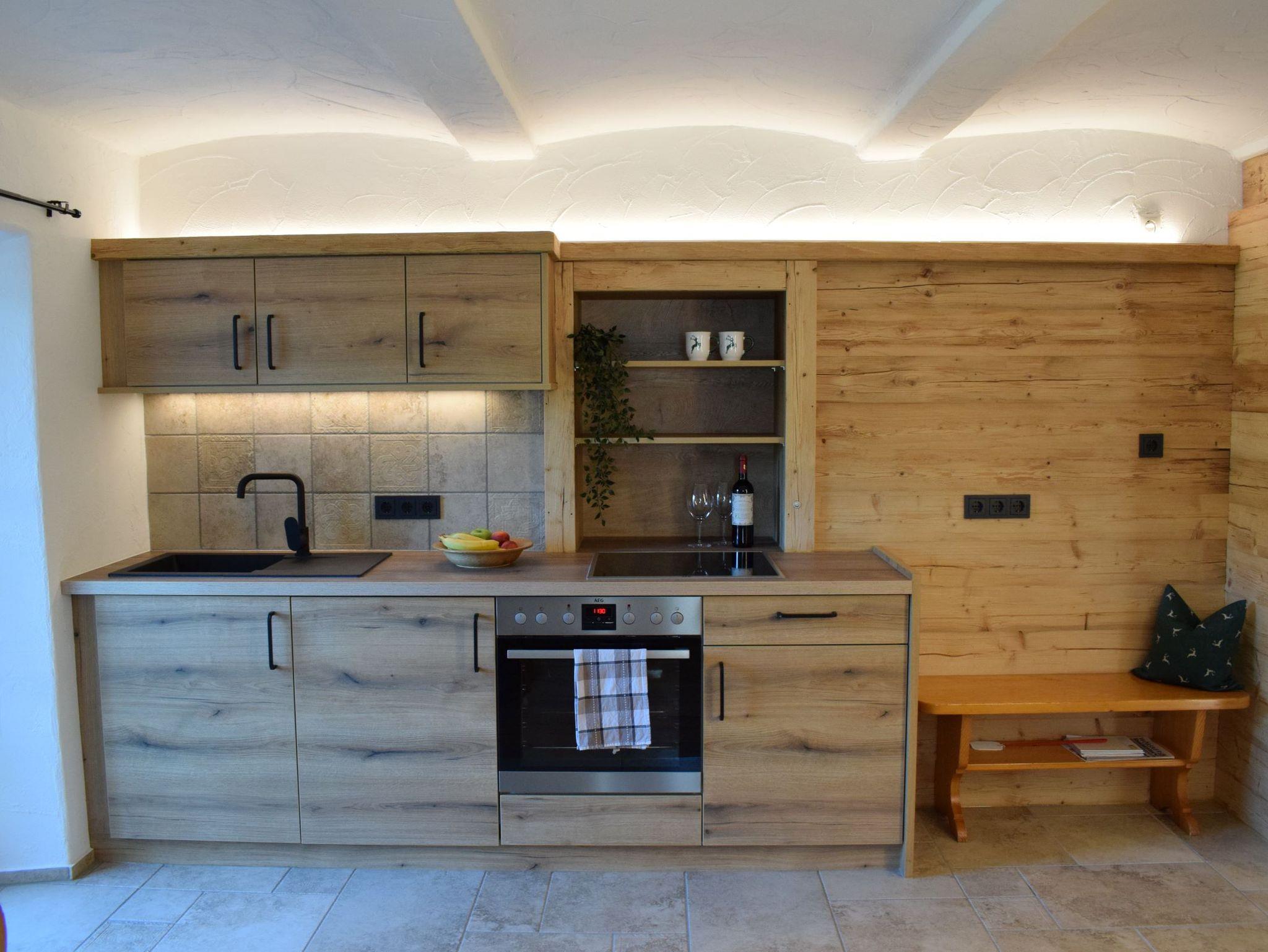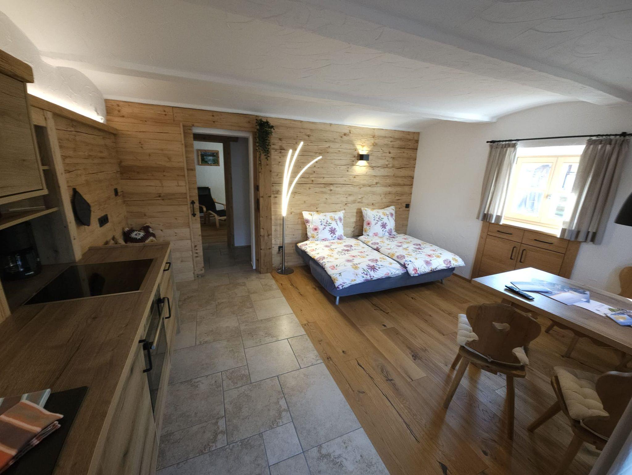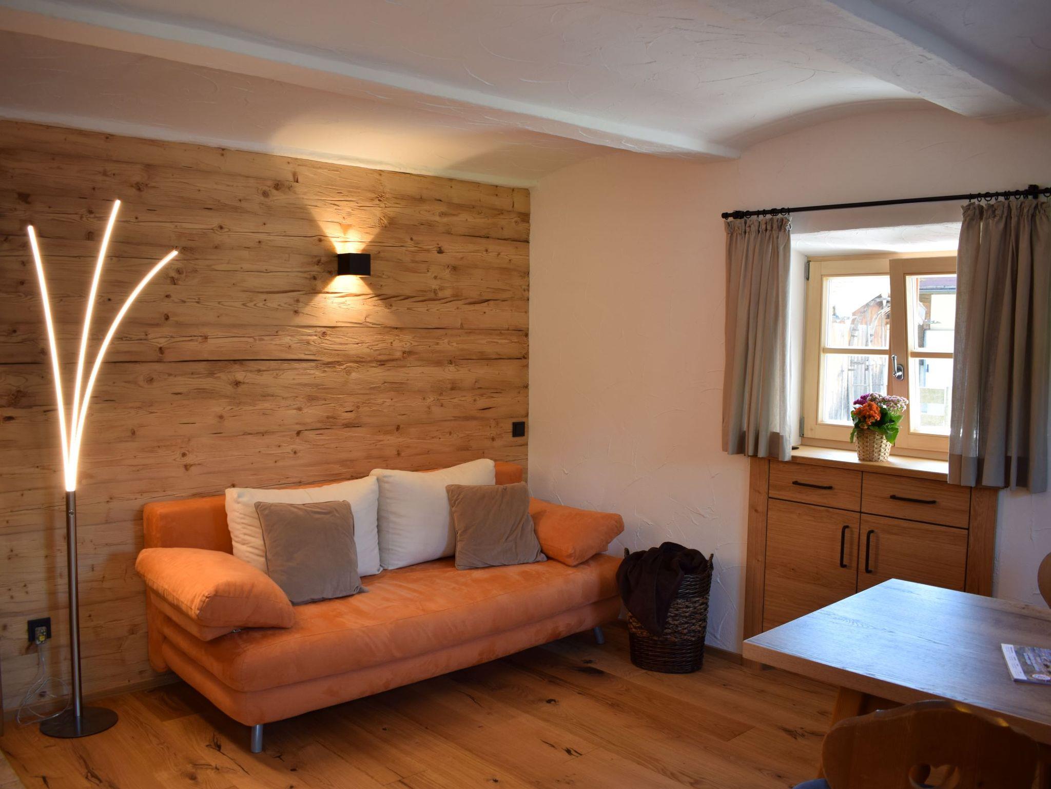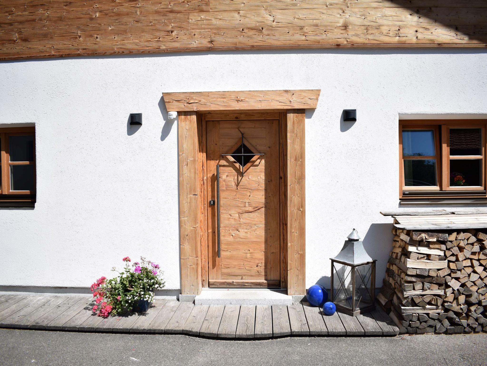 Das neu renovierte Haus, das im Jahr 2024 fertiggestellt wurde, strahlt eine harmonische Verbindung von modernem alpenländlichem Stil und traditionellem Charme aus. Die Fassade ist mit hochwertigem gehacktem Altholz verkleidet, das nicht nur für eine warme, einladende Atmosphäre sorgt, sondern auch die regionale Handwerkskunst widerspiegelt.