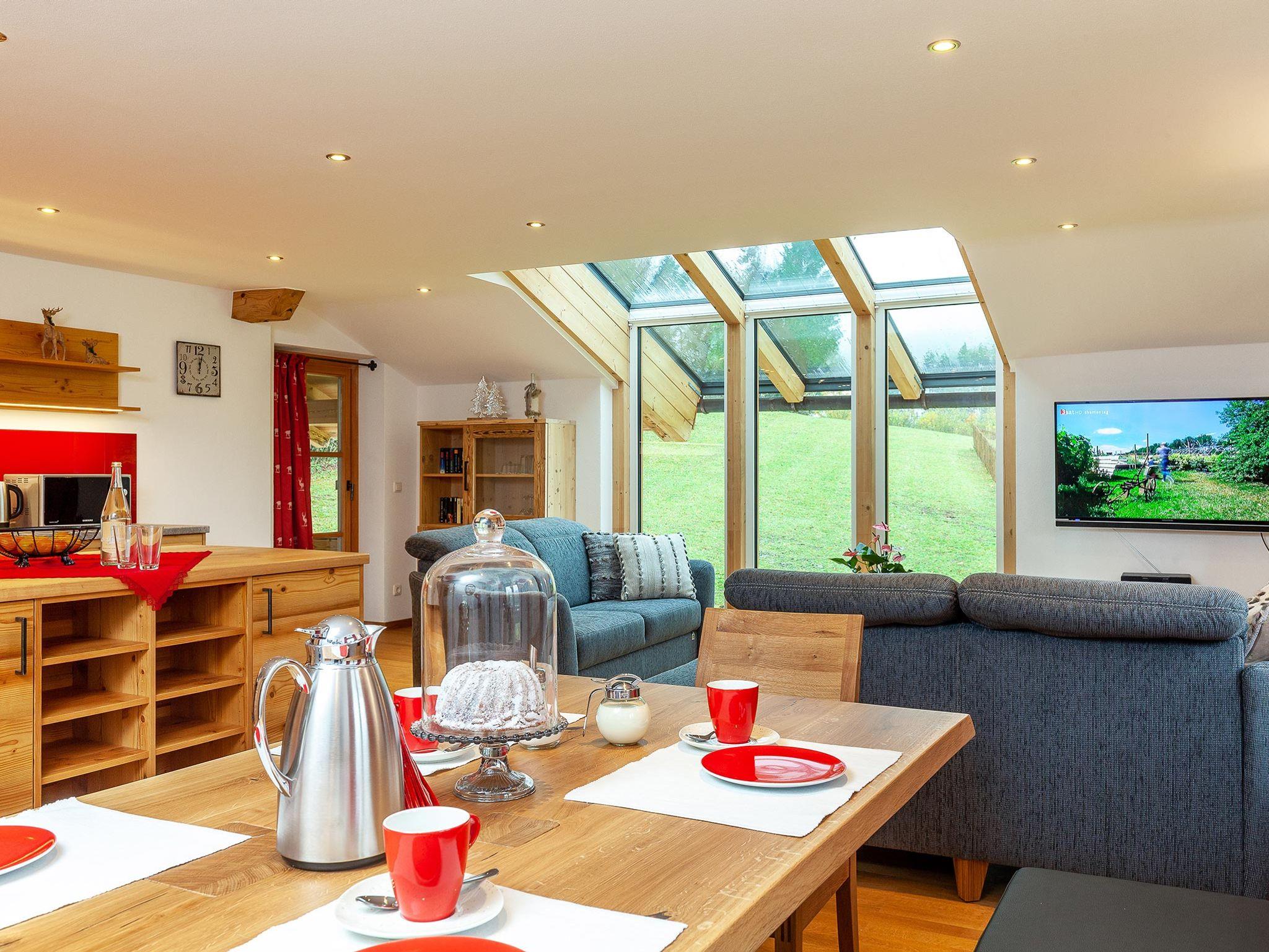 In unserer hellen und modern eingerichteten Ferienwohnung verbringen Sie Ihren Urlaub auf 103 m². Durch die großen Glasfronten haben Sie einen herrlichen Ausblick auf die umliegende Natur. Insgesamt finden in der Ferienwohnung 4-6 Personen ausreichend Platz. Besonders die große Terrasse ist der ideale Ort, um die Sonne zu genießen. Im Winter hingegen lädt die bequeme Couch im geräumigen Wohnzimmer zu gemütlichen Abenden ein.