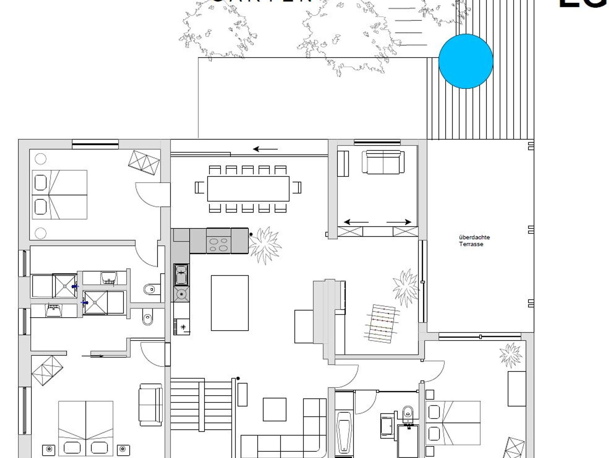 Sehr großzügig geschnittenes Haus von 1975, das zwischen 2021 und 2023 komplett saniert, modernisiert und technisch auf den neuesten Stand gebracht wurde. Das Haus wird von einem romantischen Garten mit Rasenfläche zum Spielen und Ausruhen eingerahmt. Es steht in einer sehr ruhigen Siedlung am Waldrand, am Fuße des Balsberg.