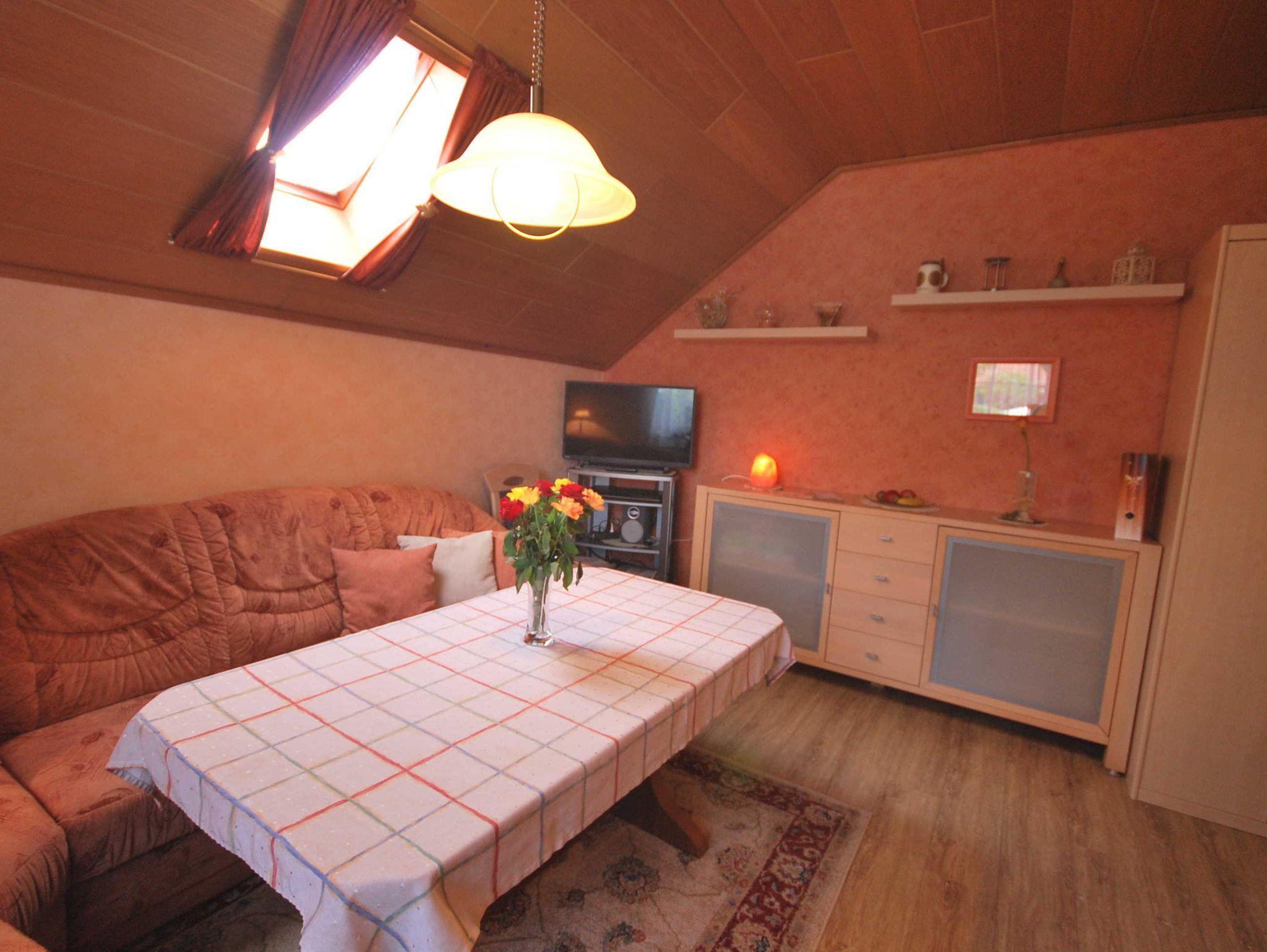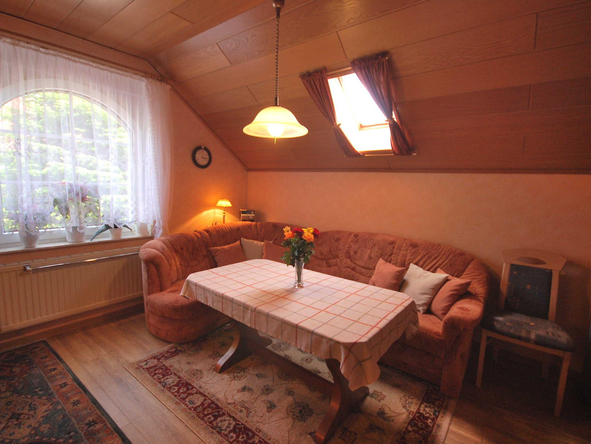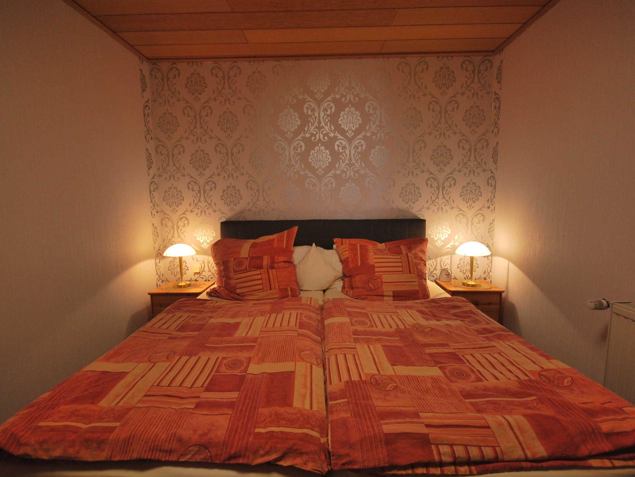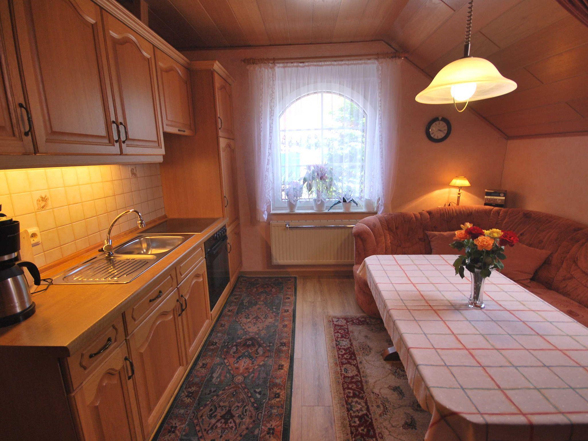 Die Ferienwohnung ist für 4 Personen ausgelegt. Sie verfügt über eine vollausgestattete Küche, einem Wohnzimmer und einem Doppelzimmer, einem Zweibettzimmer sowie ein Bad mit Dusche und WC. Das Zweibettzimmer ist nur über das Schlafzimmer mit Doppelbett zu erreichen (Durchgangszimmer).