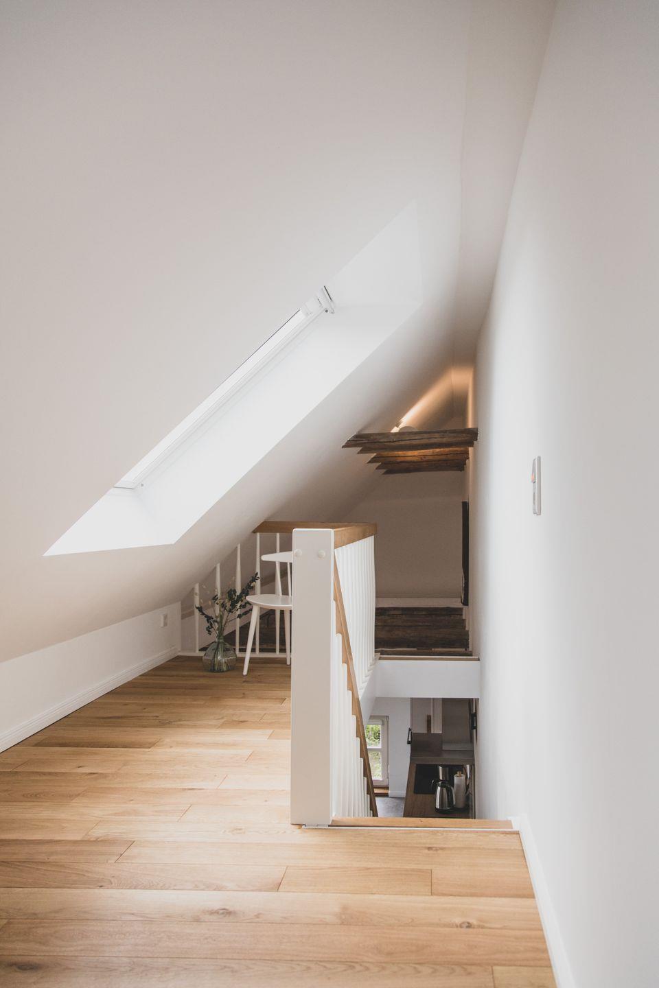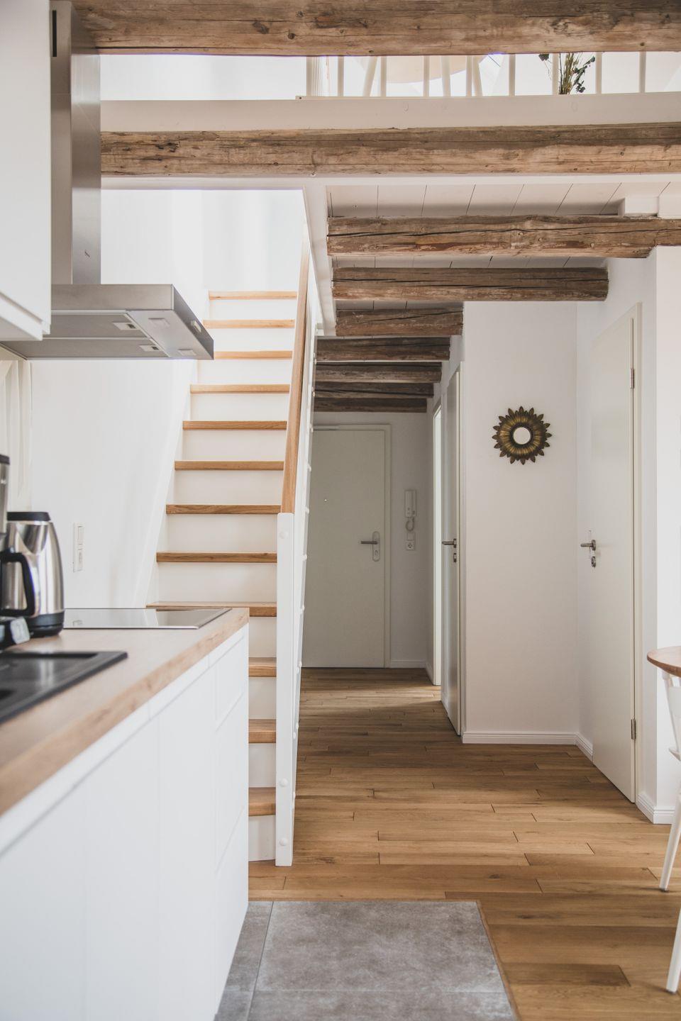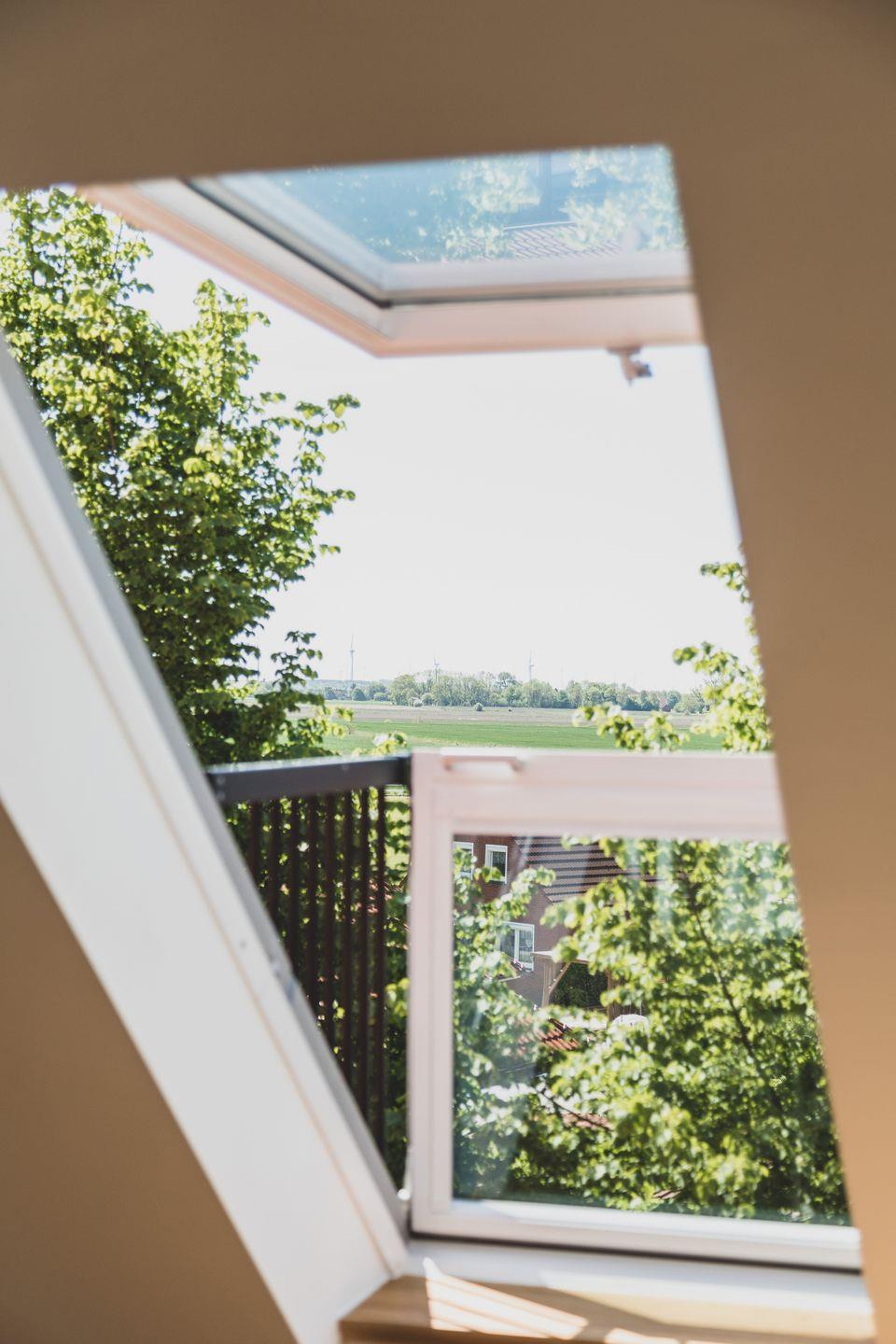 Die Ferienwohnung im zweiten OG erstreckt sich über zwei Etagen und bietet mit einer Größe von 60 m² genügend Platz für bis zu vier Personen. In zwei hellen und gemütlichen Schlafzimmern mit Parkettboden finden Sie den perfekten Rückzugsort nach erlebnisreichen Tagen an der Nordsee. Das Wohnzimmer ist mit einer komfortablen Sofaecke und einem Essbereich ausgestattet, in dem Sie entspannte Abende und gesellige Mahlzeiten genießen können. Die offene Küche ist modern und voll ausgestattet, mit einem Induktionsherd, einem Backofen, einer Spülmaschine und weiteren Annehmlichkeiten. Ob beim Zubereiten eines köstlichen Frühstücks oder beim gemeinsamen Kochen – hier werden kulinarische Momente zu einem besonderen Erlebnis.