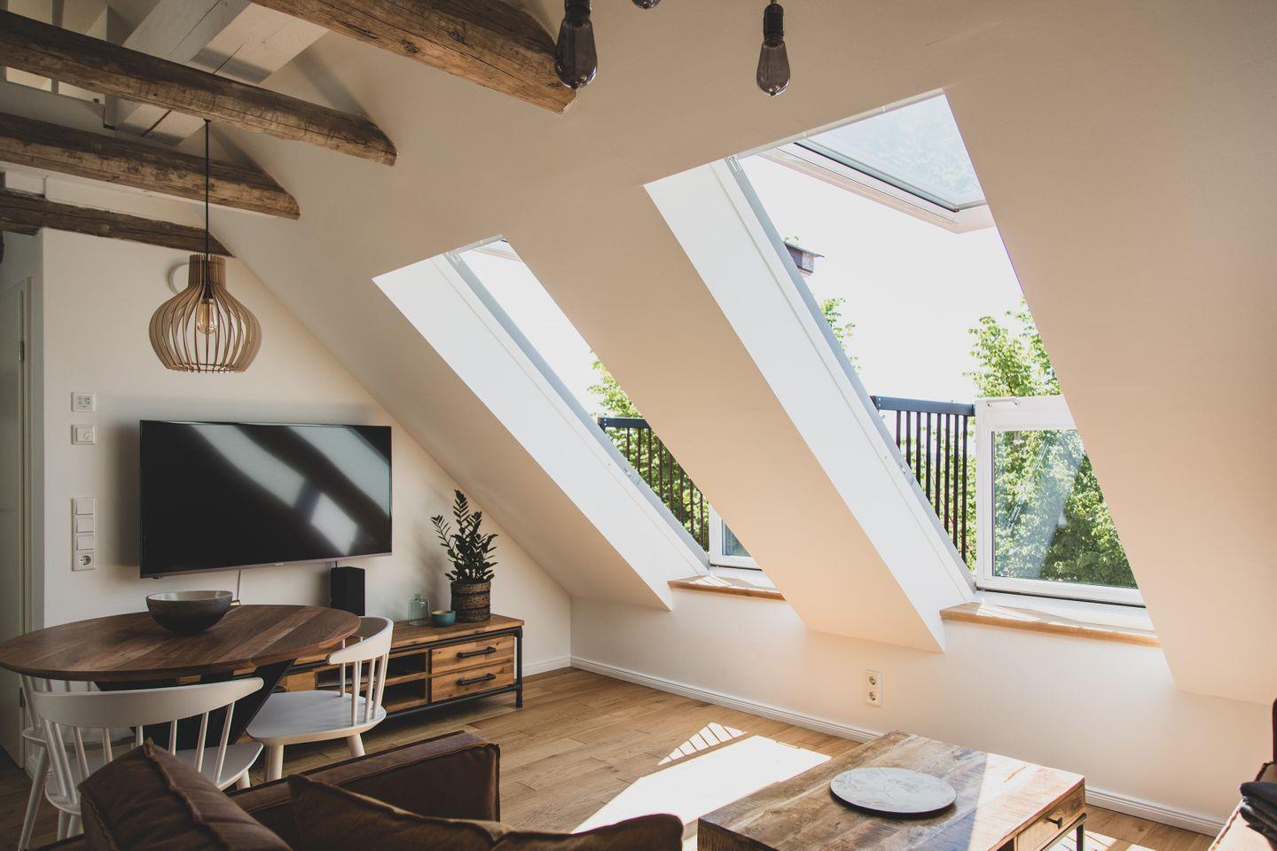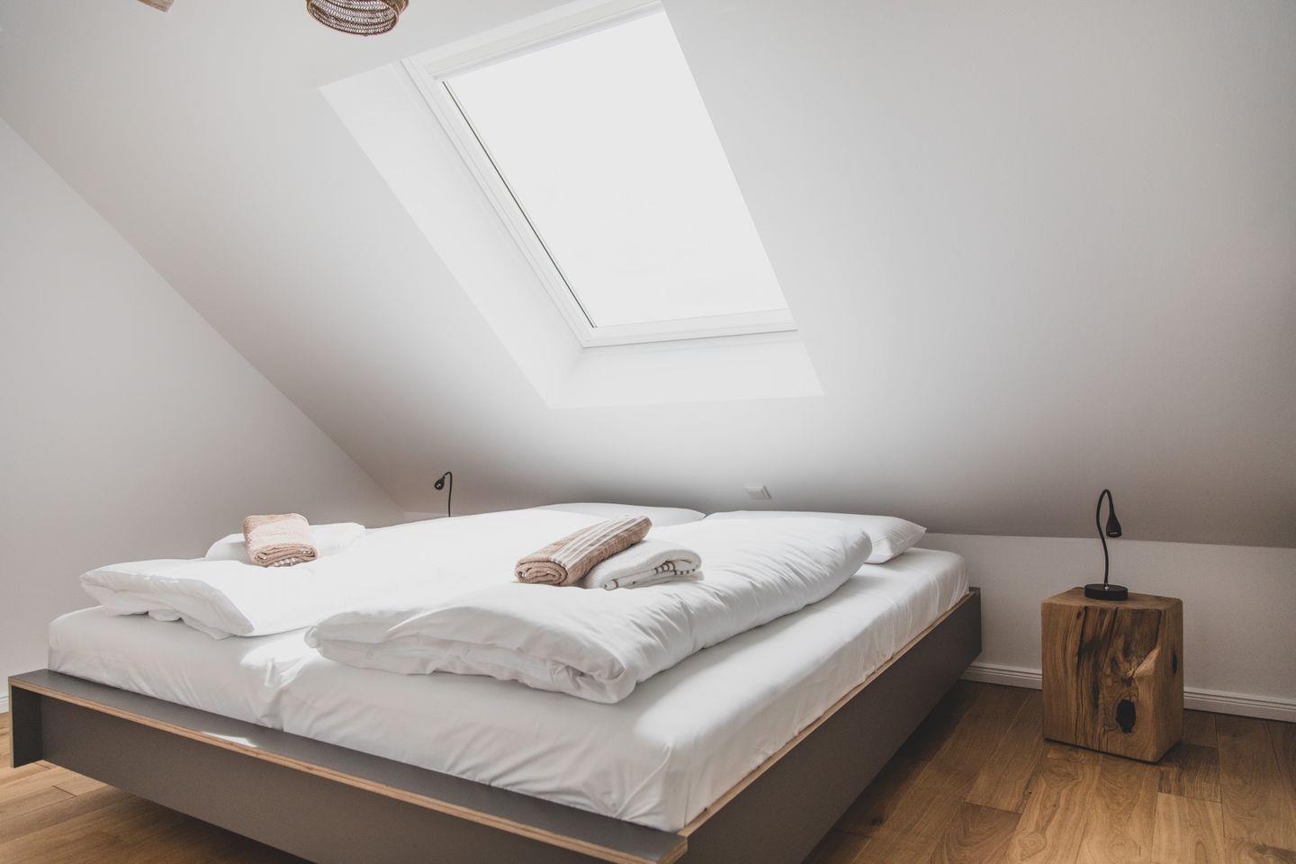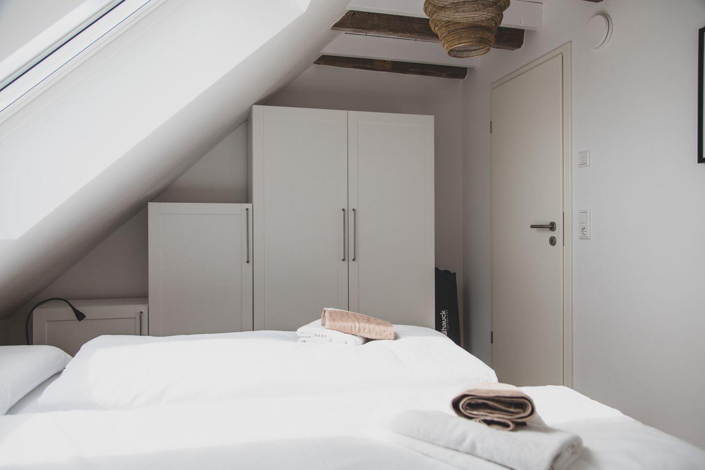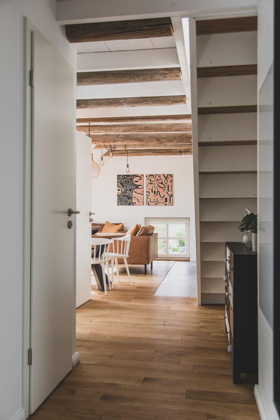 Die Ferienwohnung im zweiten OG erstreckt sich über zwei Etagen und bietet mit einer Größe von 60 m² genügend Platz für bis zu vier Personen. In zwei hellen und gemütlichen Schlafzimmern mit Parkettboden finden Sie den perfekten Rückzugsort nach erlebnisreichen Tagen an der Nordsee. Das Wohnzimmer ist mit einer komfortablen Sofaecke und einem Essbereich ausgestattet, in dem Sie entspannte Abende und gesellige Mahlzeiten genießen können. Die offene Küche ist modern und voll ausgestattet, mit einem Induktionsherd, einem Backofen, einer Spülmaschine und weiteren Annehmlichkeiten. Ob beim Zubereiten eines köstlichen Frühstücks oder beim gemeinsamen Kochen – hier werden kulinarische Momente zu einem besonderen Erlebnis.