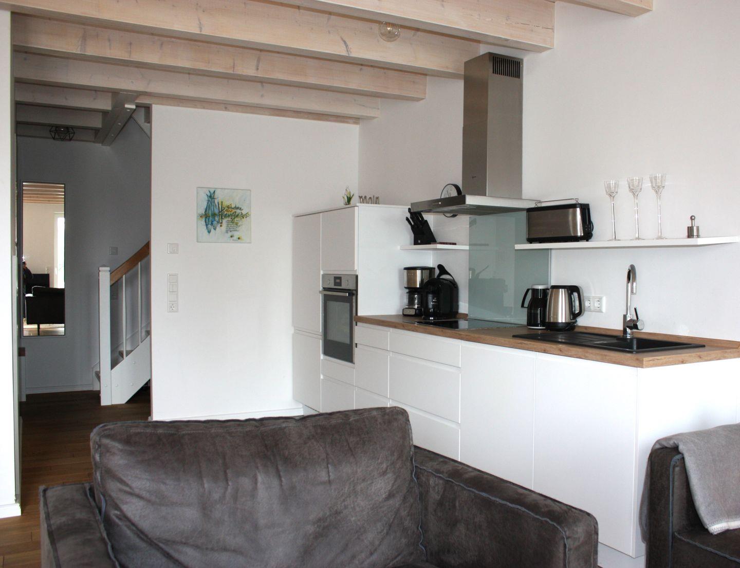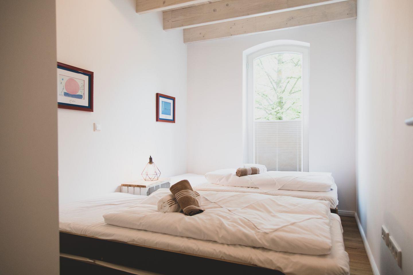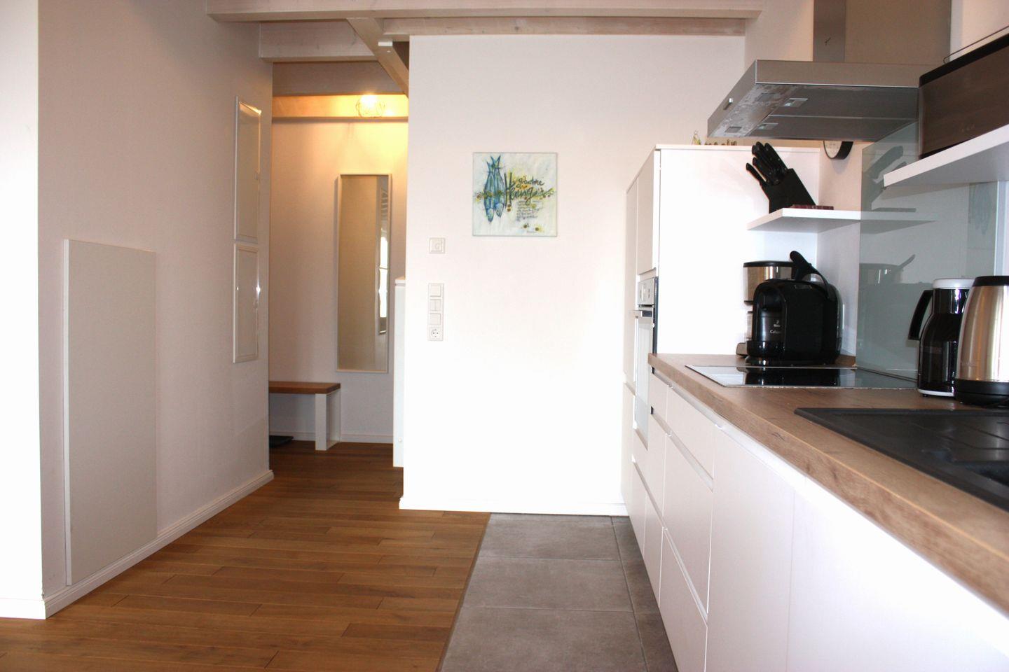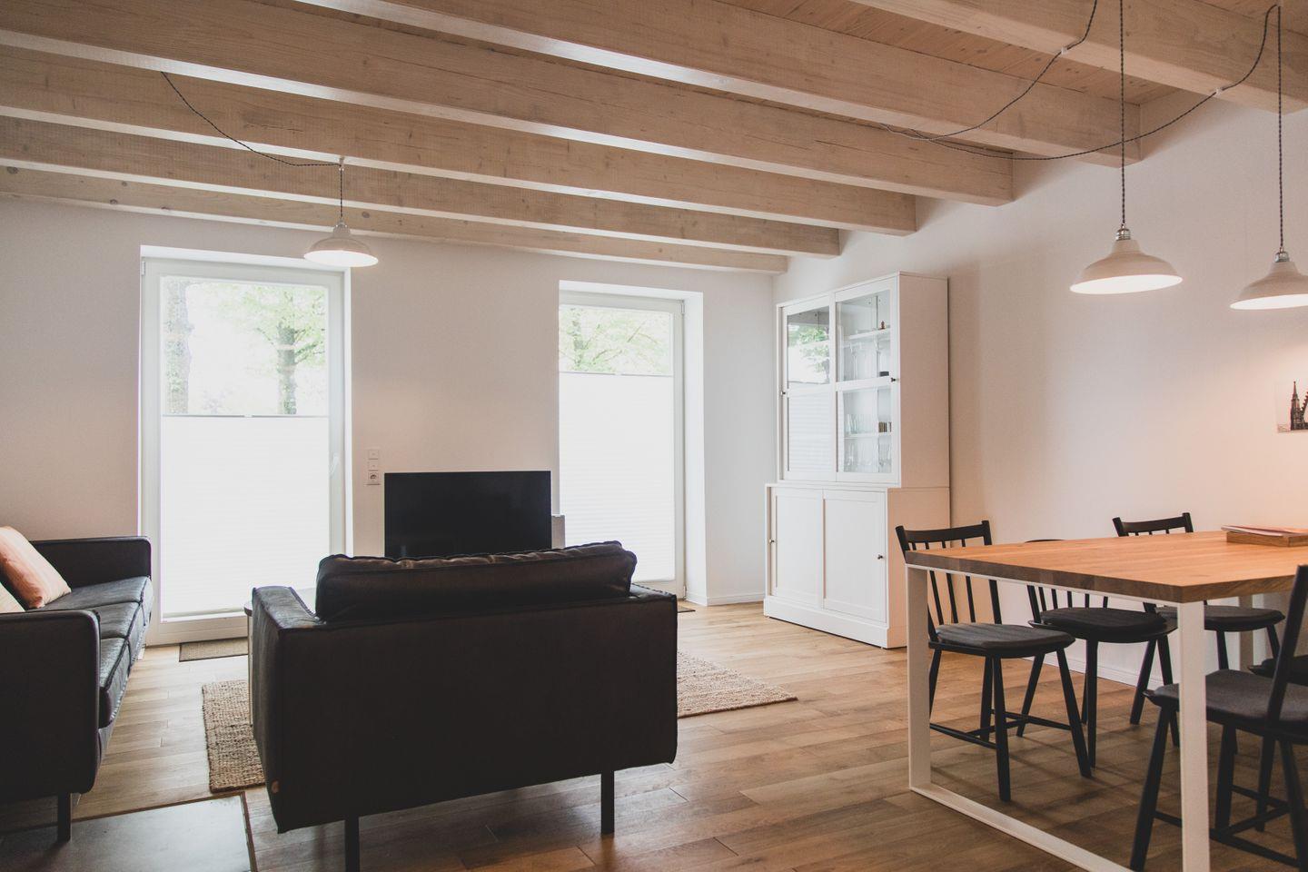 Die großzügige Wohnung erstreckt sich über 87 m² und verfügt über zwei gemütliche Schlafzimmer, die Platz für bis zu sechs Personen bieten – ideal für Familien, Freunde oder romantische Kurzurlaube. Die offene Küchenzeile ist mit modernen Geräten wie einem Induktionsherd, Backofen, Spülmaschine und Kühlschrank ausgestattet, sodass Sie Ihre kulinarischen Fähigkeiten ausleben können. Der angrenzende Essbereich lädt zu geselligen Mahlzeiten ein, während das hell gestaltete Wohnzimmer mit Parkettboden und einer Sofaecke einen angenehmen Ort zum Entspannen bietet. Für Unterhaltung sorgt ein Fernseher, und WLAN ist selbstverständlich auch vorhanden.