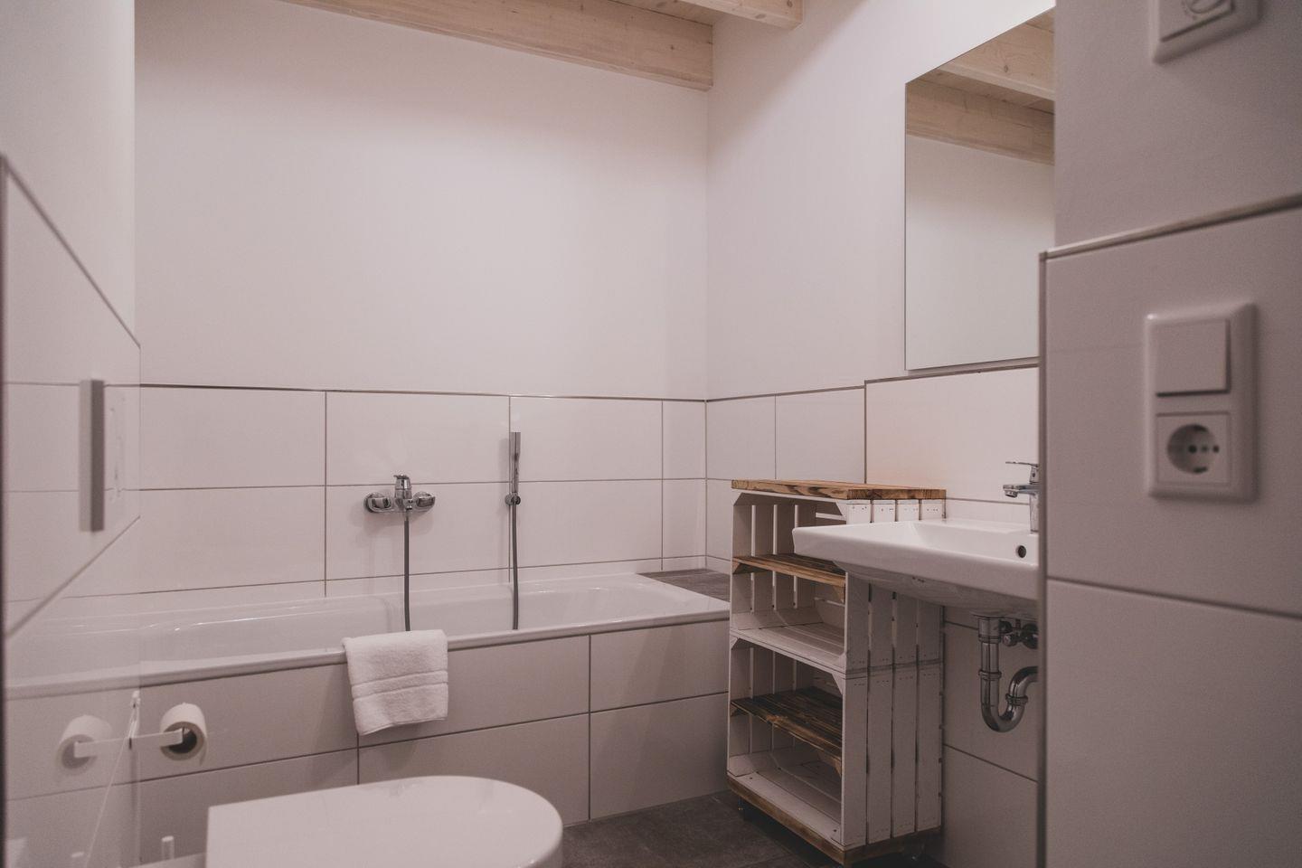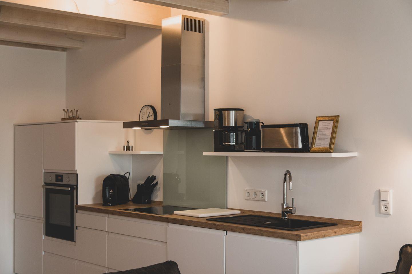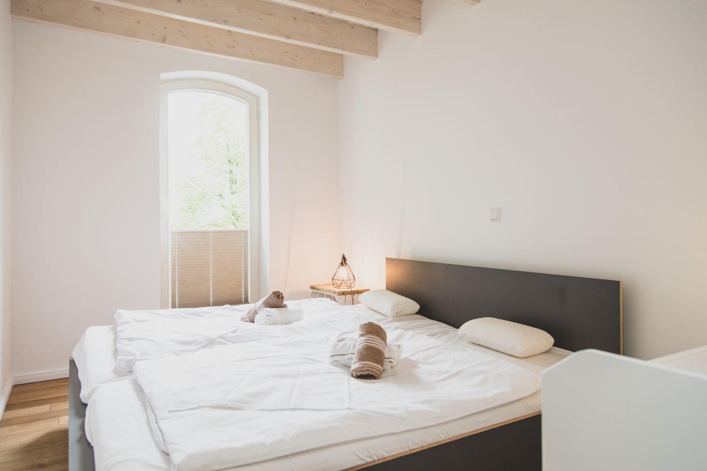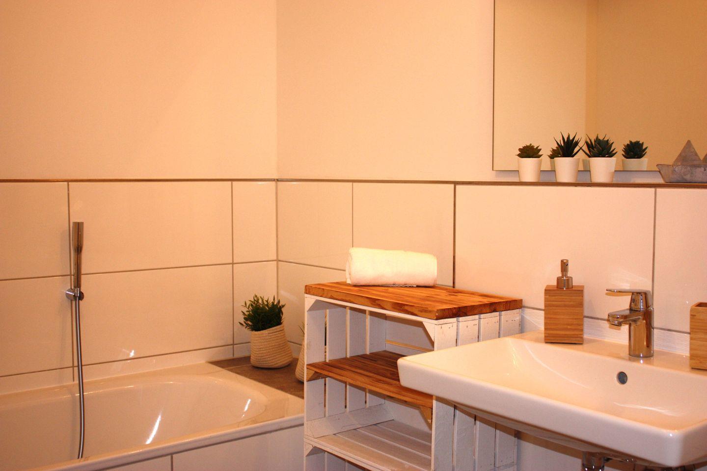 Die großzügige Wohnung erstreckt sich über 87 m² und verfügt über zwei gemütliche Schlafzimmer, die Platz für bis zu sechs Personen bieten – ideal für Familien, Freunde oder romantische Kurzurlaube. Die offene Küchenzeile ist mit modernen Geräten wie einem Induktionsherd, Backofen, Spülmaschine und Kühlschrank ausgestattet, sodass Sie Ihre kulinarischen Fähigkeiten ausleben können. Der angrenzende Essbereich lädt zu geselligen Mahlzeiten ein, während das hell gestaltete Wohnzimmer mit Parkettboden und einer Sofaecke einen angenehmen Ort zum Entspannen bietet. Für Unterhaltung sorgt ein Fernseher, und WLAN ist selbstverständlich auch vorhanden.