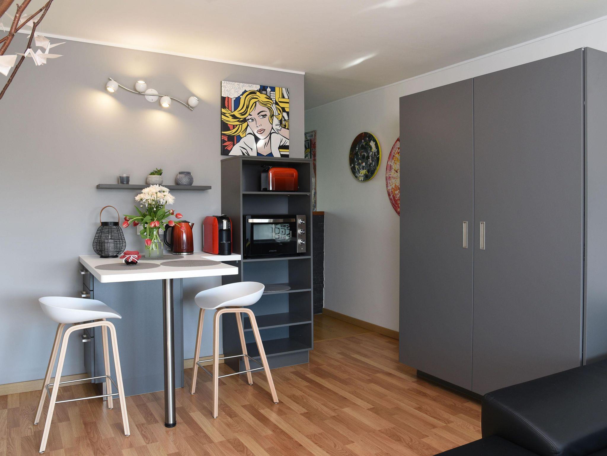 Die künstlerisch gestaltete Ferienwohnung mit gemütlichem Wohnzimmer und integrierter Küche bietet Ihnen exklusiven Wohnkomfort und eine besondere Auszeit. Das Badezimmer mit Wasserfall - Dusche macht Ihr Ferien - Zuhause zu einer regelrechten Wellnessoase. Im Garten befindet sich ein großzügiger Grillplatz mit Kräuterbeet und Terrasse. Zum Relaxen stehen Ihnen Sonnenliegen und Gartenmöbel zur Verfügung.