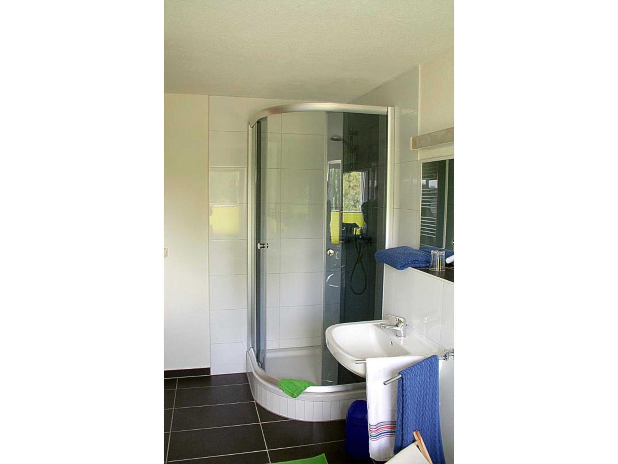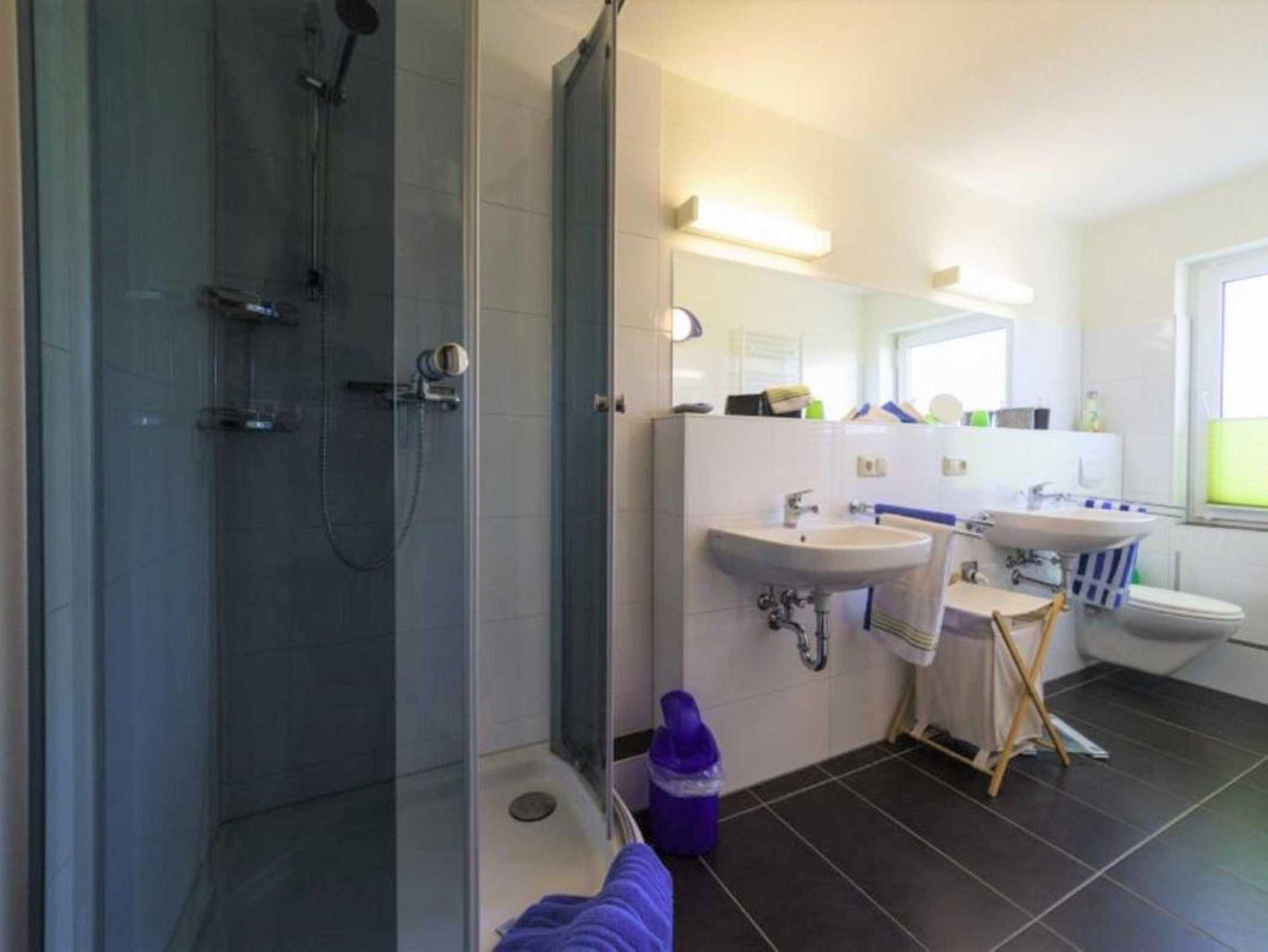 Das großzügige Bad verfügt über eine Badewanne mit Duschabgrenzung, WC und einem Haarföhn sowie zwei Waschbecken.