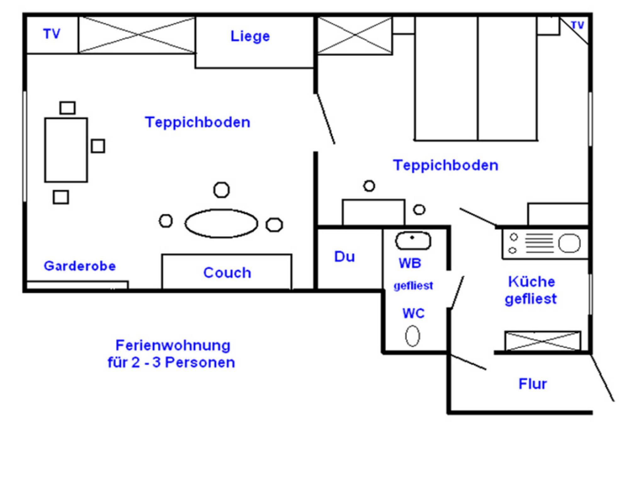 1 Schlafzimmer, 1 komb. Wohn- und Schlafzimmer, Küche, Du/WC, Sat-TV/Radio, Grill, Parterre, sep. Eingang, Einkaufsmöglichkeiten, Gaststätten und Bäcker 2 min., Bettwäsche und Handtücher pro Person 12,00 Euro oder selbst mitbringen, Nichtraucherwohnung, Parkplatz vor dem Haus, Garage mietbar,
