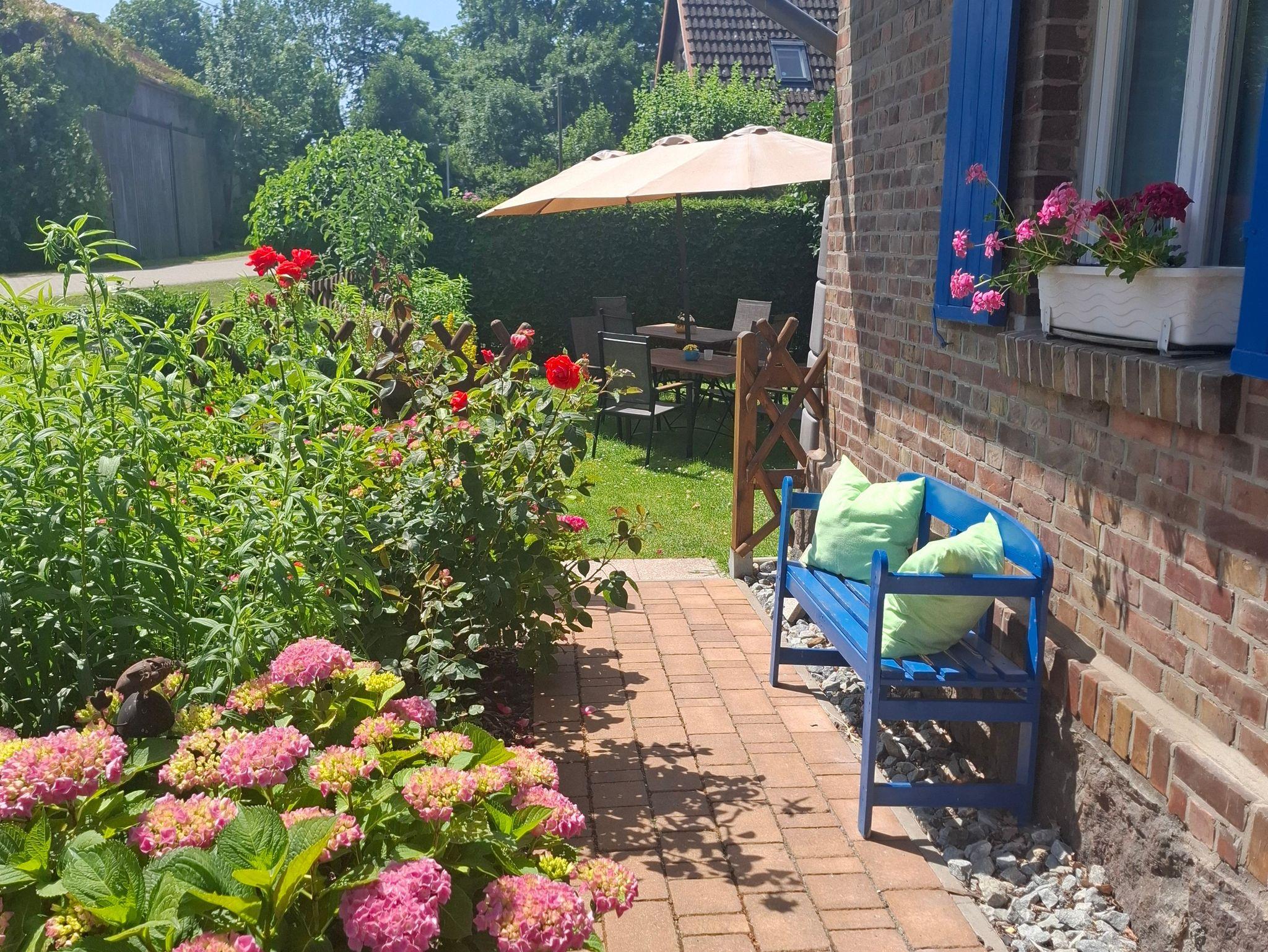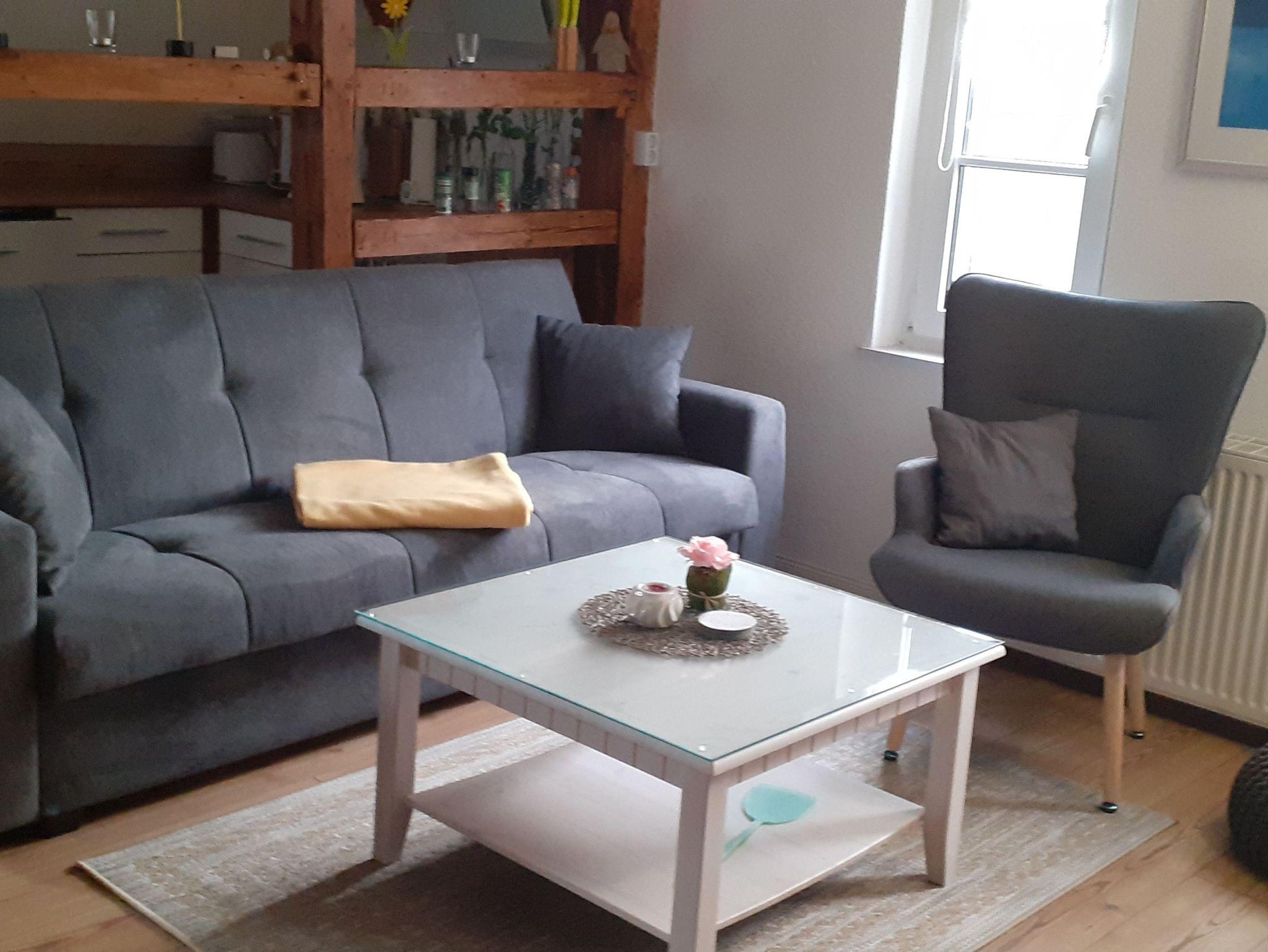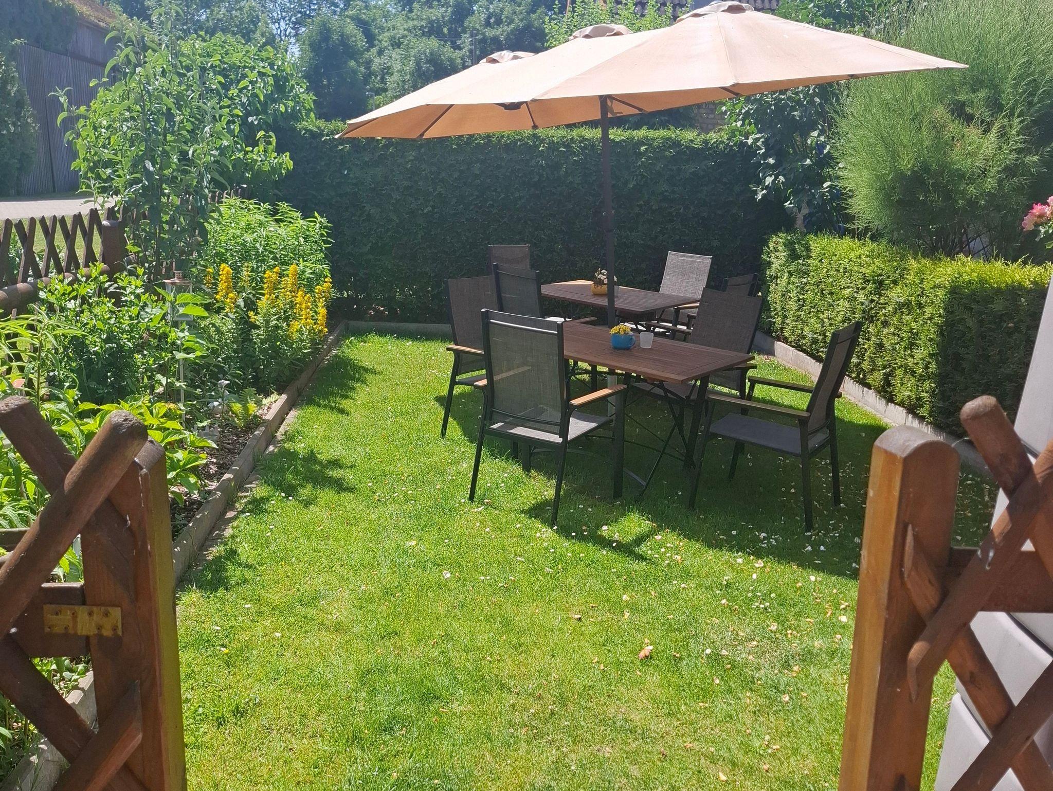 Die Ferienwohnung bietet Platz für 5 Pers. Das Auto kann direkt am Haus geparkt werden, eine gemütliche Sitzecke mit Grillmöglichkeit befindet sich im Garten. Die Wohnung ist mit einem goßem Wohnzimmer mit