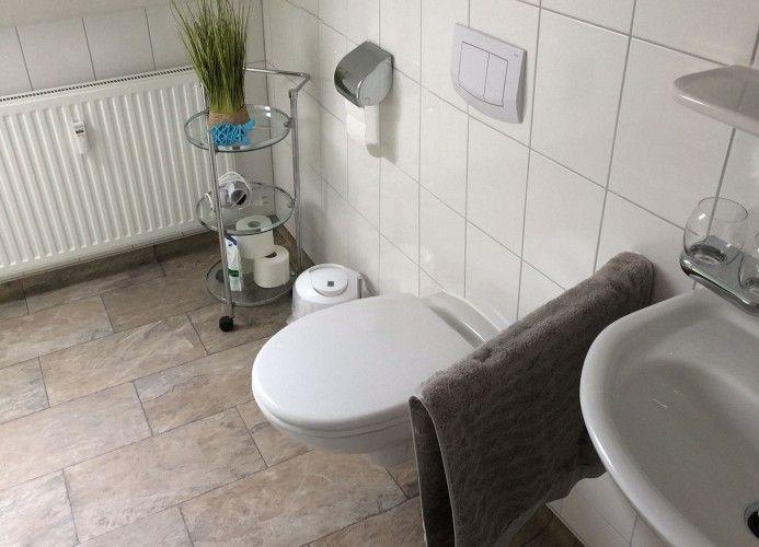 Das Badezimmer ist modern und funktional eingerichtet, mit einer Dusche, einem WC und Wasserspardüsen, die umweltbewussten Komfort bieten.