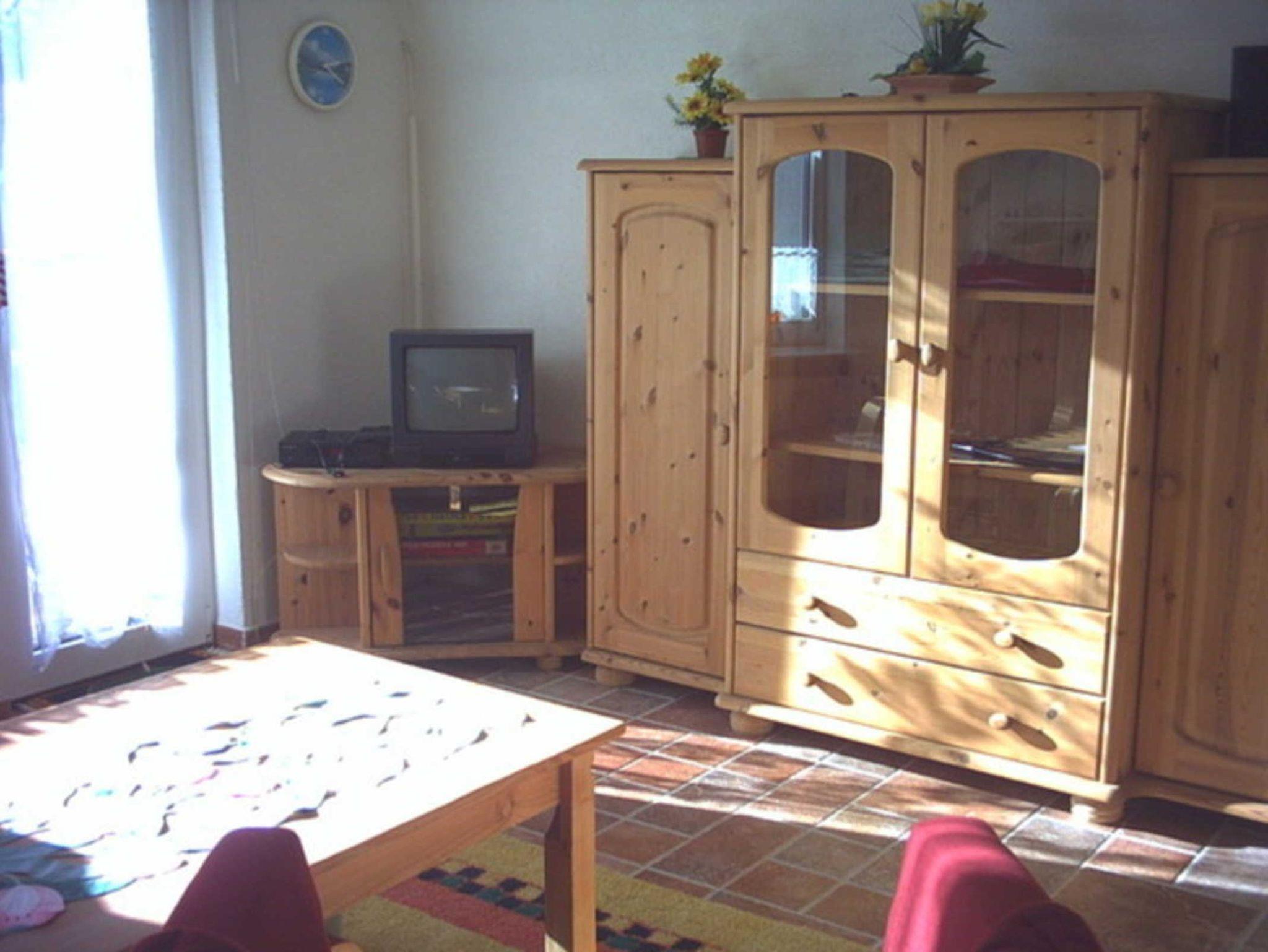 • einen Wohnraum mit Fernseher und anliegender Küche
