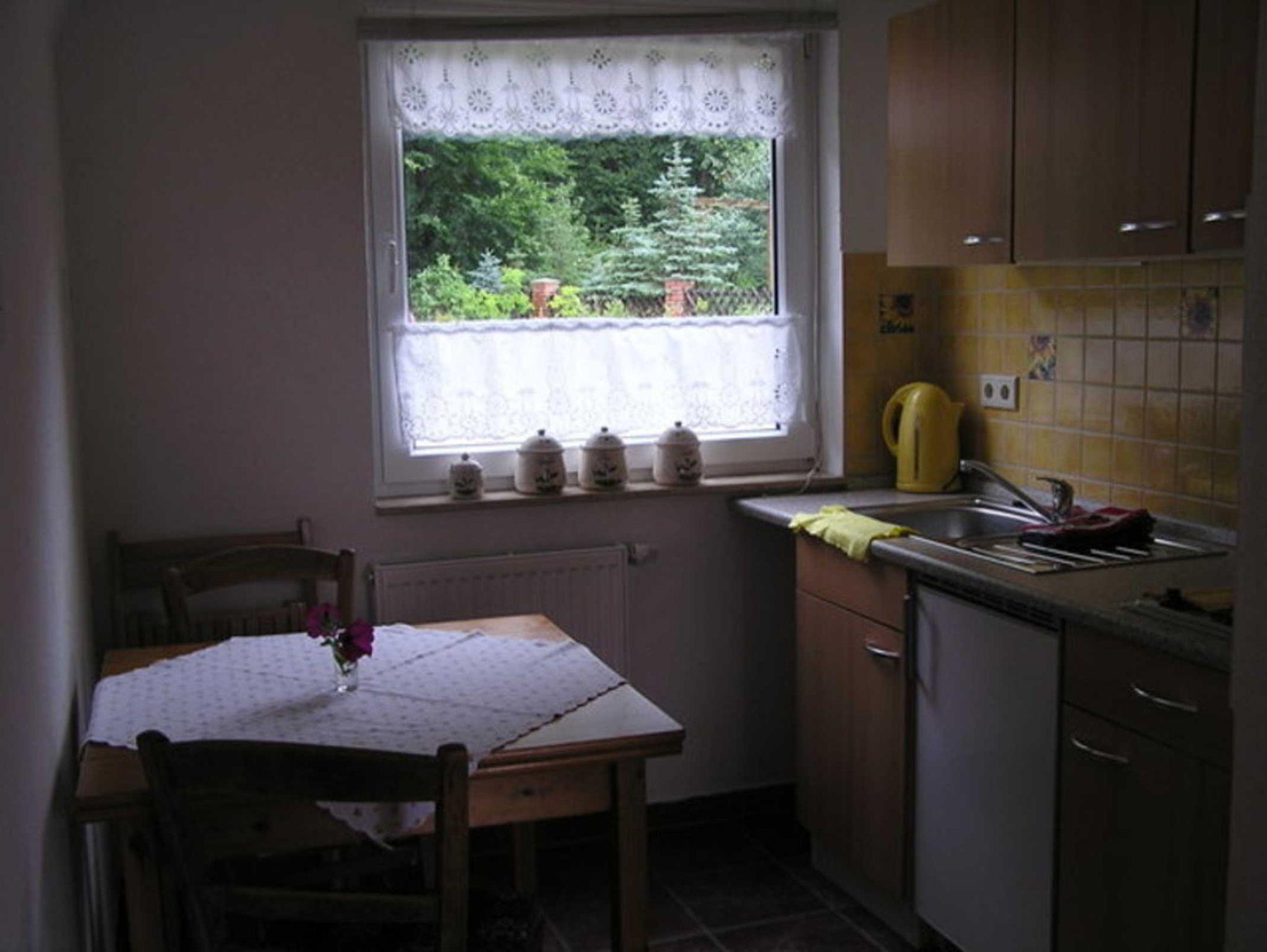 Ausstattung Küche: Mikrowelle, 2 Kochplatten, Kühlschrank, Wasserkocher, Eierkocher, Toaster, Kaffeemaschine.