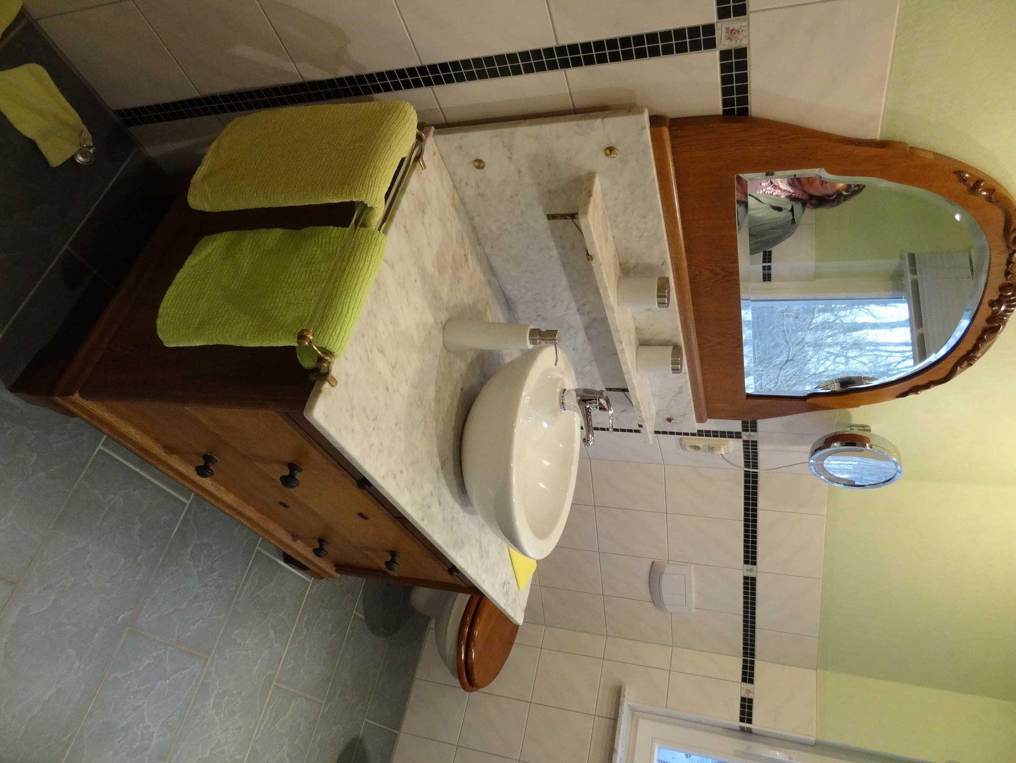Starten Sie jeden Morgen frisch und fit in den neuen Tag. In diesem Badezimmer ein Vergnügen. Antikes Mobiliar aus edlen Hölzern, restauriert, fügt sich harmonisch in das freundliche Ambiente des hellen Raumes und sorgt für eine unverwechselbare Ästhetik und die hochwertige moderne Ausstattung garantiert Ihnen Komfort.