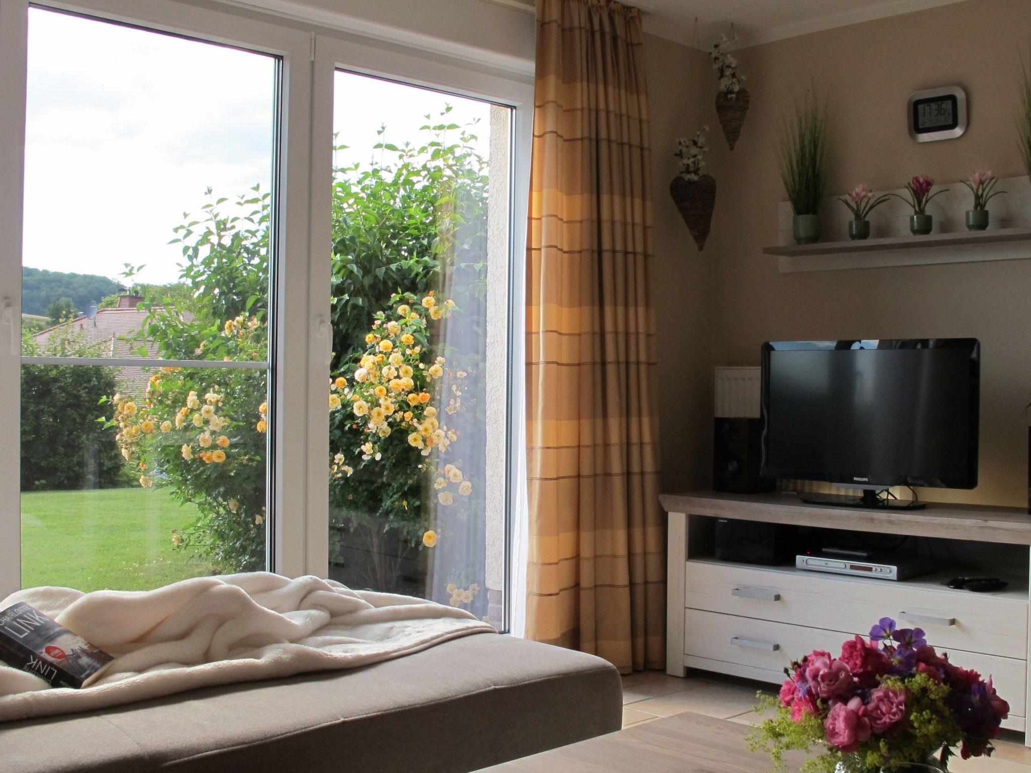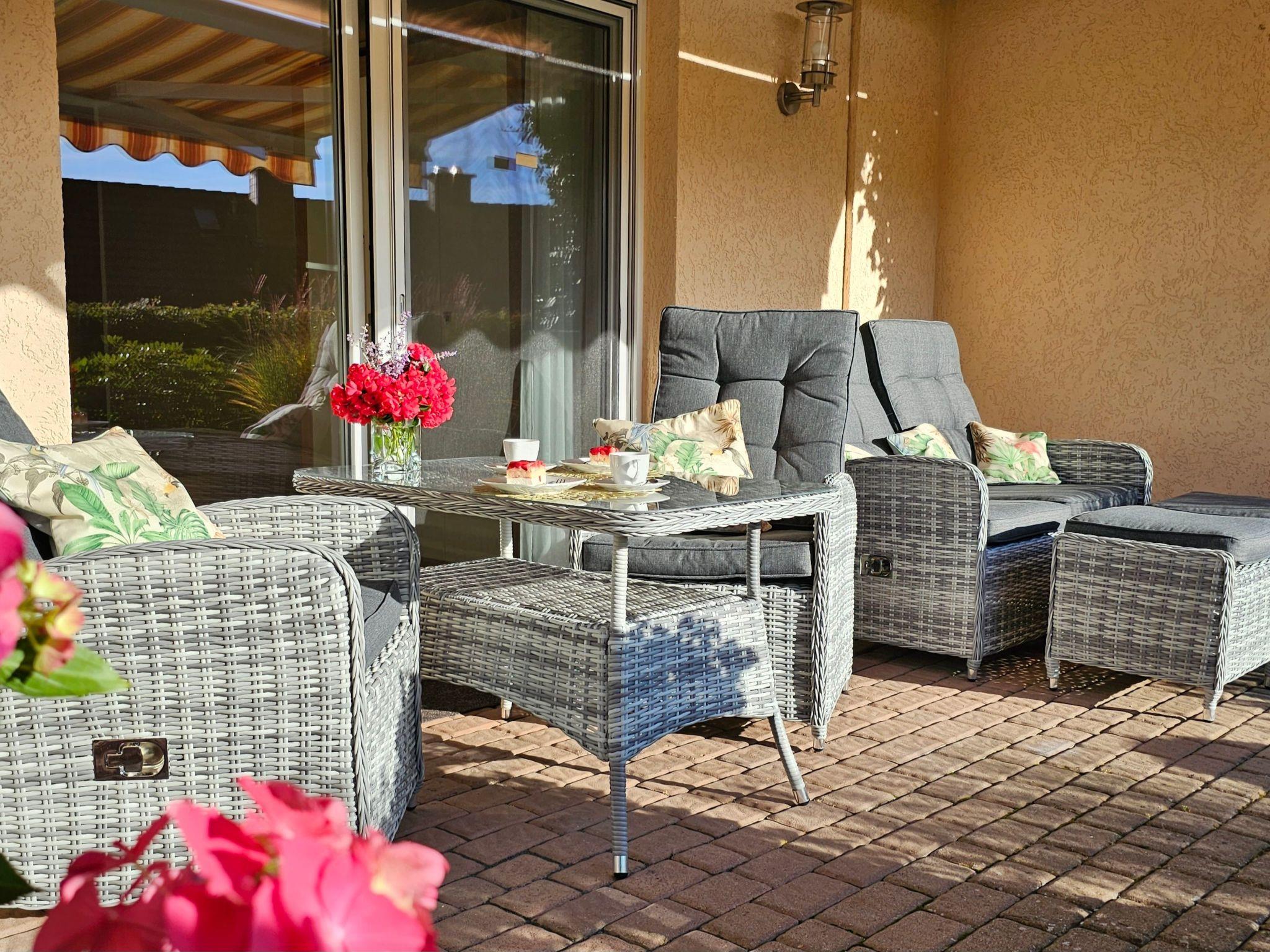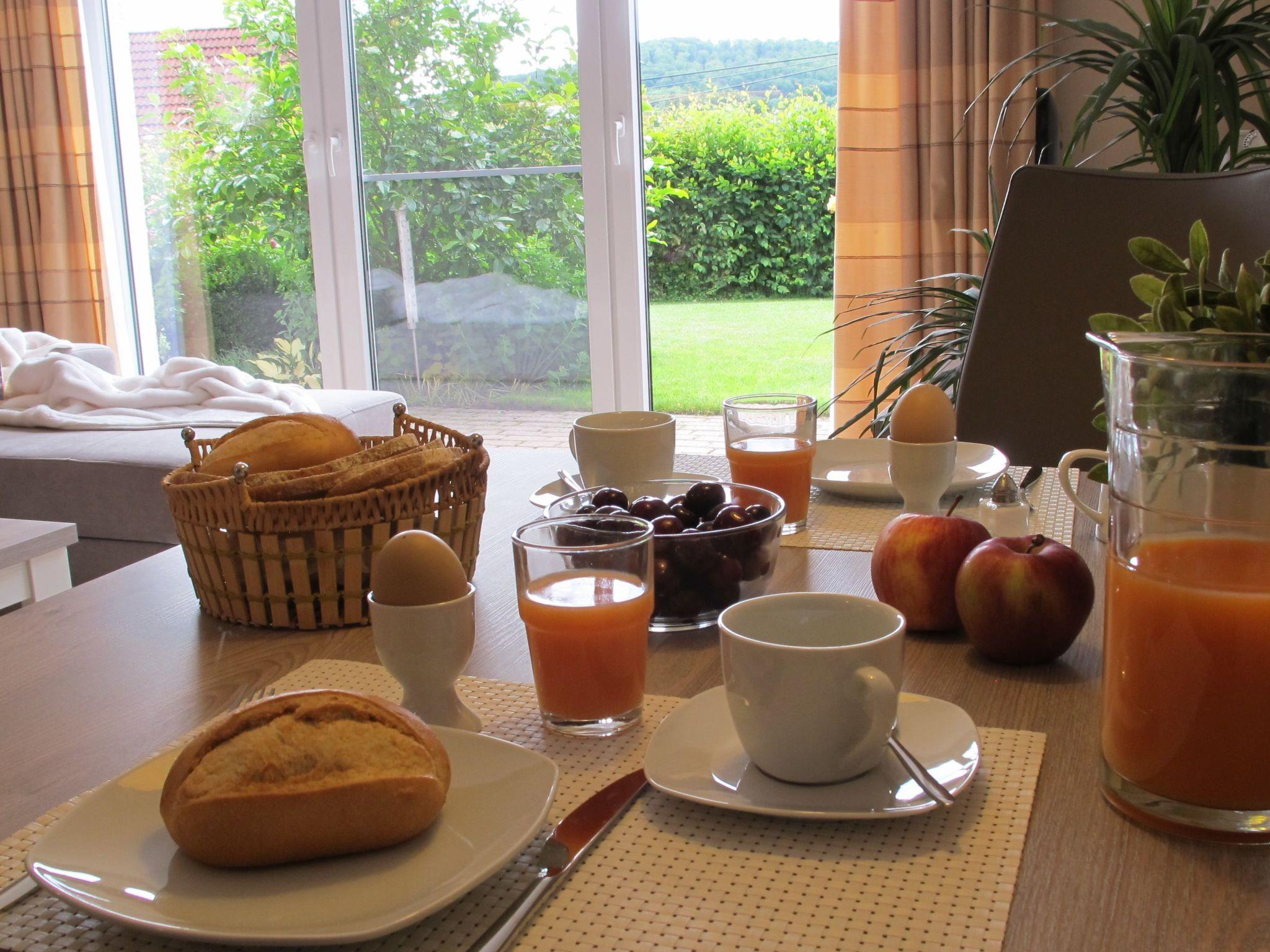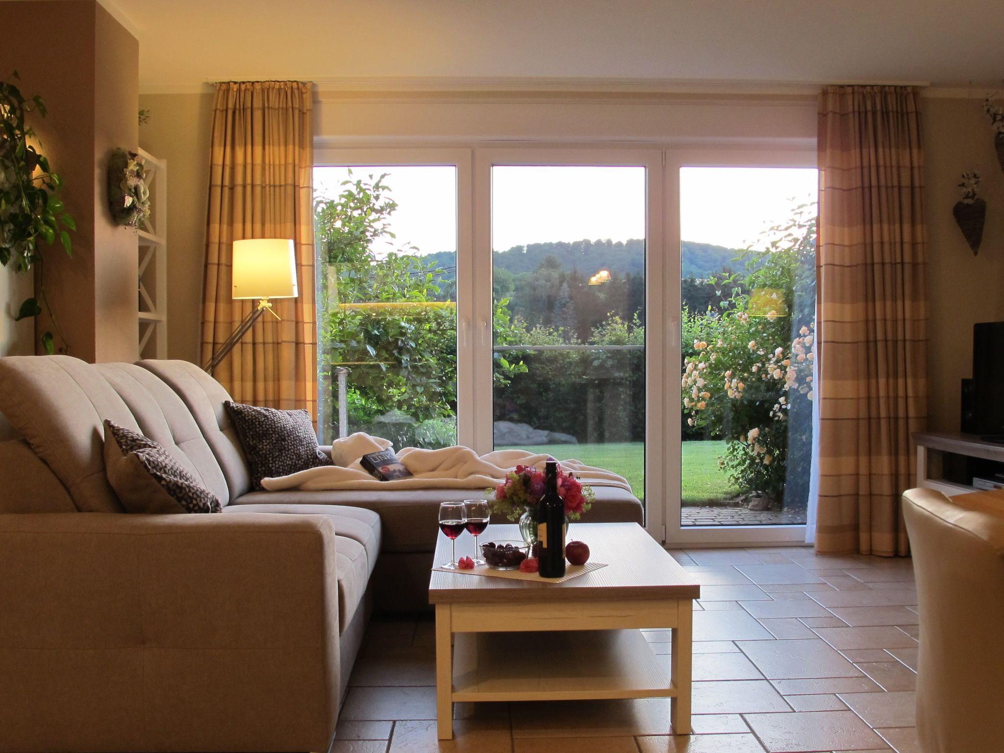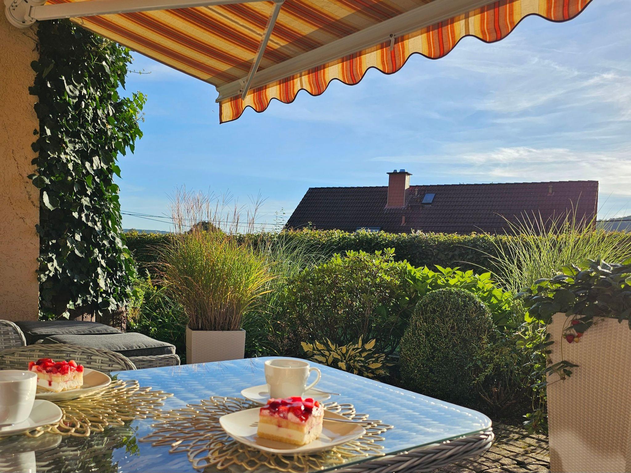 The outdoor area invites you to relax with its sheltered and partially covered west-facing terrace - surrounded by our lovingly tended garden and views of the hilly landscape. Enjoy the lush floral splendour in summer, snack on tomatoes, strawberries and herbs depending on the season or end the day with spectacular sunsets. An electric barbecue is available for outdoor culinary delights.