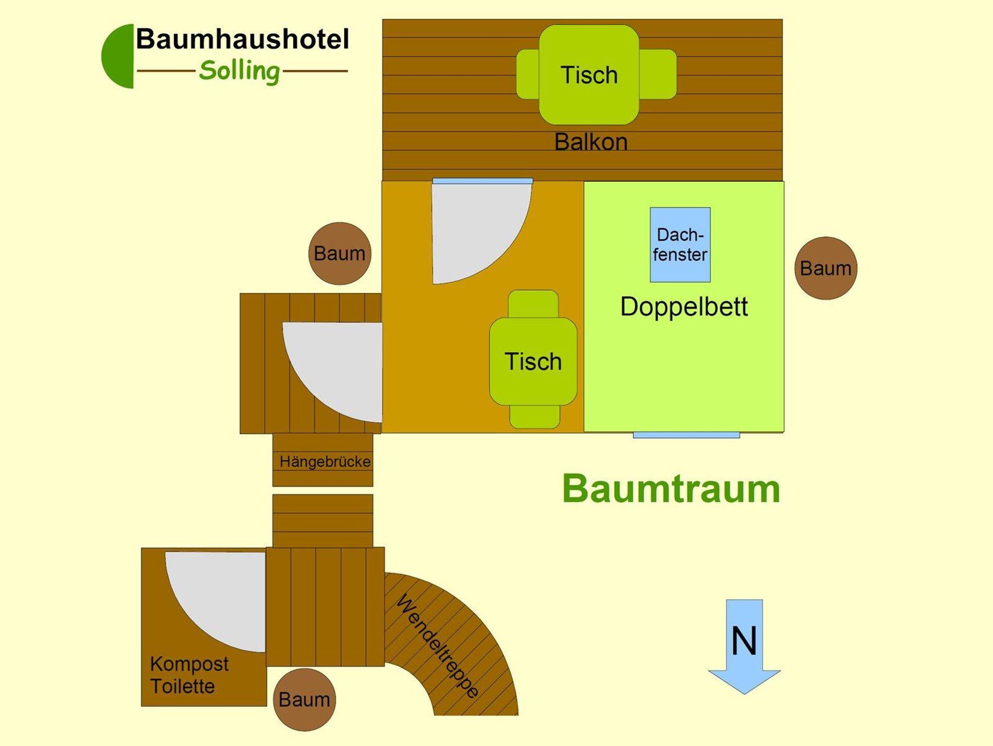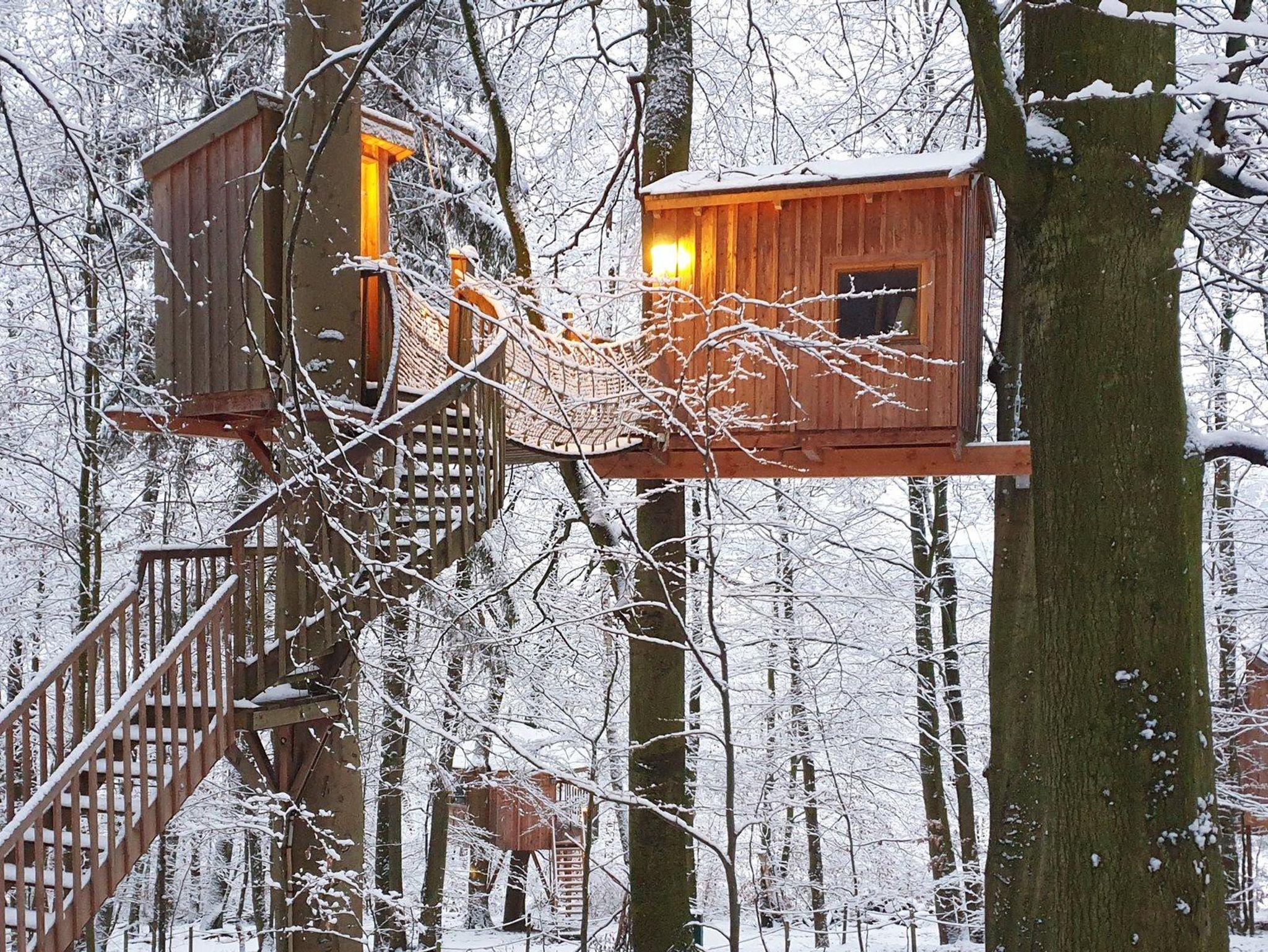 Der Zugang zum Baumhaus erfolgt anfänglich über eine Wendeltreppe, daran schließt sich eine Hängebrücke an, die bis zum Baumtraum führt. Dieses Baumhaus für zwei Personen ist nur für schwindelfreie Gäste geeignet. Bei Wind knarzt das Baumhaus Baumtraum deutlich hörbar. Abenteuer und Romantik pur in sieben Meter Höhe.