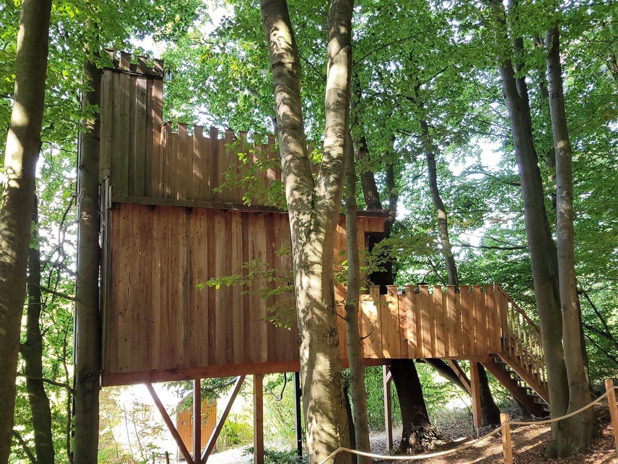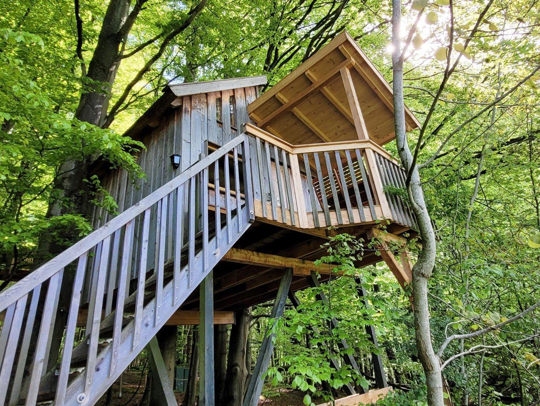 Das etwas andere Baumhaus. Komplett ohne Stützpfeiler, nur gehalten von Stahlseilen, hängt das Baumhaus zwischen zwei mächtigen Buchen.