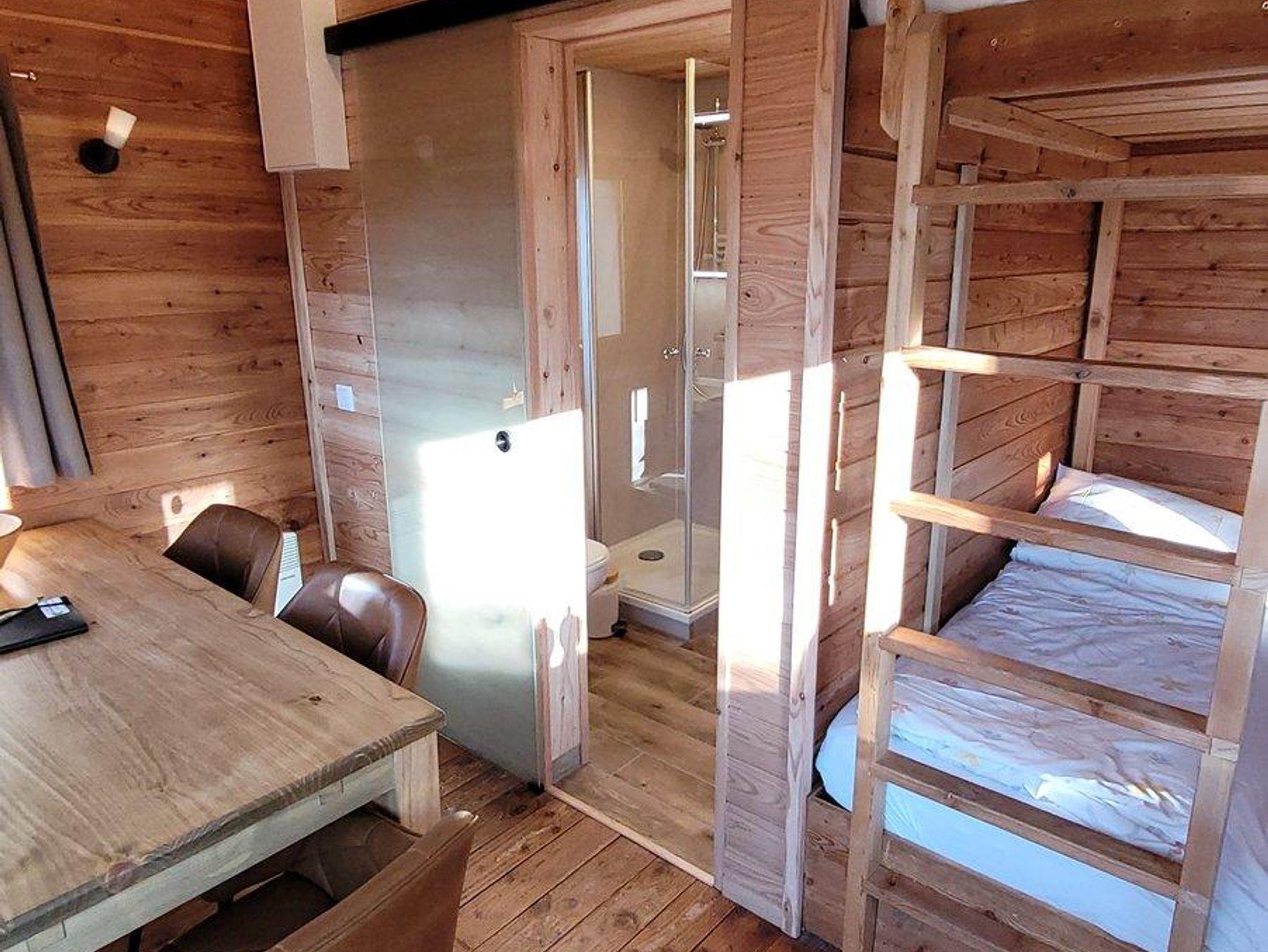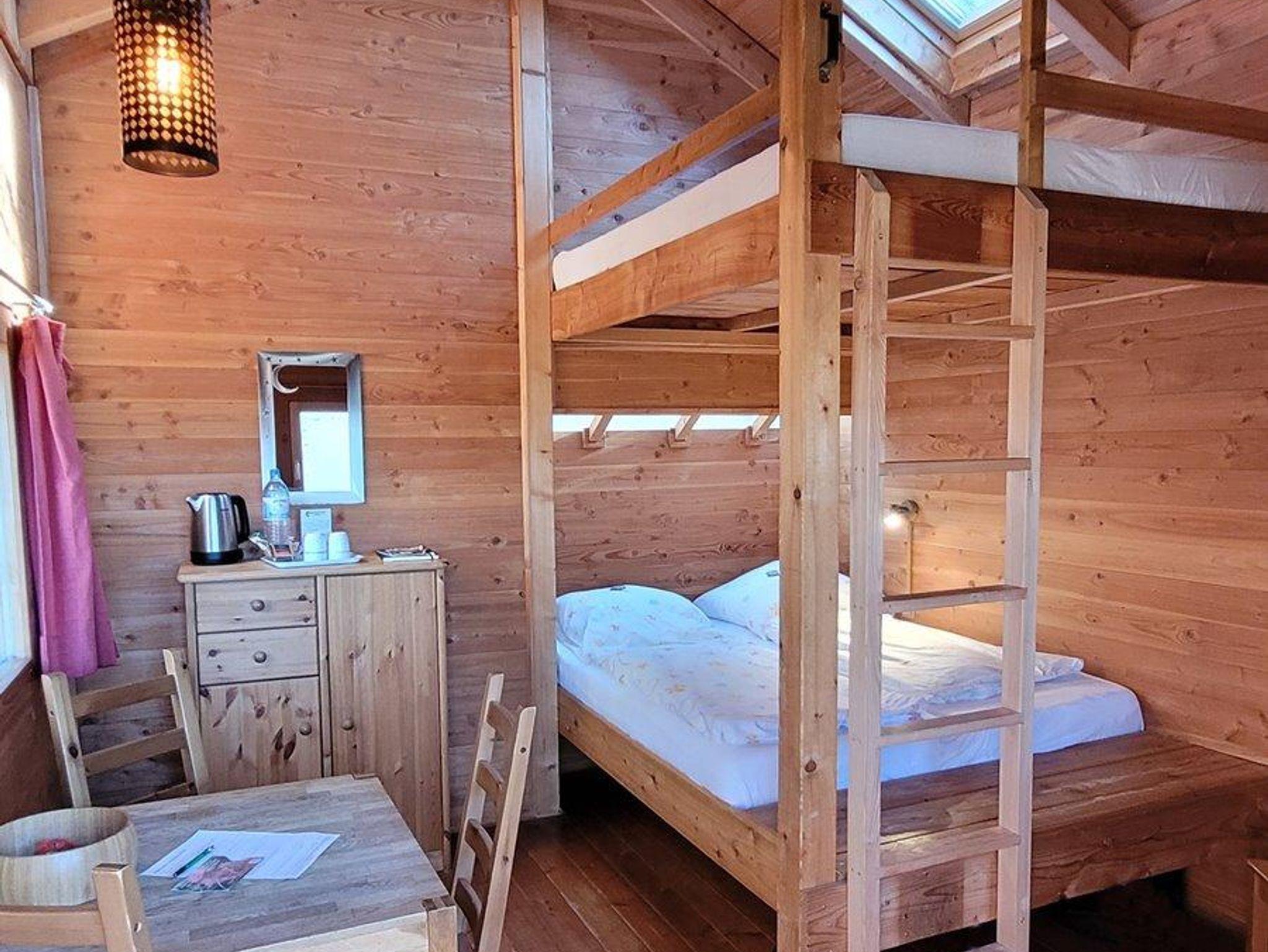 Genug Platz für die größere Familie oder den Freundeskreis. Aber auch für Pärchen ist dieses Baumhaus bestenes geeignet. Insgesamt stehen hier fünf Schlafplätze zur Verfügung: zwei Doppelbetten übereinander und ein Hochbett. Die oben liegenden Betten erklimmt man über eine Holzleiter, der Abendsport ist also garantiert.