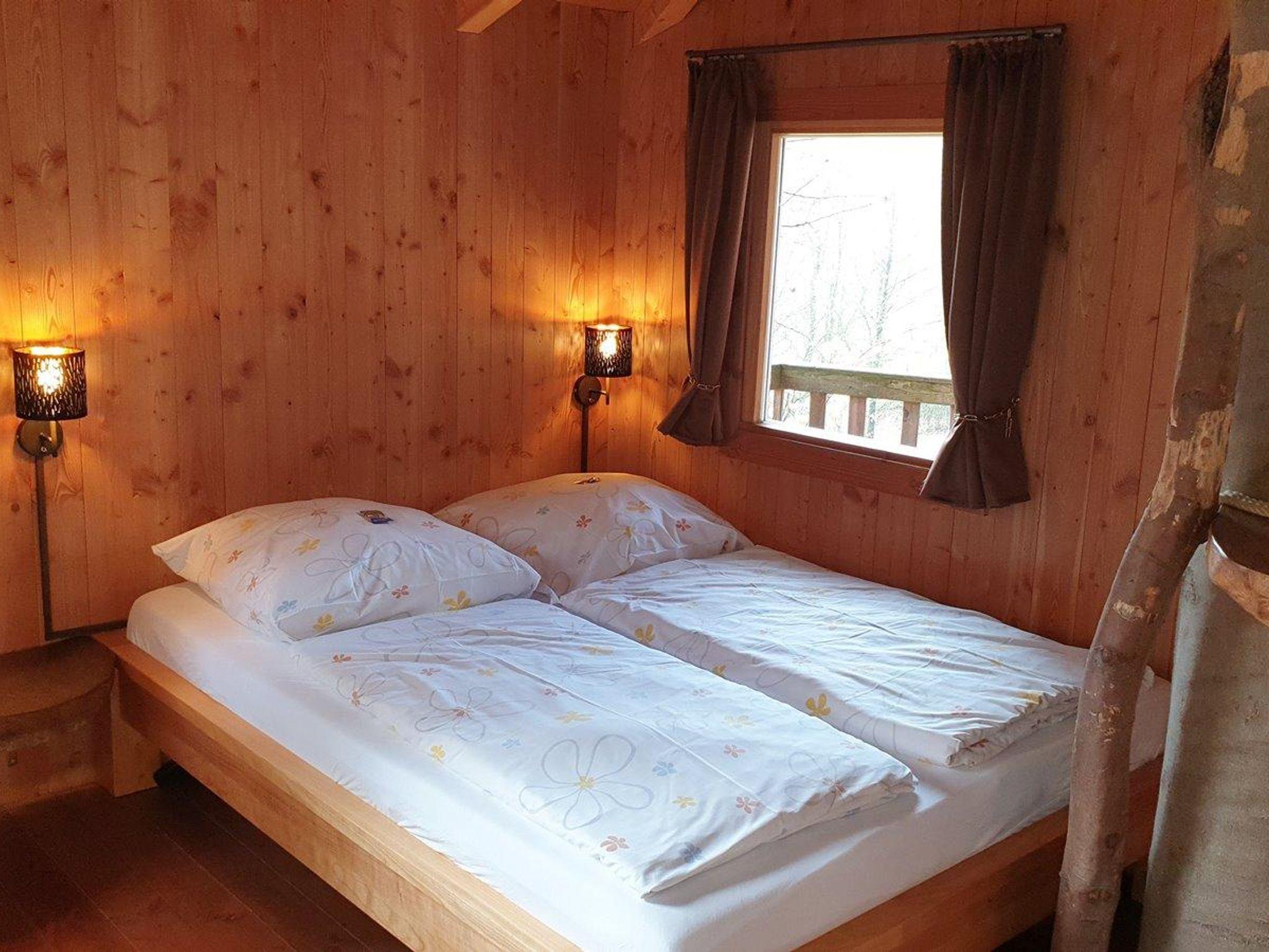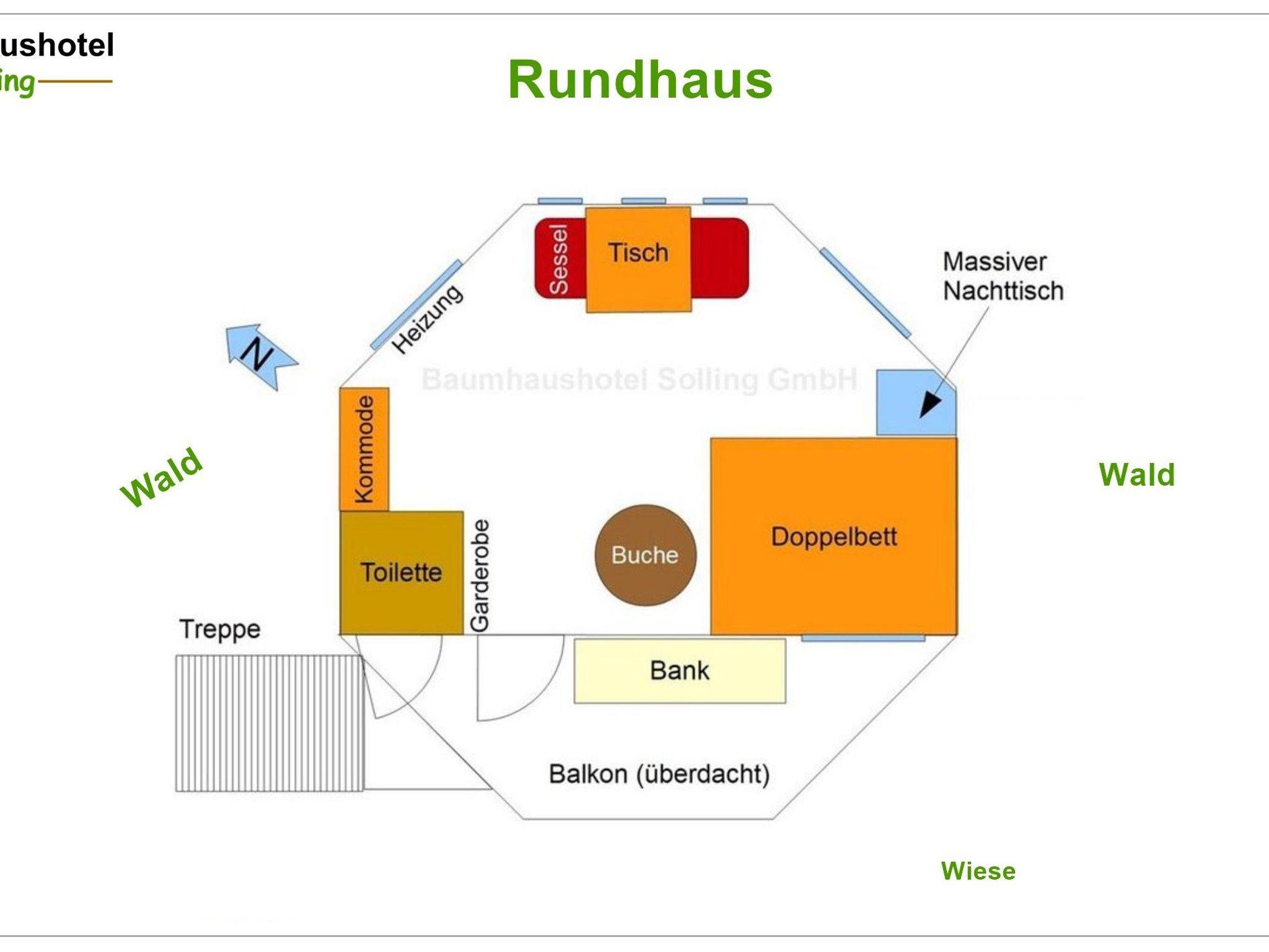 Nach der Umgestaltung hat das Baumhaus Rundhaus zwei Schlafplätze (+ Babybett). Ein Hauch Luxus versprüht das neue Rundhaus; Bett Tisch und Kommode sind aus europäischen Kirschholz gefertigt, zum gemütlichen Sitzen stehen zwei Ohrensessel bereit. Hochwertige Matratzen und Lattenroste sorgen für einen angenehmen Schlaf.