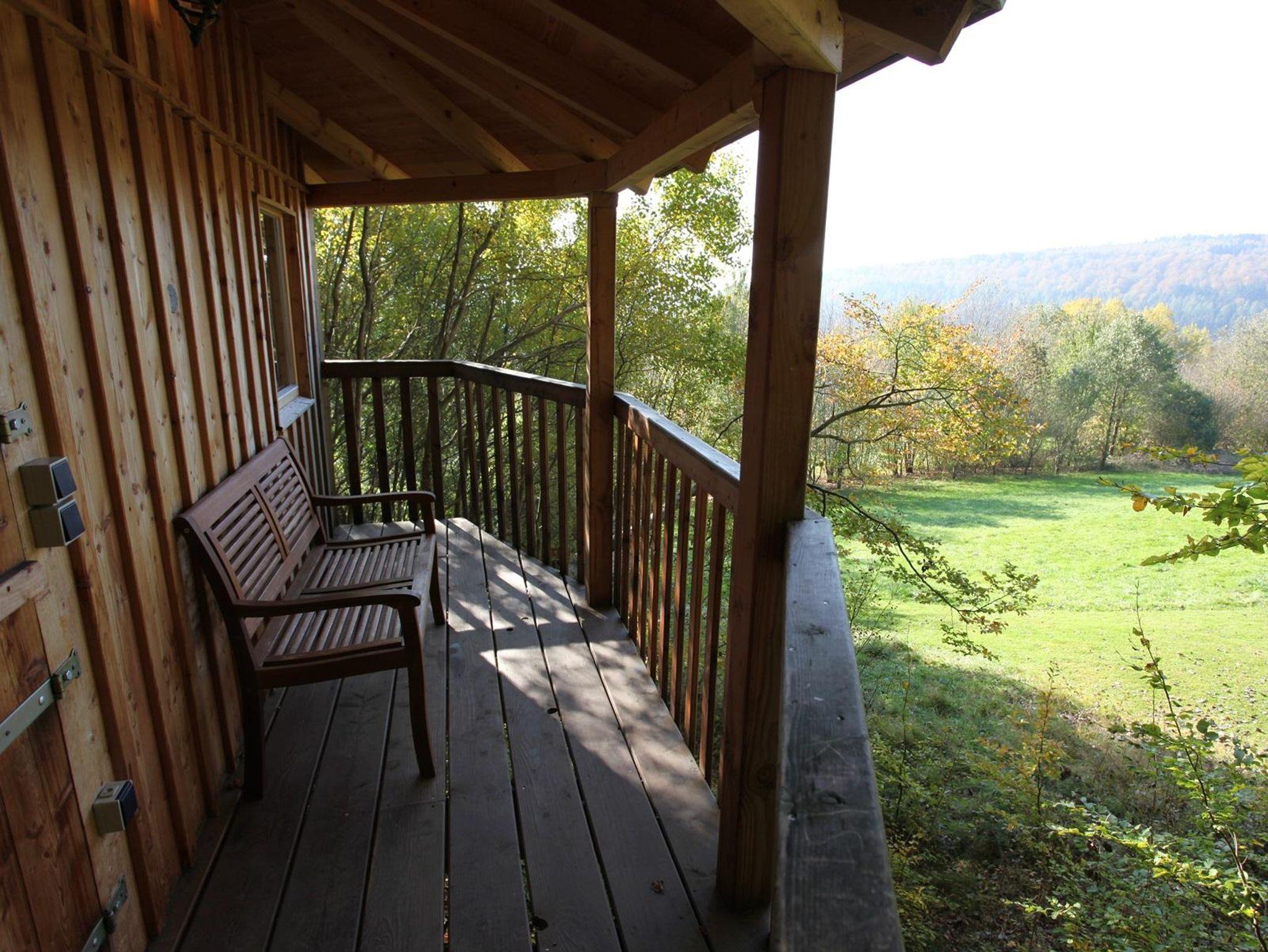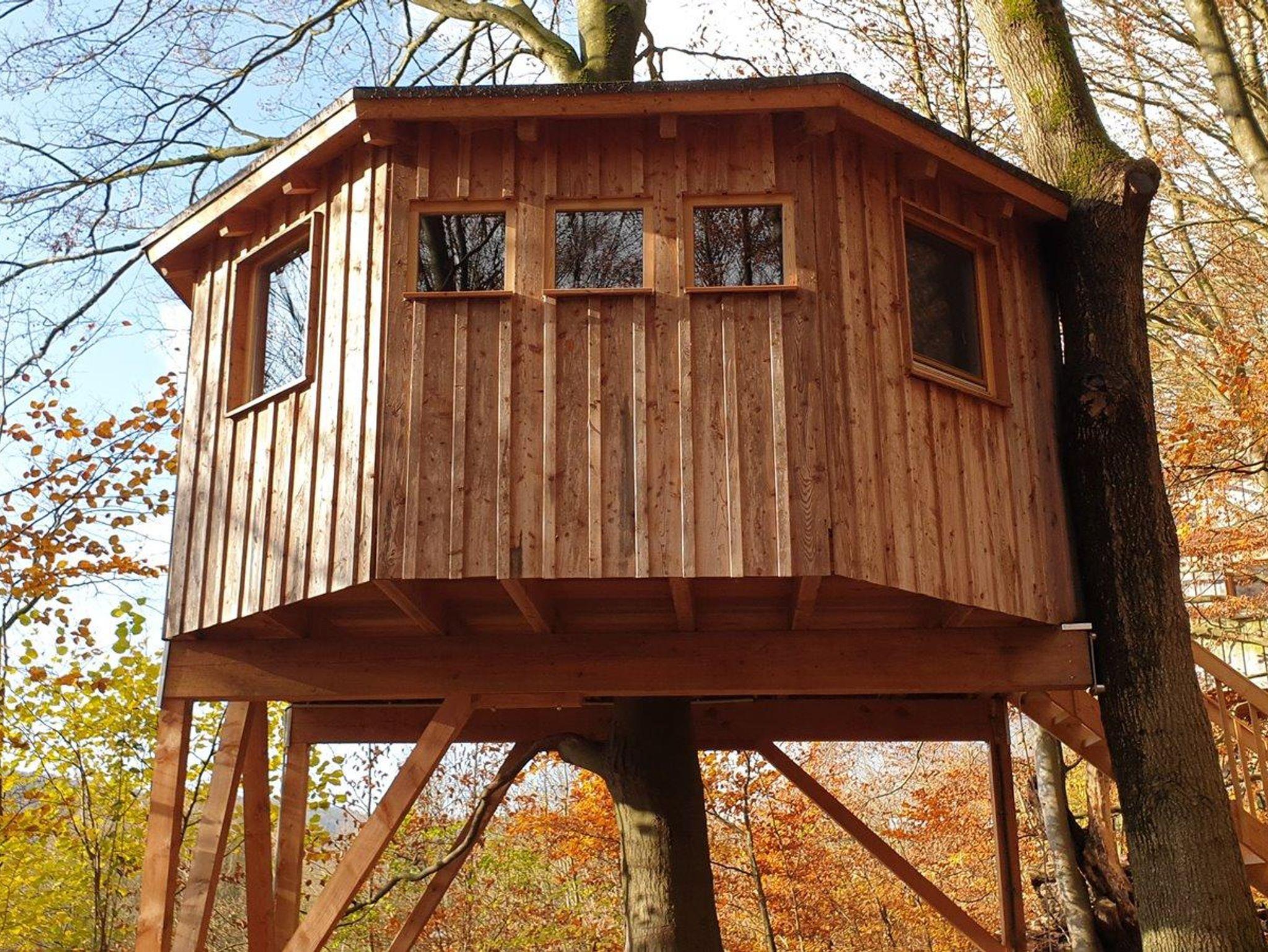Eine (echte) Buche geht mitten durch dieses Baumhaus. Vom Fußboden bis zum Kegeldach. Die großzügige, voll überdachte Loggia des Baumhauses lädt zum Verweilen ein.
