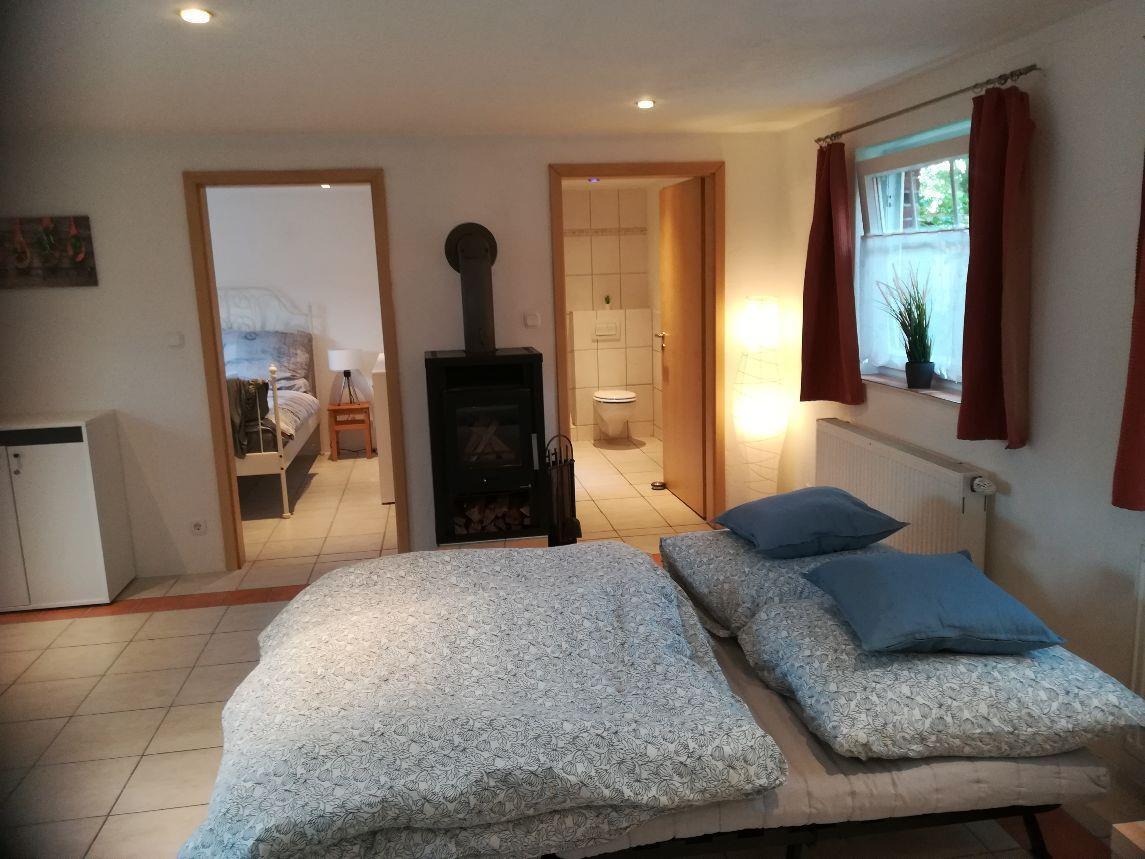 Kombiniertes Wohn- und Esszimmer: Der Kaminofen sorgt für behagliche Wärme und eine gemütliche Atmosphäre, während das Schlafsofa zusätzlichen Schlafkomfort bietet.
