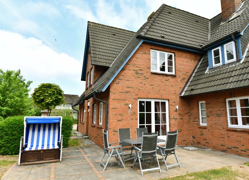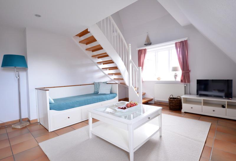 Das Haus Austernfischer mit Südterrasse und Gartenanteil geht über zwei Etagen: Wohnen, Essen und Kochen im Erdgeschoss, ein Schlafzimmer im EG, weitere Schlafzimmer im Obergeschoss, in der Galerie und im Souterrain. Zwei Bäder und eine Sauna sind im Haus.