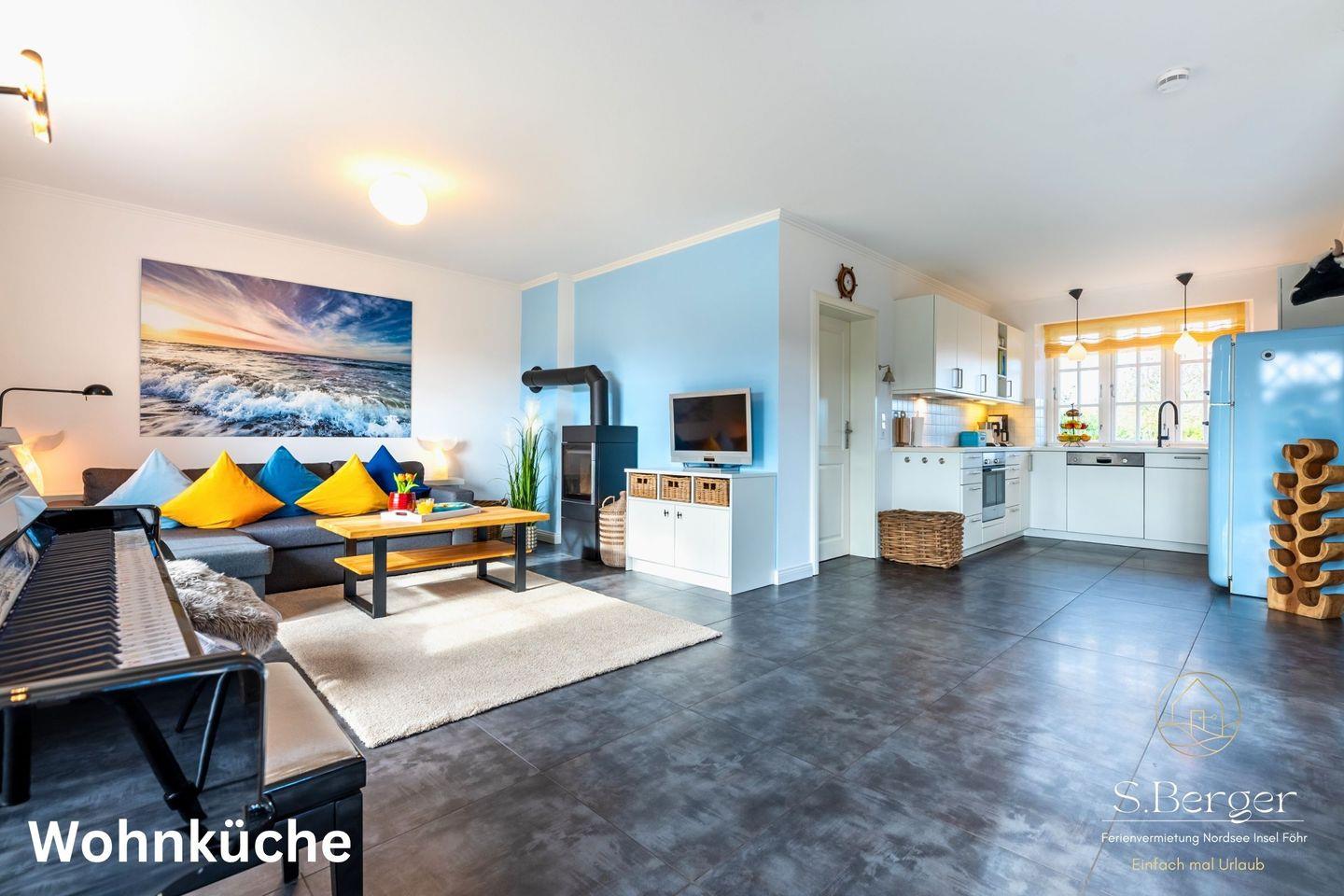 Die moderne Wohnküche strahlt eine einladende Atmosphäre aus, ideal für gesellige Abende mit Familie und Freunden. Der Kamin verbreitet wohlige Wärme, während das Klavier musikalische Momente ermöglicht. Die Sofaecke lädt zum Entspannen ein, und durch die große Terrassentür flutet Tageslicht in den Raum. Hier kommen Komfort und Gemütlichkeit zusammen, um Ihren Aufenthalt unvergesslich zu machen. Alle Annehmlichkeiten sind vorhanden, um Ihnen den bestmöglichen Urlaub zu bieten. Genießen Sie die Freiheit, sich in Ihrem eigenen Tempo zu bewegen und den Alltag hinter sich zu lassen. Ein Duschbad mit WC ist hier ebenfalls vorhanden.