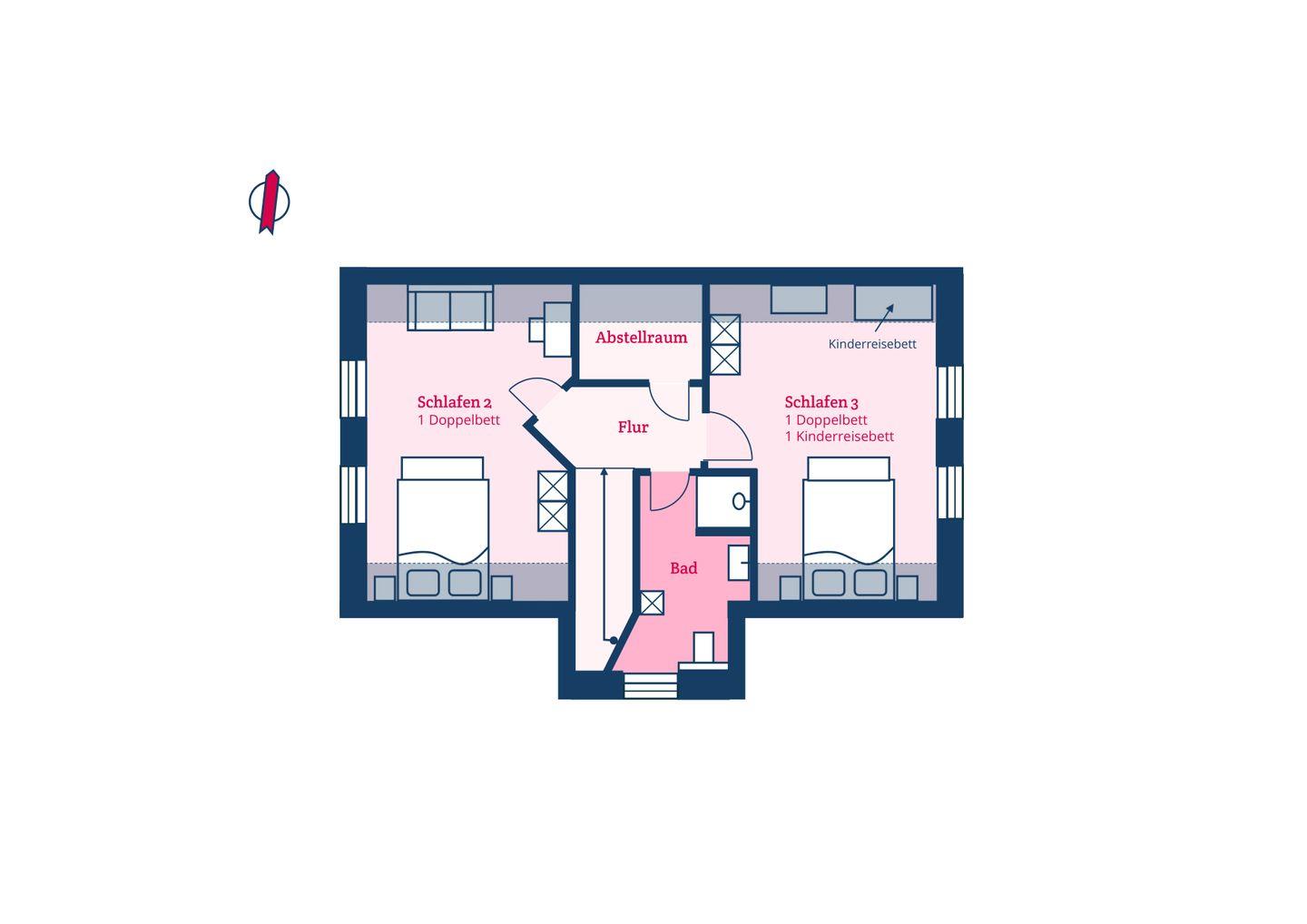 Im Obergeschoss sind zwei weitere Schlafzimmer - jeweils mit einem Doppelbett ausgestattet - sowie das zweite Duschbad gelegen. Alle Schlafzimmer sind mit einem TV ausgestattet, ein Doppelbett-Zimmer verfügt über einen Schminktisch. In beiden Bädern befinden sich Radios, die in eine Wand eingelassen sind und über den Lichtschalter bedient werden.