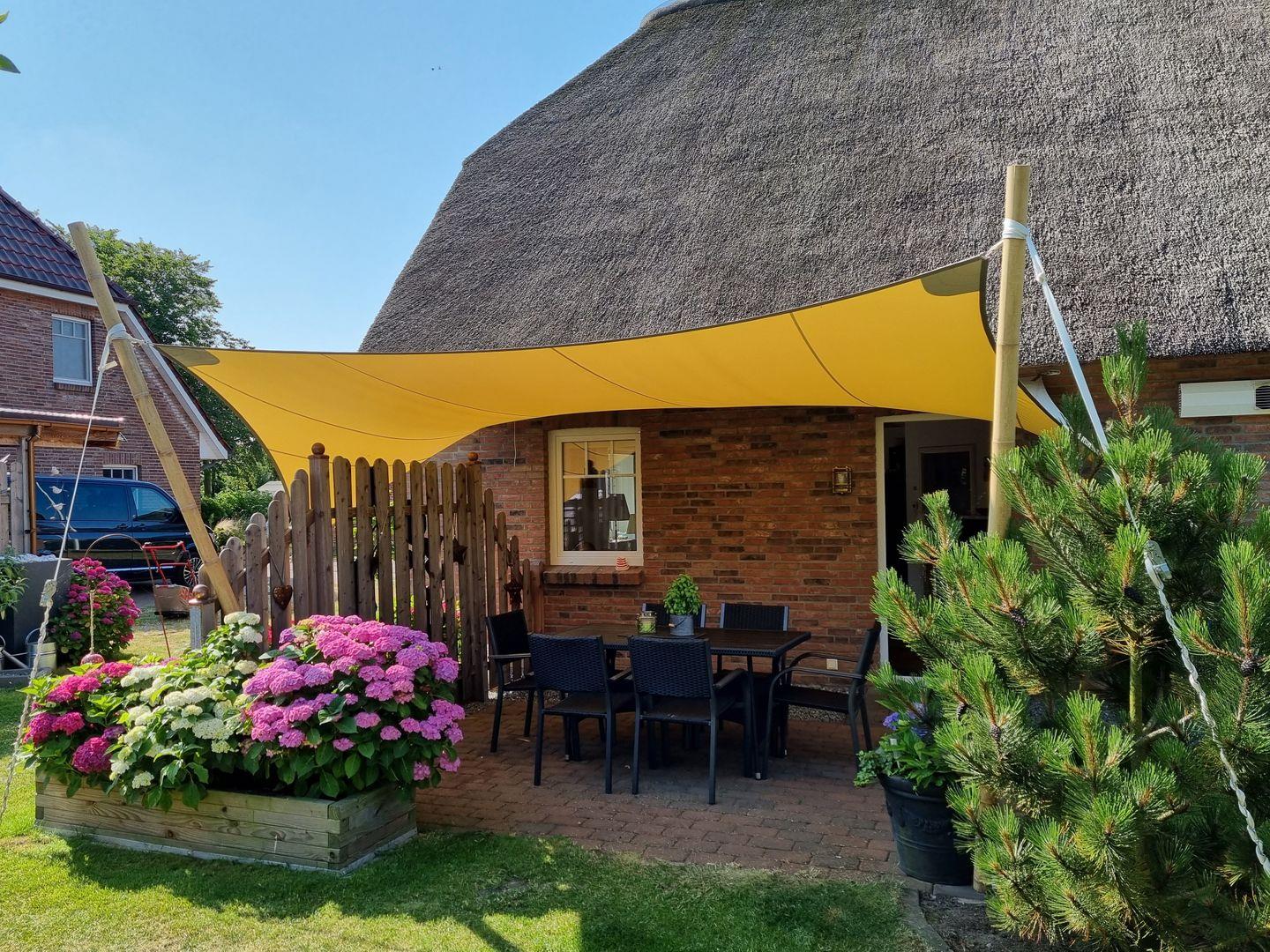 Reetgedecktes Ferienhaus, modern ausgestattet, mit Ethanol-Kamin und Garten mit Terrasse.