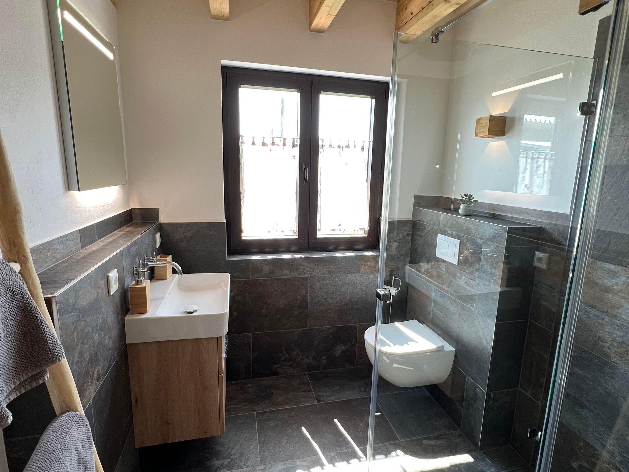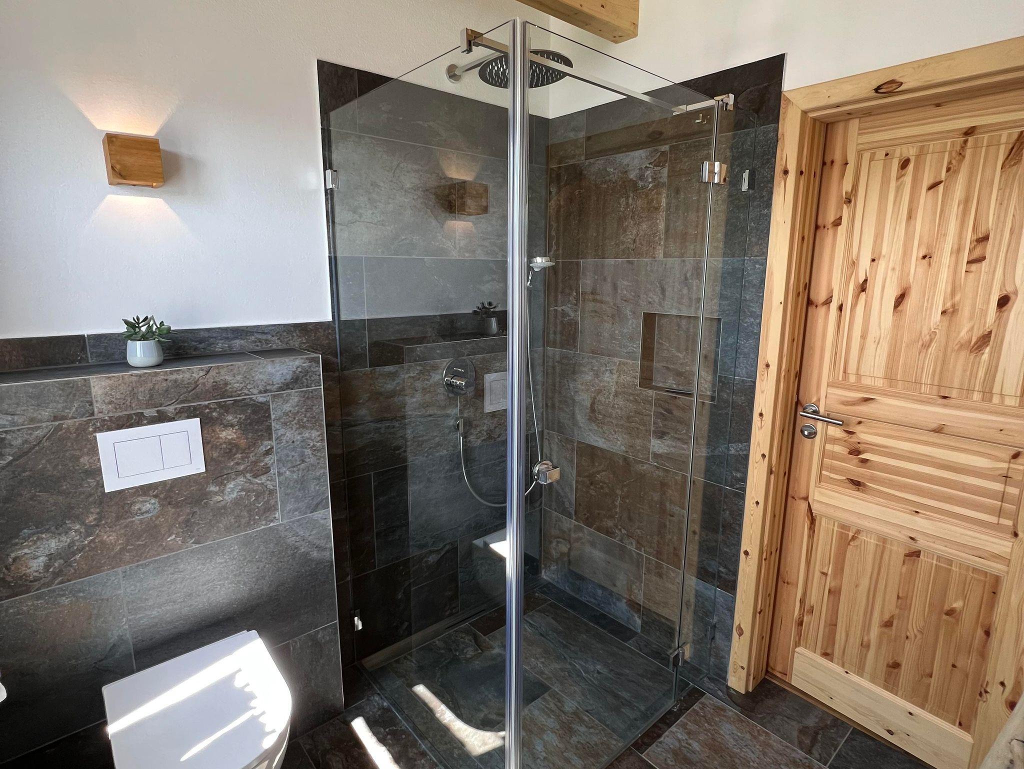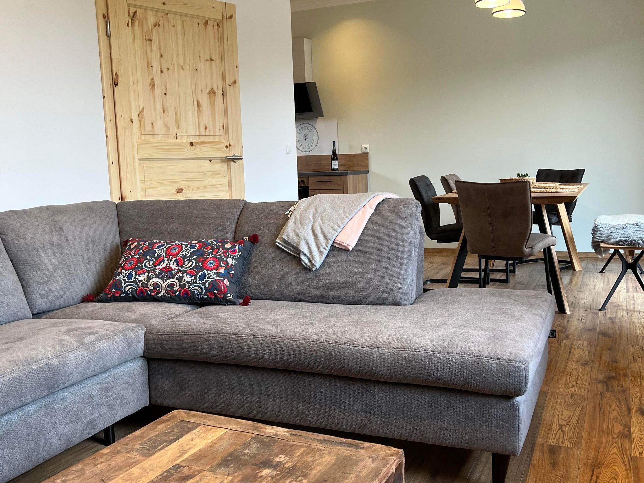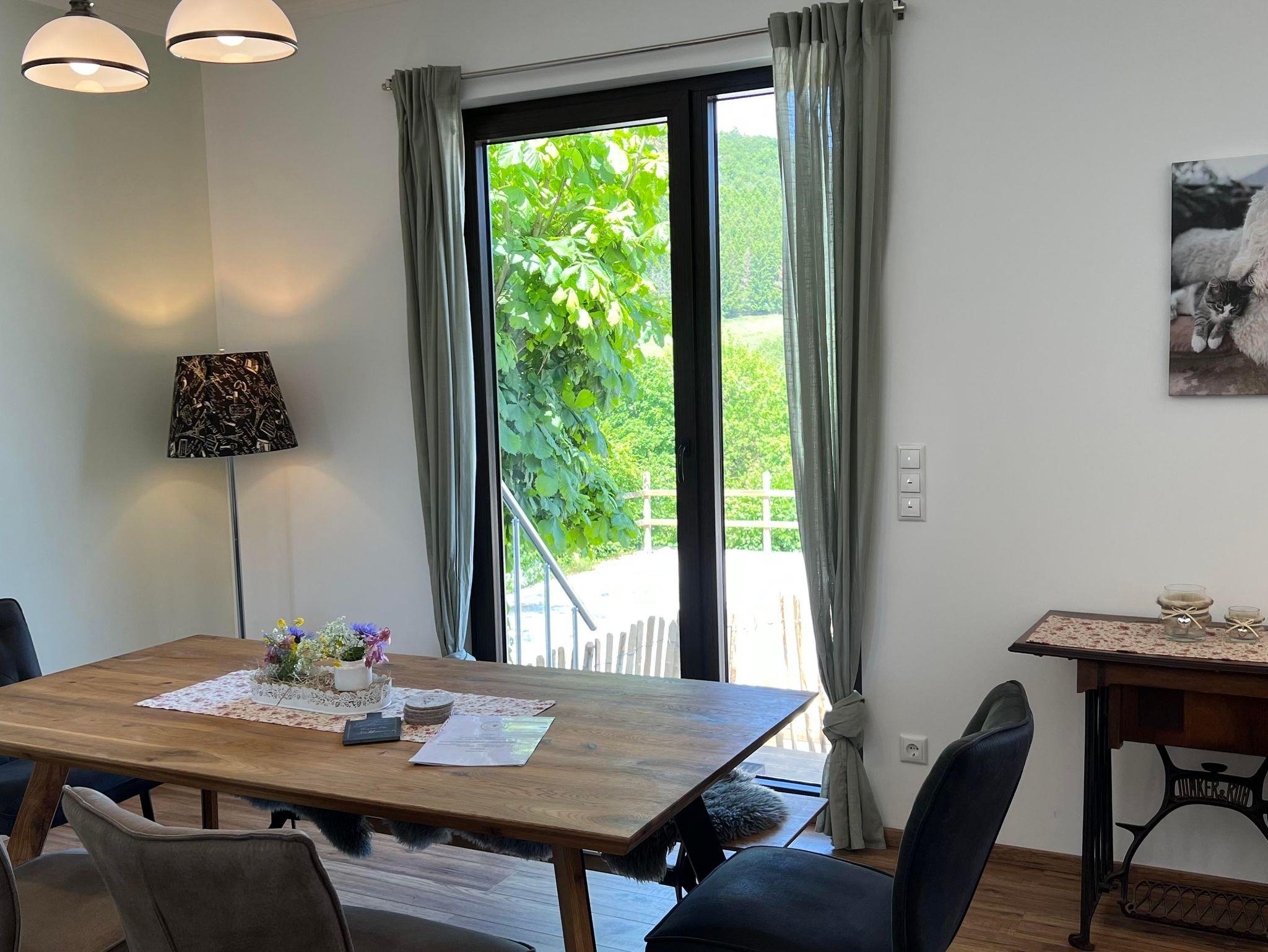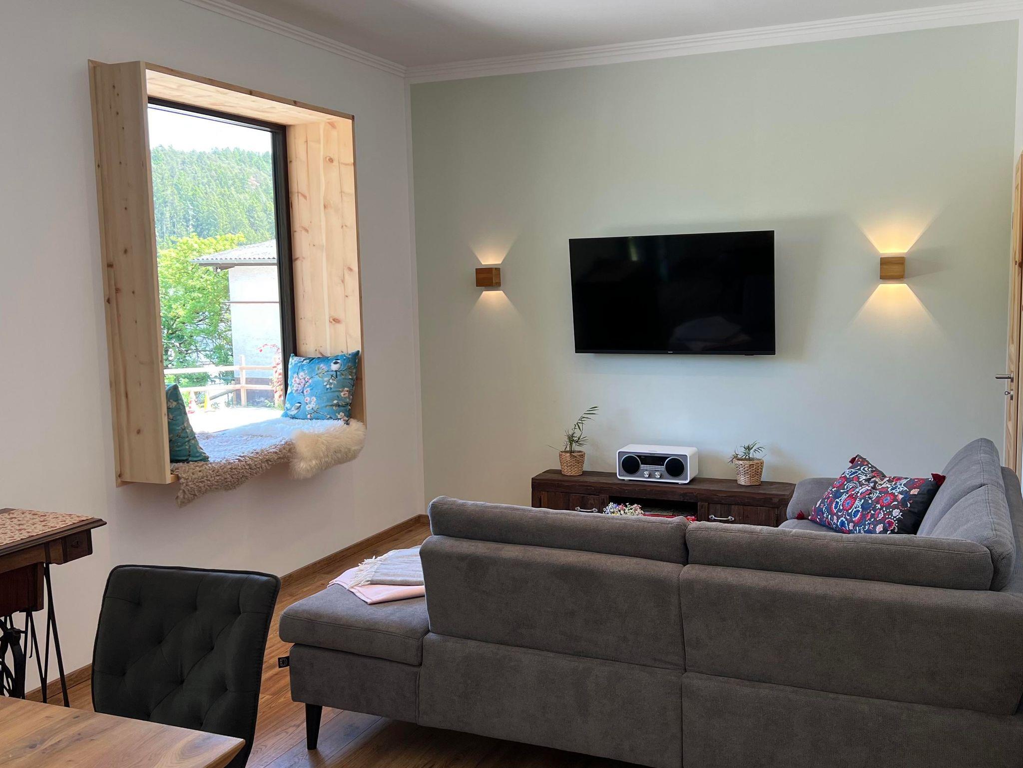Im Erdgeschoss erwartet Dich eine voll ausgestattete Küche mit Geschirrspüler, das Esszimmer, der Wohnbereich mit einem wunderbaren Sitzfenster aus Zirbenholz, einem gemütlichen Sofa, Audio-System und Smart-TV sowie ein WC.