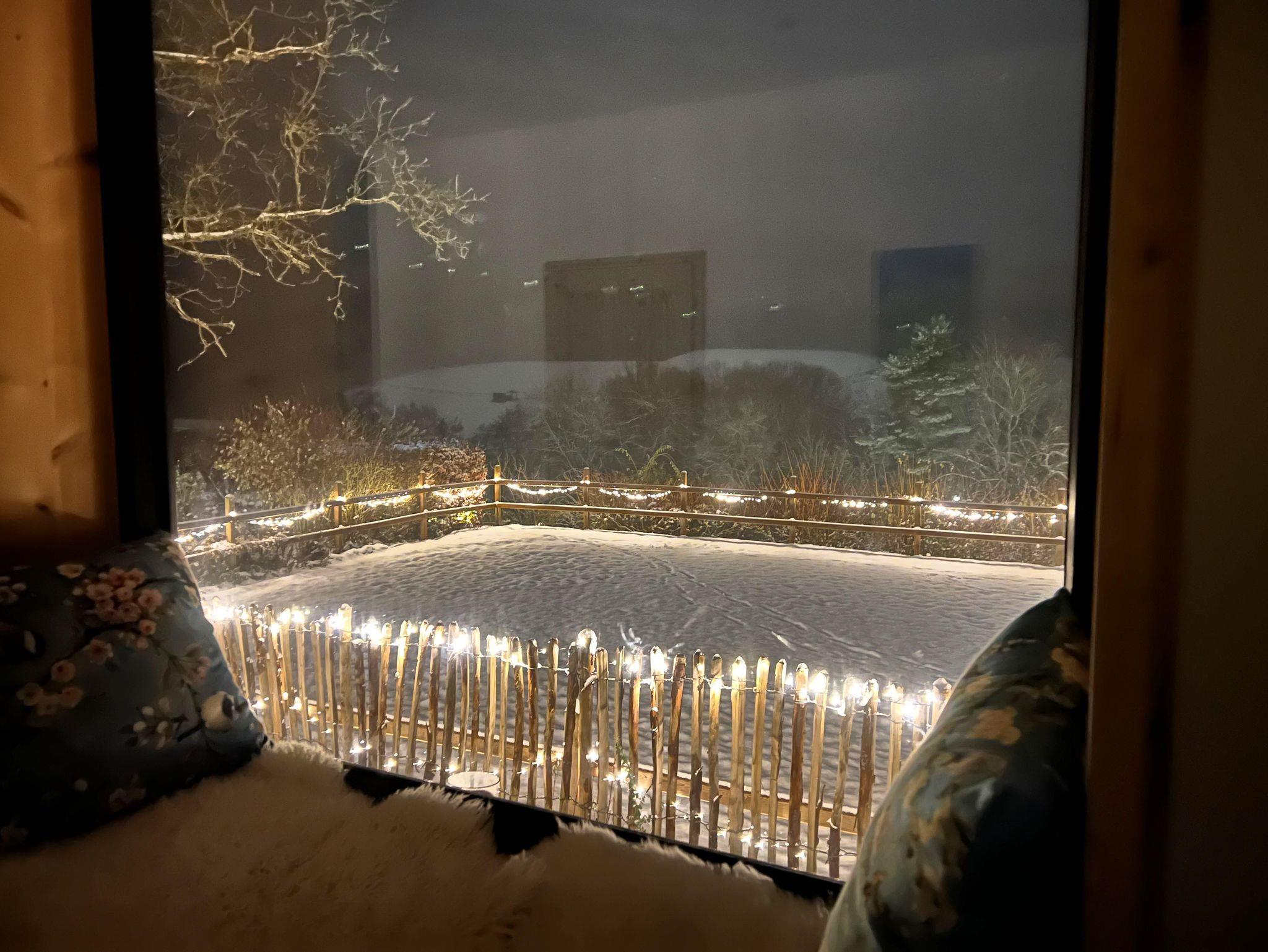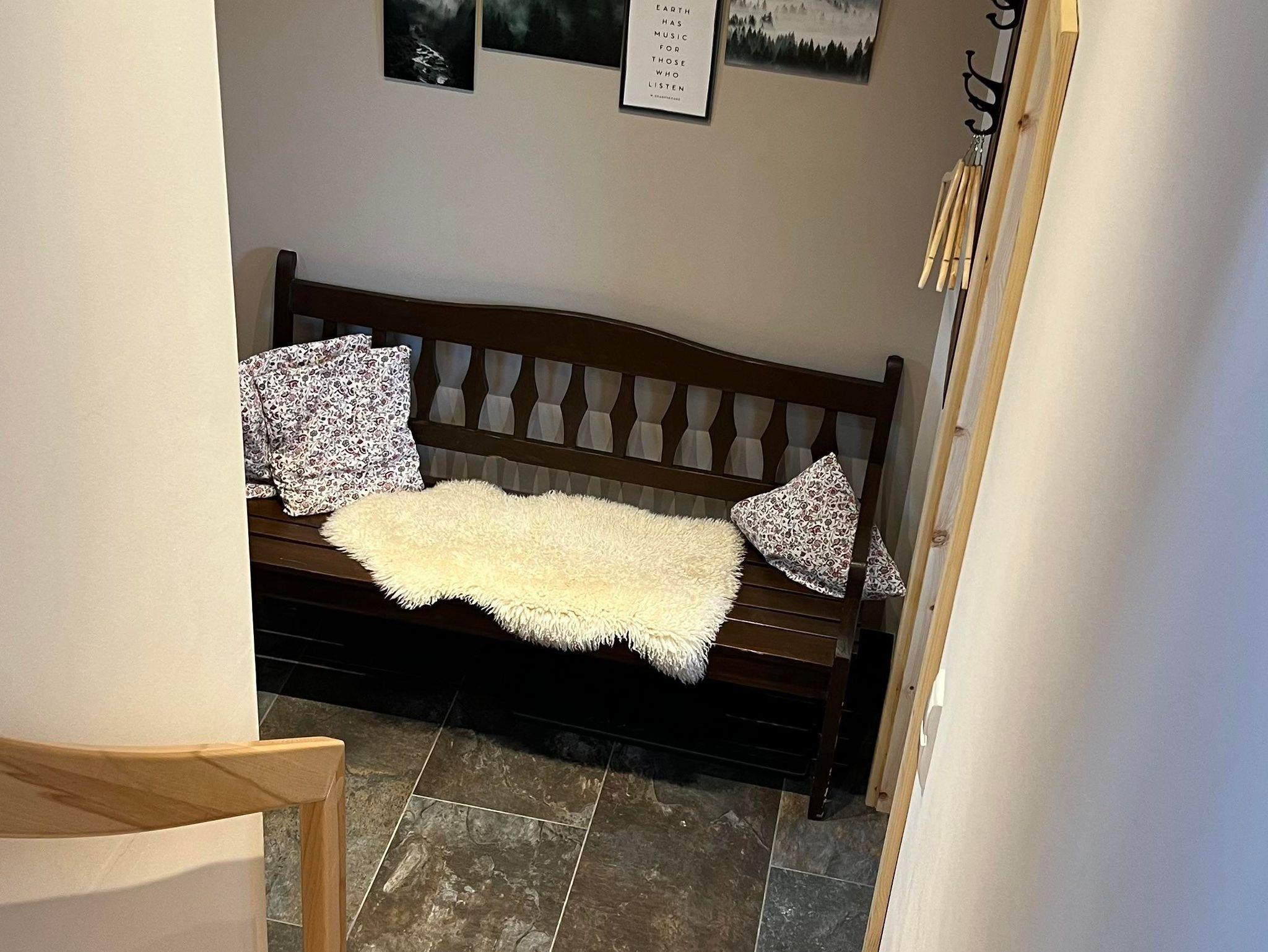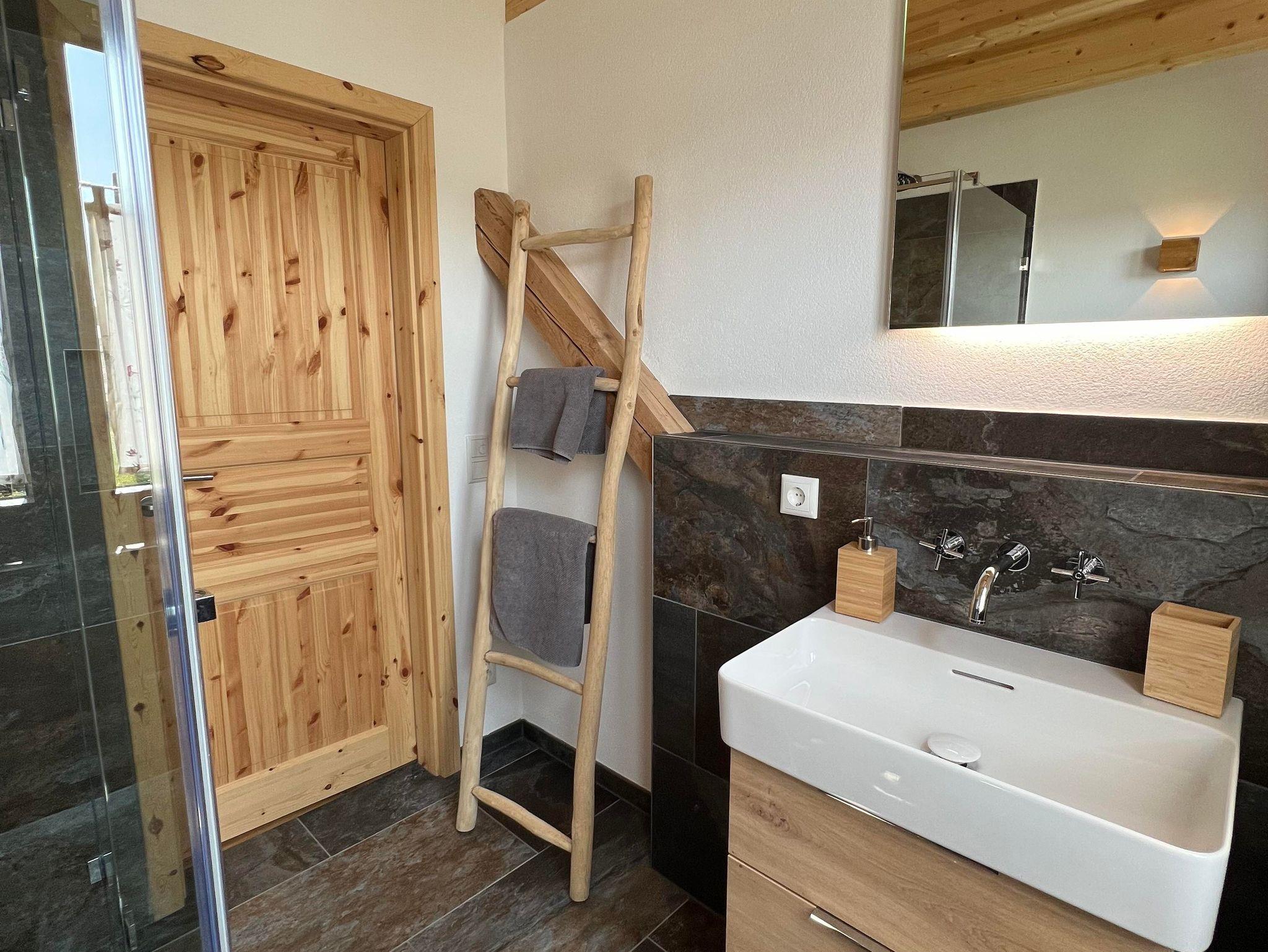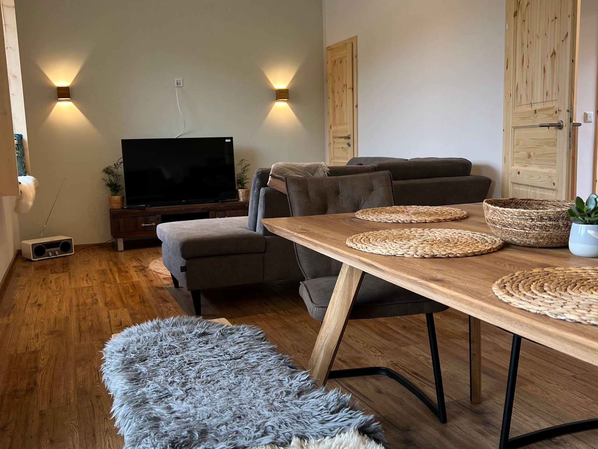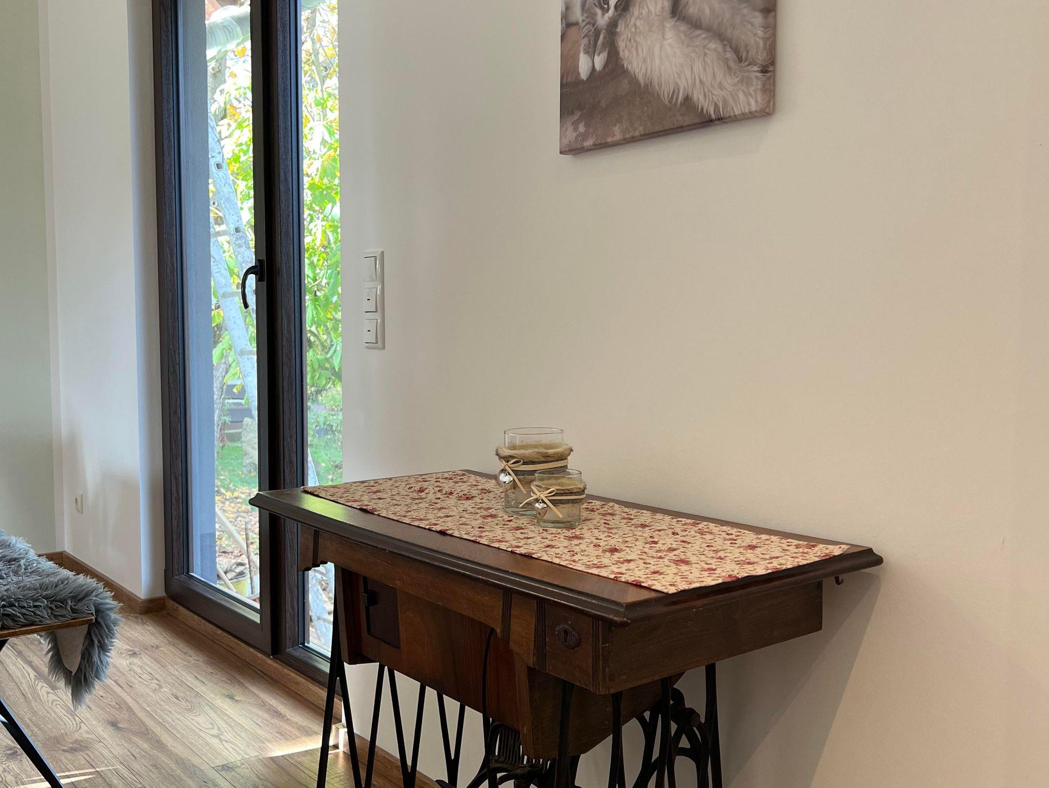Im Erdgeschoss erwartet Dich eine voll ausgestattete Küche mit Geschirrspüler, das Esszimmer, der Wohnbereich mit einem wunderbaren Sitzfenster aus Zirbenholz, einem gemütlichen Sofa, Audio-System und Smart-TV sowie ein WC.