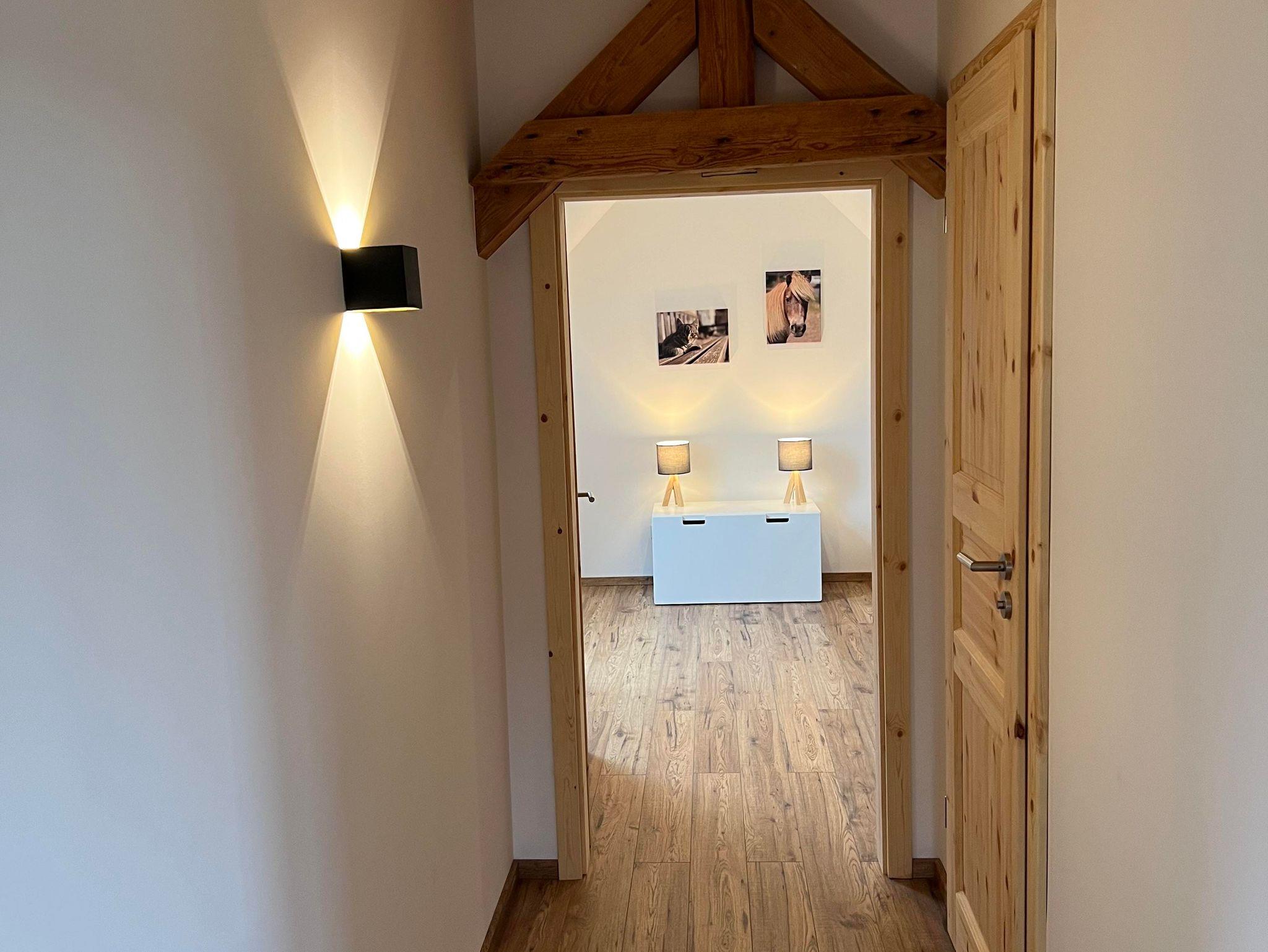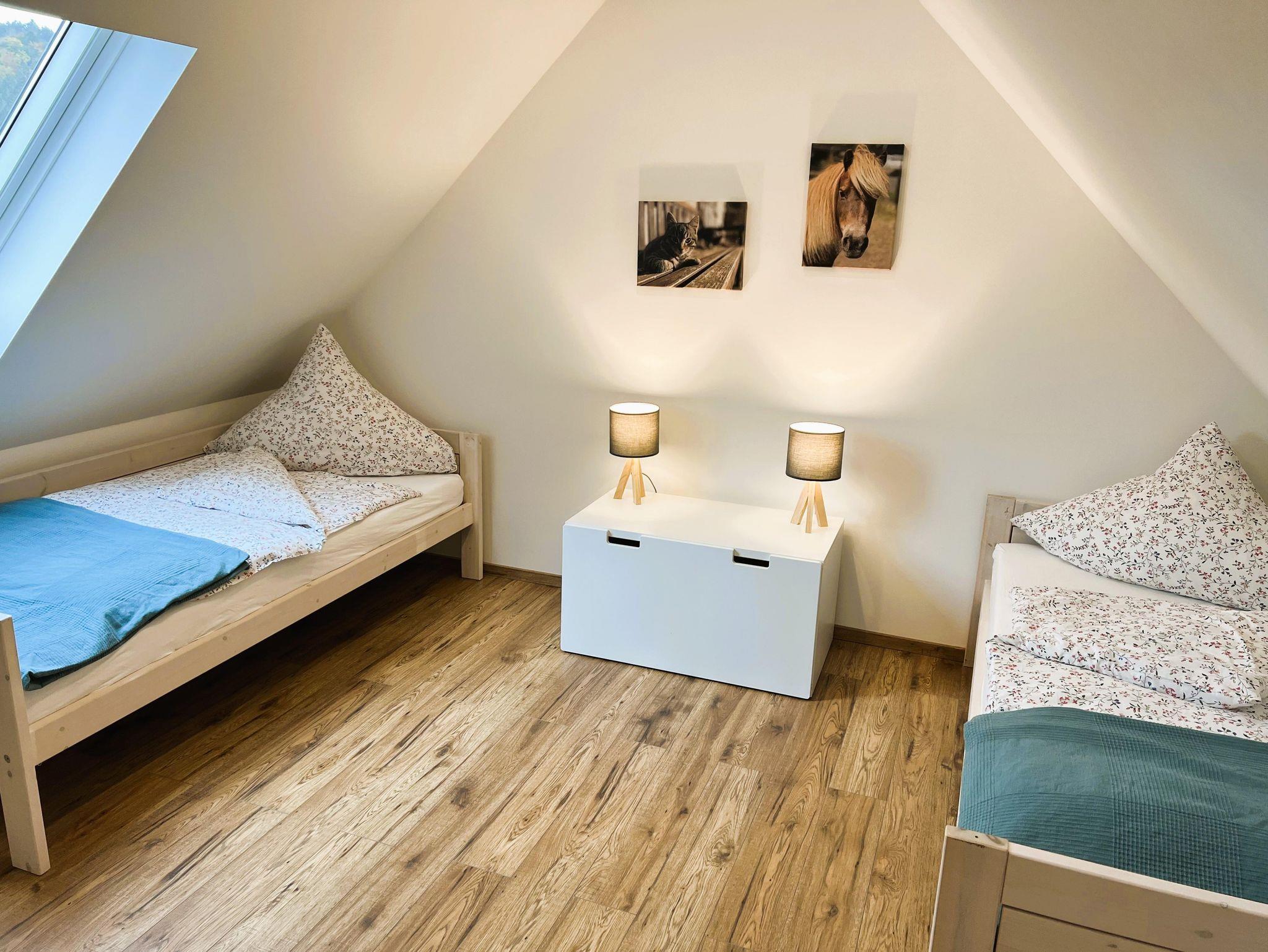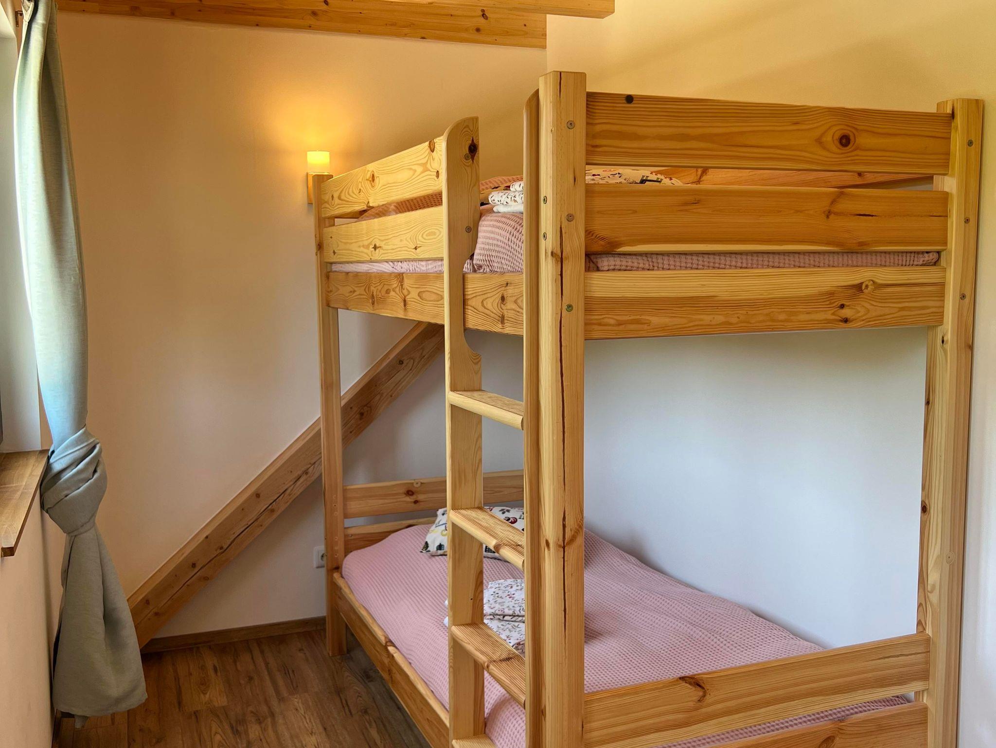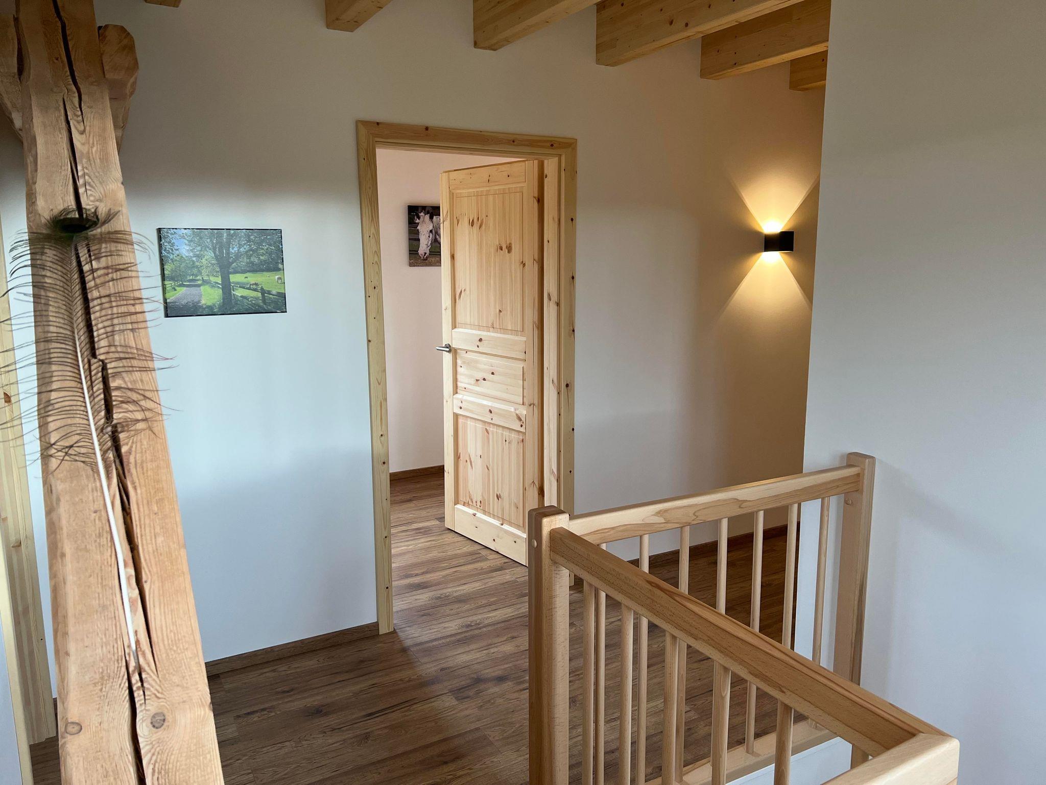Das bisherige Heu- und Strohlager bildet jetzt das Obergeschoss mit drei Schlafzimmern - einem Schlafzimmer mit einem Doppelbett, ein Schlafzimmer mit zwei Einzelbetten und ein Schlafzimmer mit einem Etagenbett - sowie dem Badezimmer.