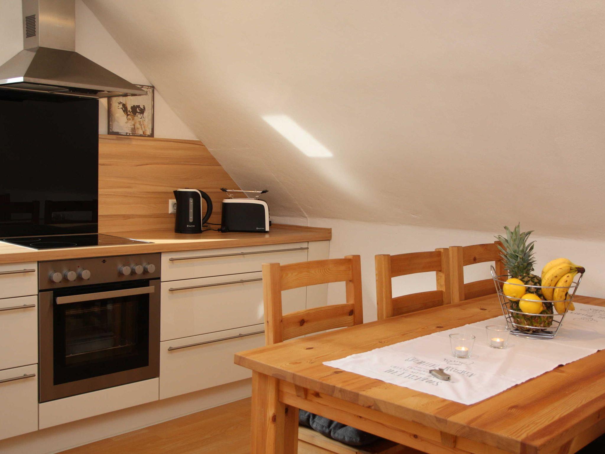 Die moderne, helle Küche verfügt über Spülmaschine, Herd mit Ceranfeld und Backofen sowie Kühlschrank mit Gefrierfach. Kaffeemaschine, Mikrowelle, Wasserkocher, Toaster und Mixer sowie komplettes Koch- und Essgeschirr stehen ebenfalls bereit.