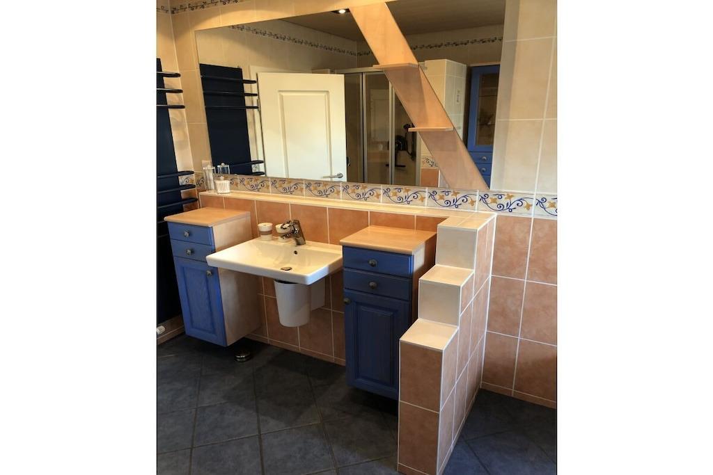 På 1. etage: (entre(), Stue(, , bibliotek, Fjernsyn, DVD-afspiller, DVD-afspiller, Blu-ray afspiller, radio, insektnet), spisestue(, spisebord), Køkken(, spisebord, kogeplade, elkedel, brødrister, kaffemaskine, ovn, mikrobølgeovn, opvaskemaskine , køleskab, fryser), soveværelse(, , bibliotek, dobbeltseng, king size-seng, Fjernsyn, insektnet), soveværelse(, , bibliotek, dobbeltseng, king size-seng, Fjernsyn, insektnet), badeværelse(, toilet, badekar, bruser, håndvask, bidet, føntørrer), pulterkammer(, strygebræt, strygejern, tørreskab)) , , , Internetadgang, Internetadgang, Førstehjælp, balkon(balkon, baldakin), varme, terrasse(, Græsplæne, grill, havemøbler, solstole), parkering, strygebræt, strygejern, tørreskab, Ladestation til el-biler
