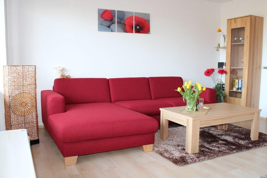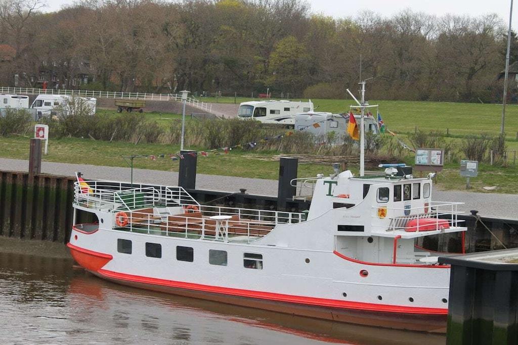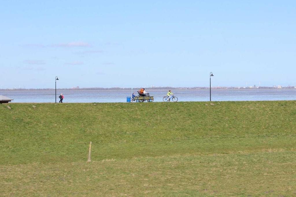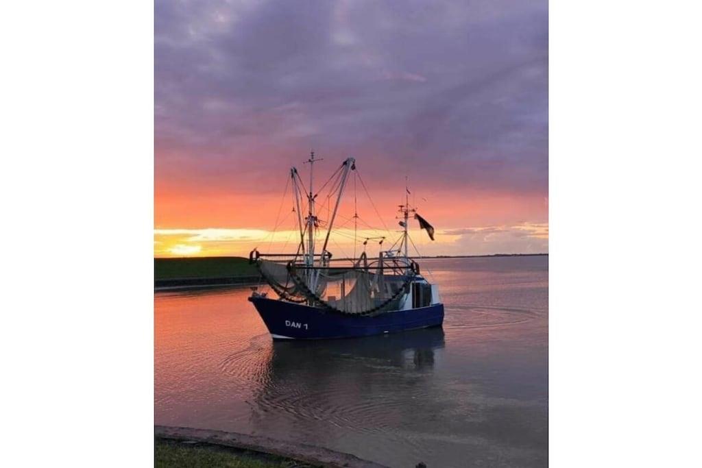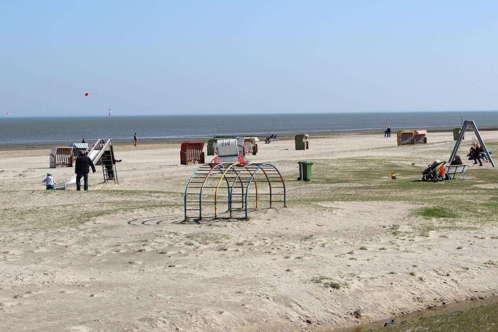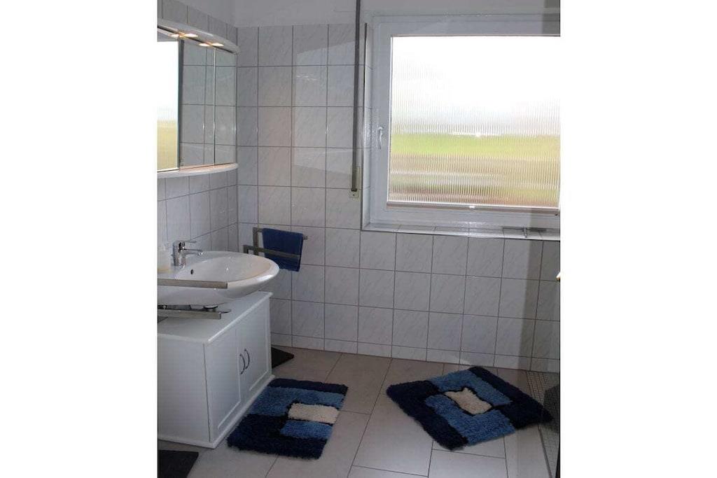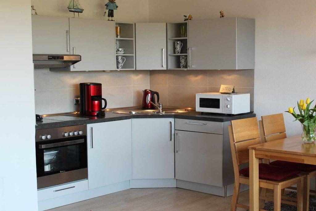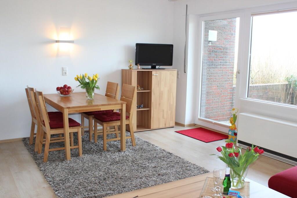 Den moderne ferielejlighed ved Vadehavet med uhindret udsigt over Jadebugten er til rådighed for en ubekymret og smuk ferie i Nordsøen. Opholds- og spisestuen er åben og moderne. Opholdsstuen er udstyret med Wi-Fi, fladskærms-tv, dvd-afspiller og cd-/radioafspiller. Det nye køkken har eksklusive apparater: keramisk kogeplade, ovn, mikrobølgeovn, køleskab og fryser. Opholdsstuen fører ud til terrassen og den fælles have, hvor du kan slappe af og nyde morgenmaden i den behagelige Nordsøbrise. Soveværelset er møbleret med en dobbeltseng og et stort klædeskab. Badeværelset har bruseniche/toilet.