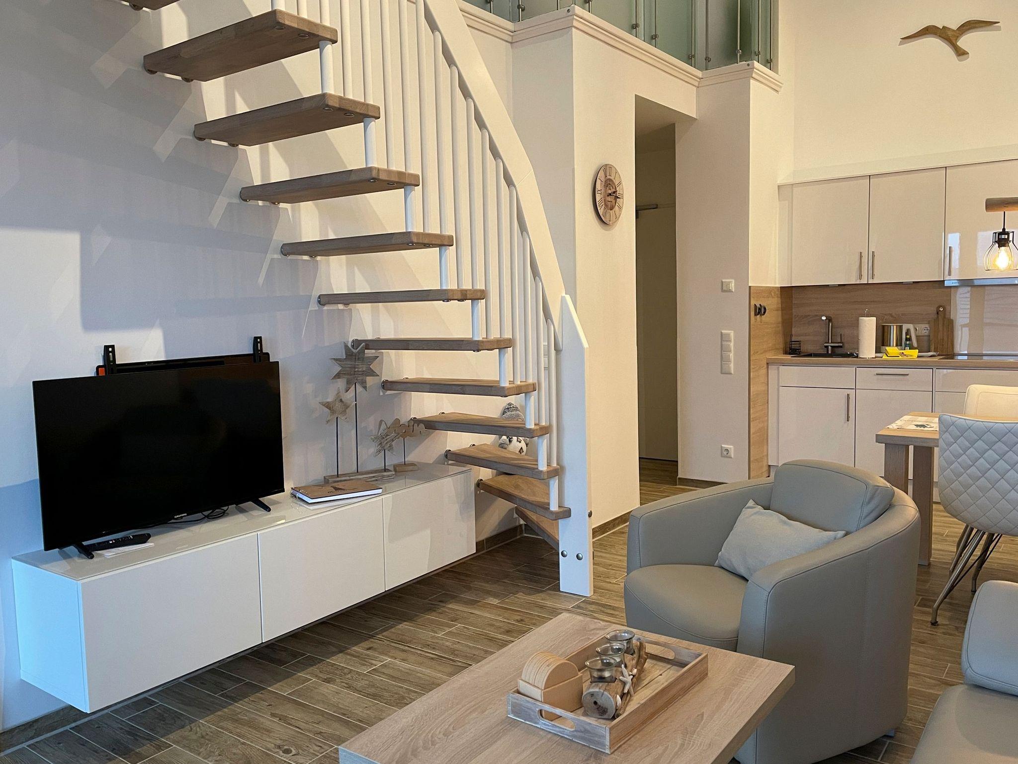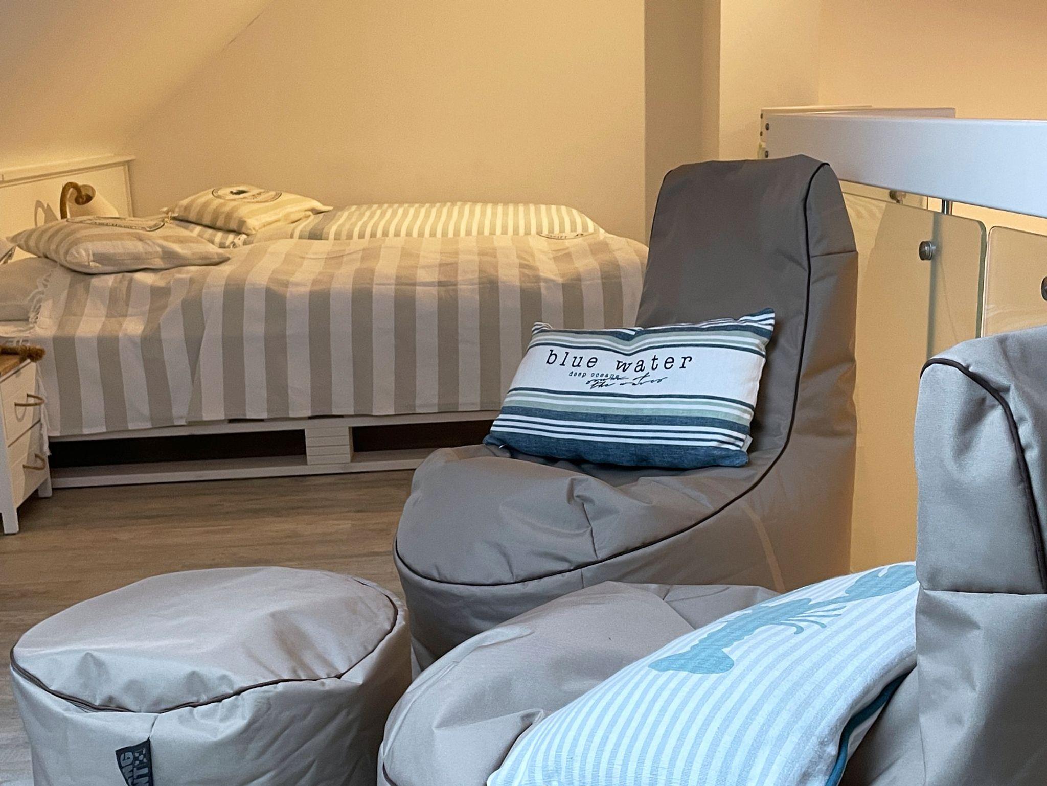 In dieser schönen Wohnung finden Sie einen offenen Wohn-/Küchenbereich mit Liebe zum Detail eingerichtet, einen Relax Sessel und diverse Kinderbücher für die Kleinen geben der Wohnung einen weiteren Hauch Gemütlichkeit, im Schlafzimmer mit Boxspringbett (Maße:180x200cm), Flachbildschirm, Kleiderschrank finden Sie eine entspannte Atmosphäre, einen offenen Schlafbereich auf der Empore mit einem Doppelbett(Einzelbetten) Flachbildschirm und 2 Sitzsäcken prägen das Bild. Das schöne moderne Bad - ausgestattet mit Föhn, Radio und mit bodentiefer Sommerregendusche - rundet das Ambiente ab. Auf der großen Loggia mit den Sonnenliegen können Sie Ruhe finden und genießen.