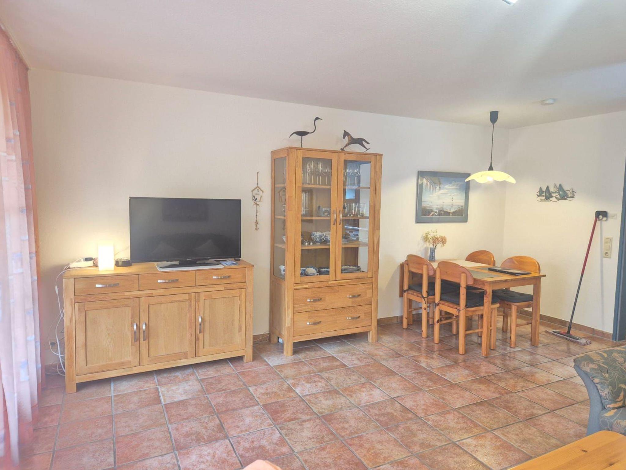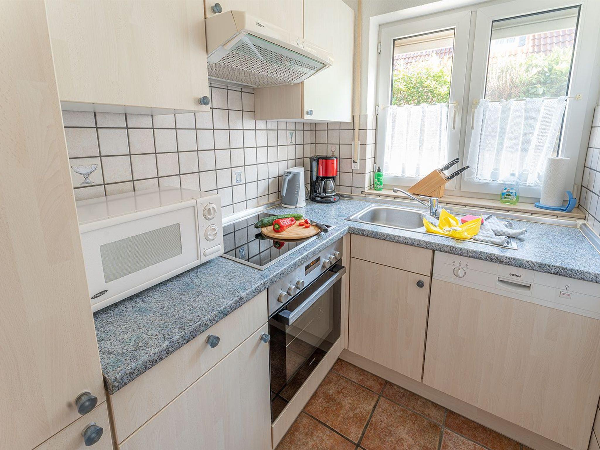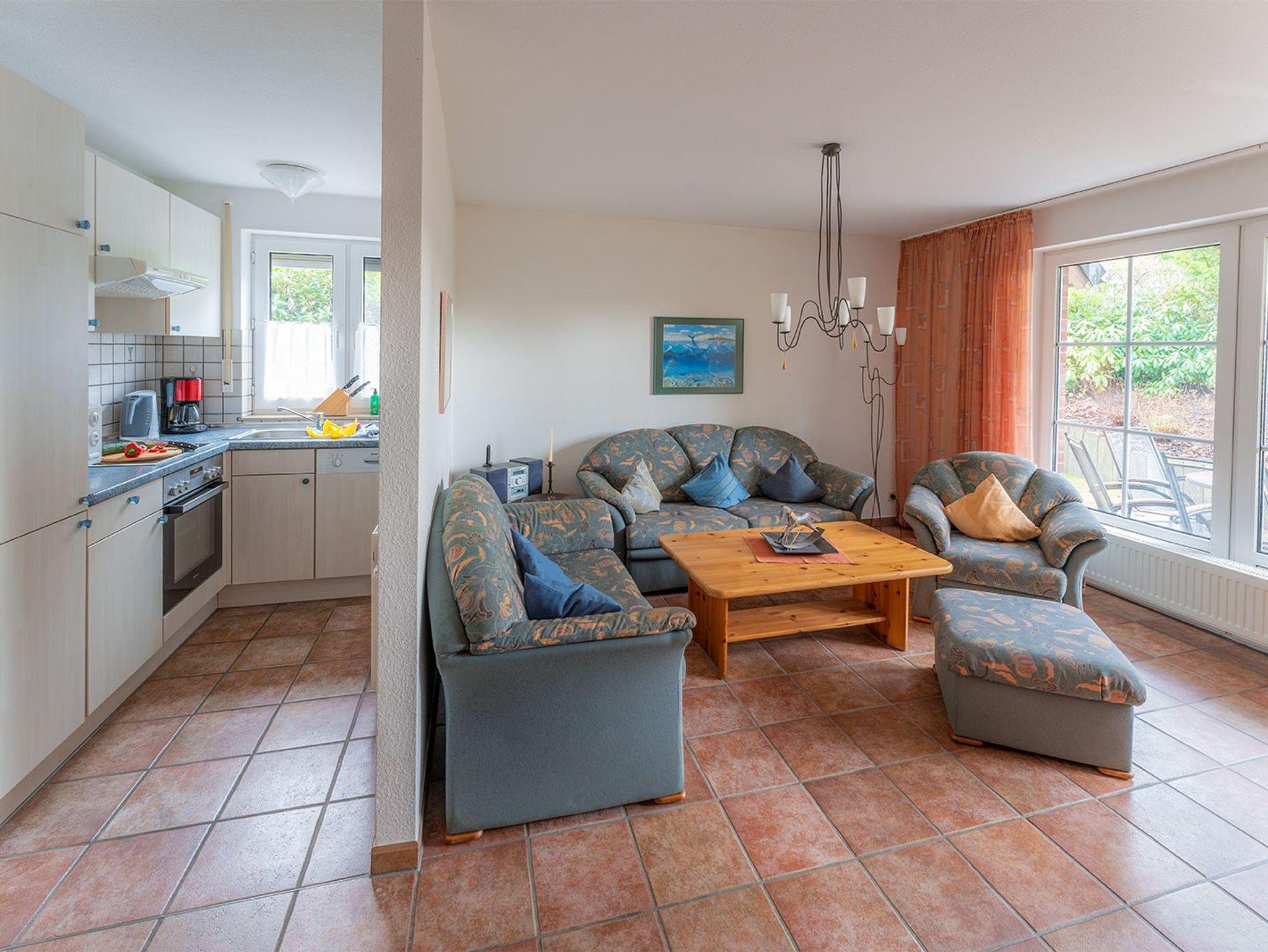 Sie betreten diese freundliche Ferienwohnung am Hollwert 33 a im Erdgeschoss durch eine geräumige Diele. Geradeaus gelegen ist das helle Fenster-Duschbad mit Waschmaschine. Eine separate moderne Küche bietet Ihnen eine komplette Grundausstattung. Weiter geht es in den Wohn-/Essbereich mit Flachbild-TV und friesisch gemütlicher Sitzgelegenheit. Das Schlafzimmer bietet ein bequemes Doppelbett sowie Kleiderschrank, Kommode und hat Teppichboden. Entspannen Sie auf der gepflegten begrünten Terrasse.