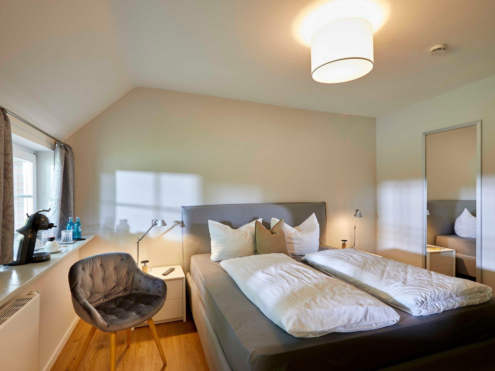 In jedem Zimmer befindet sich ein komfortables Boxspringbett und ein großer Kleiderschrank bietet viel Platz für Ihr Reisegepäck.