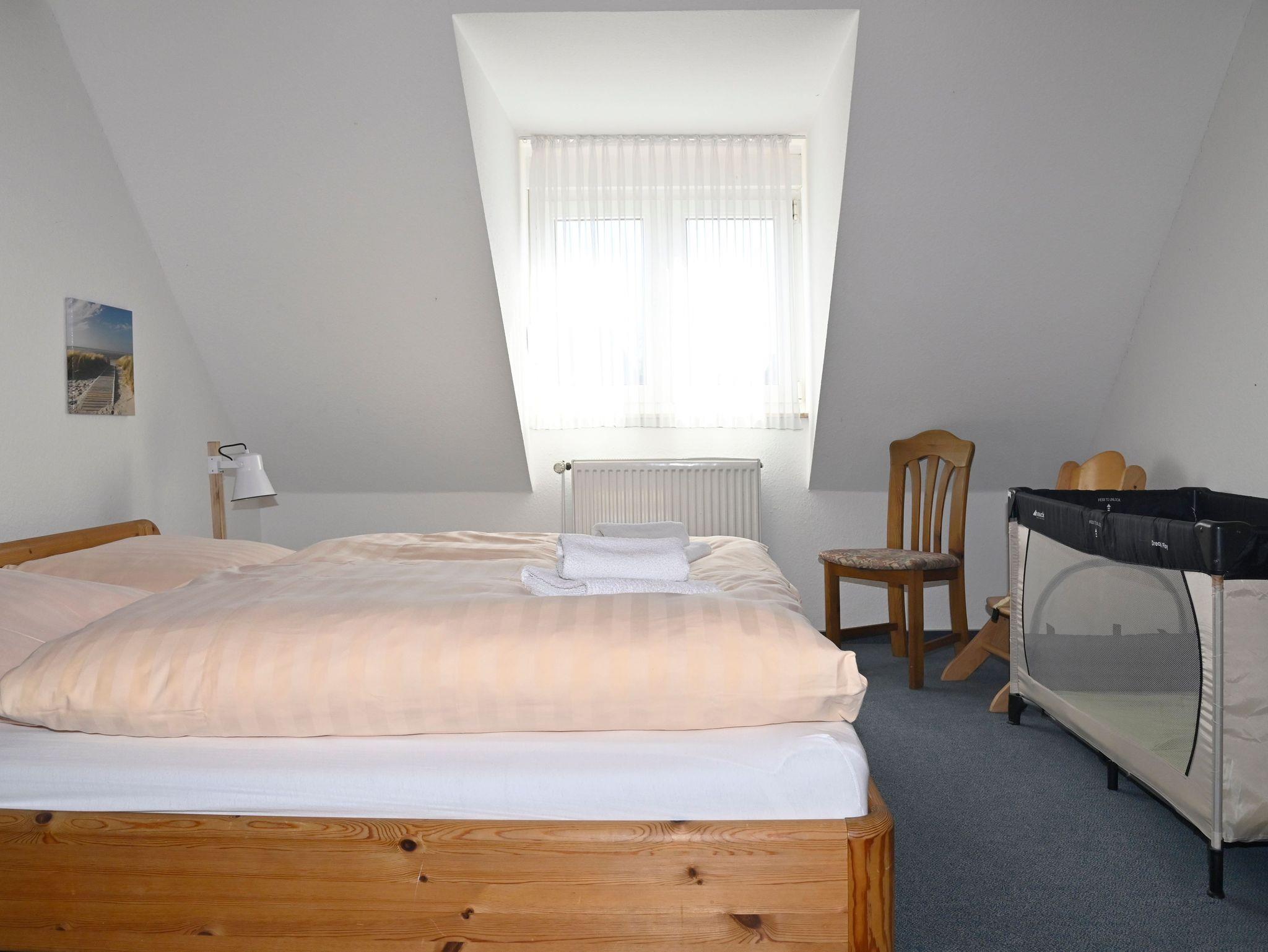 Im ersten Obergeschoss befindet sich das Elternschlafzimmer mit Doppelbett, ein Kinderzimmer mit zwei Einzelbetten sowie das Duschbad mit einer Waschmaschine und Außenfenster.