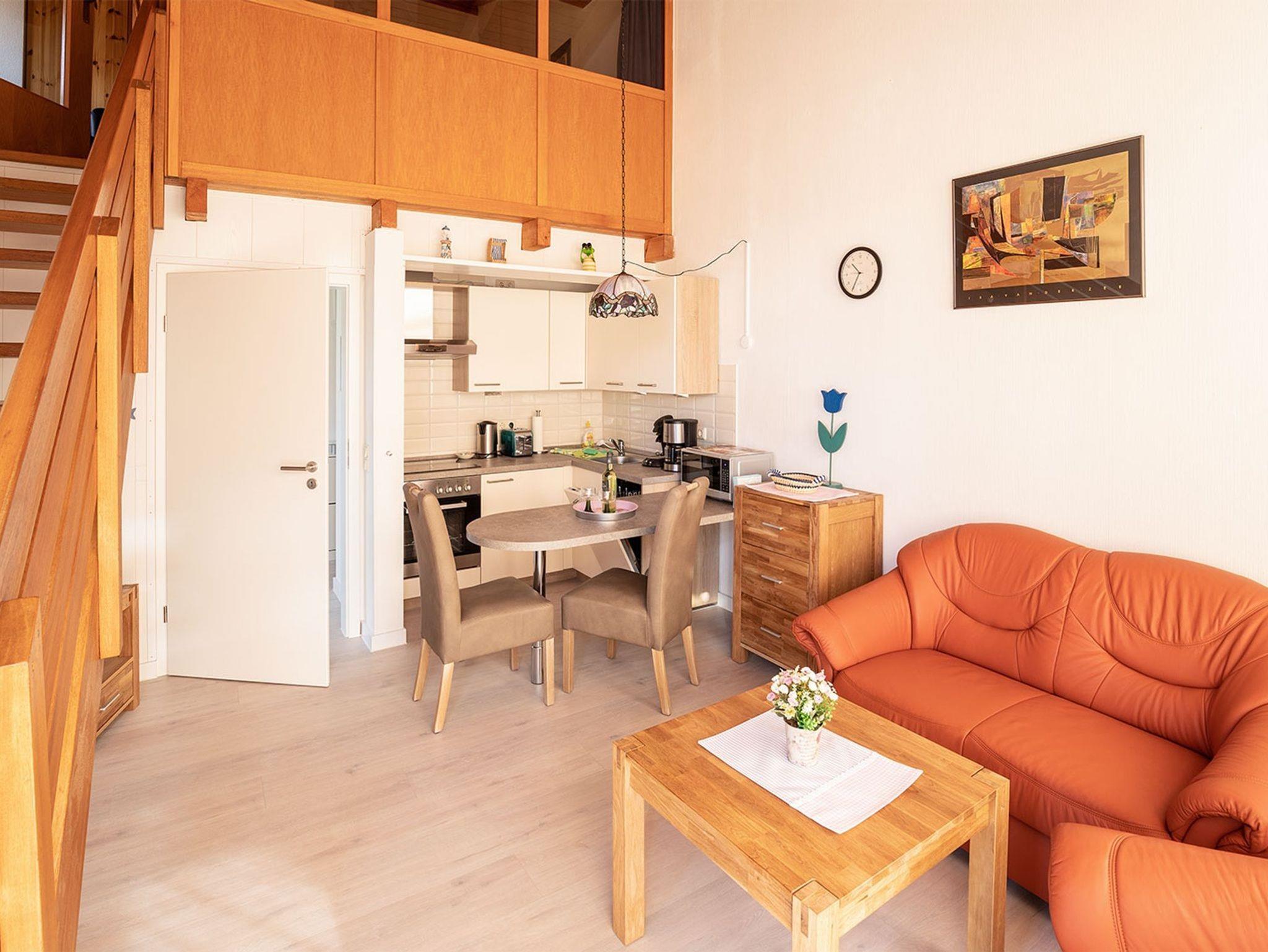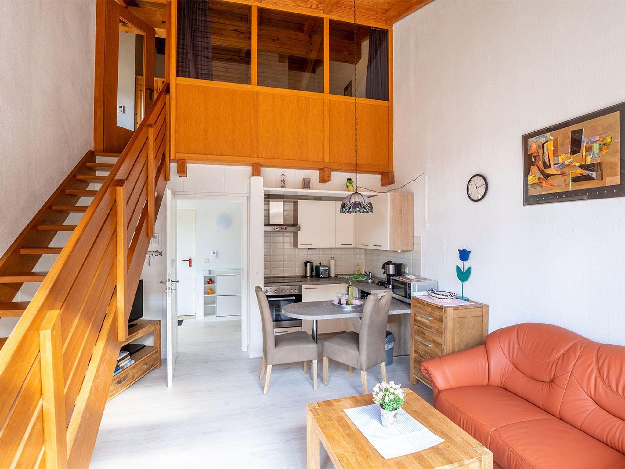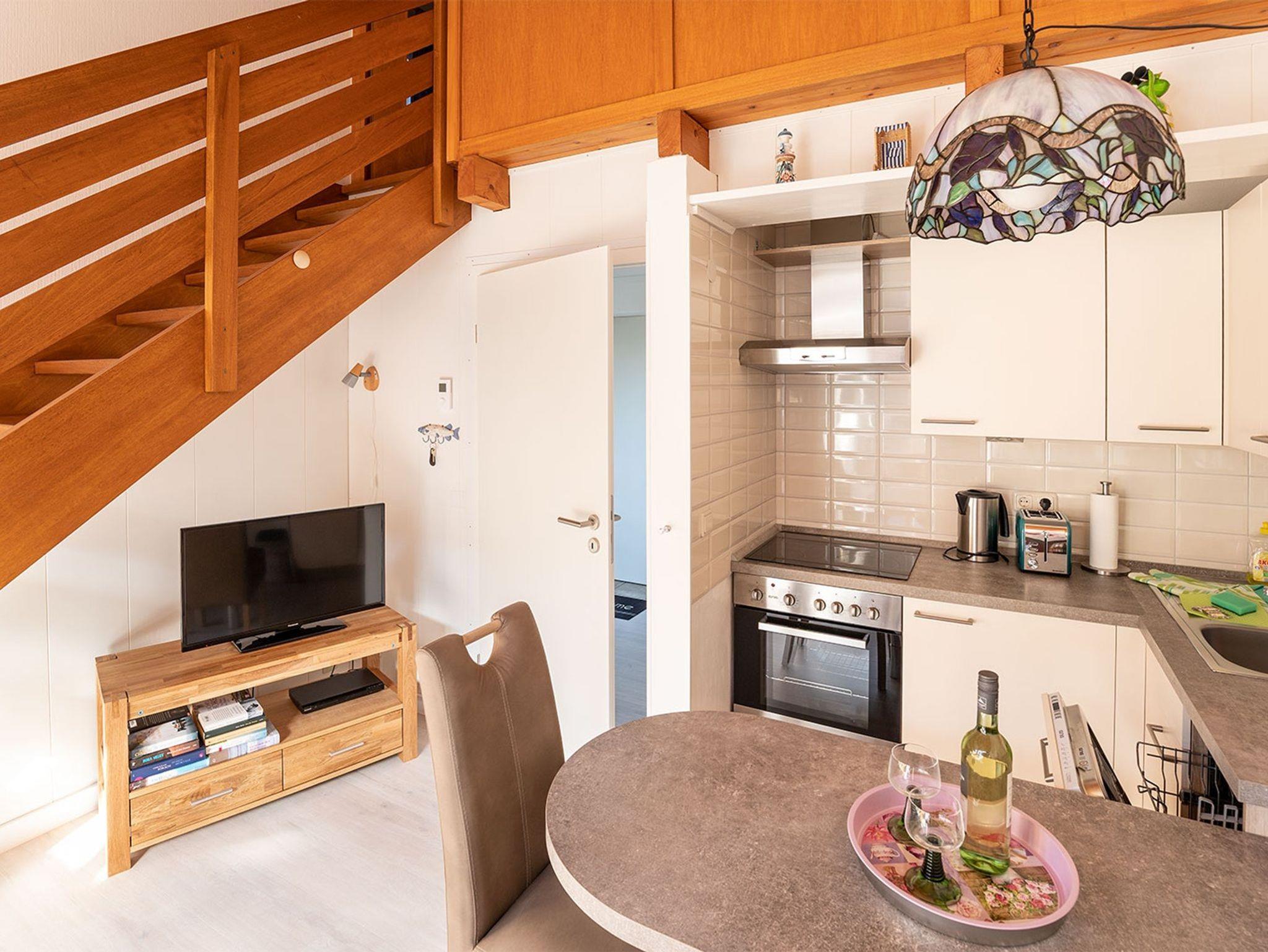 Willkommen in unserer Ferienwohnung Bullauge im Herzen von Dangast. Sie haben einen eigenen Fahrzeug-Stellplatz direkt vor der Ferienhausanlage und Ihr Vierbeiner ist ein gern gesehener Gast. Eine geräumige Diele mit Garderobe und Abstellraum und Zugang zum modern sanierten Badezimmer führt Sie in den Wohn- und Essbereich mit integrierter Küchenzeile und vorgelagertem Essplatz. Hier ist auch der Ausgang zum Balkon in Südlage mit Mobiliar und Sonnenschutz. Eine gerade, offene Holztreppe führt zur geschlossenen Schlafempore.