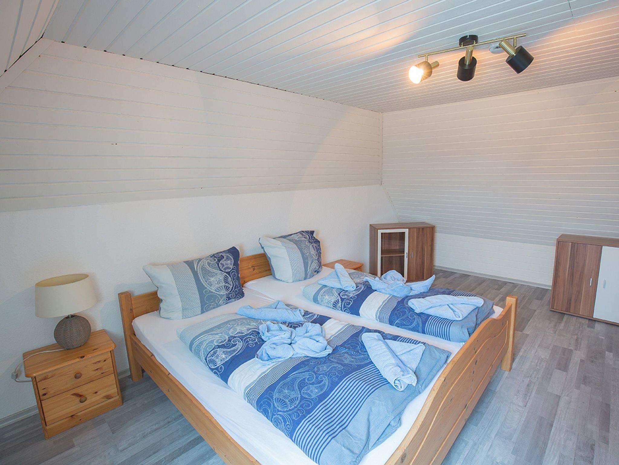 Im ersten Obergeschoss befinden sich zwei helle Schlafräume mit je zwei Einzelbetten und einem Doppelbett sowie das geräumige Duschbad mit Fenster. Im Dachgeschoss gibt es noch ein weiteres Schlafzimmer mit zwei Einzelbetten.