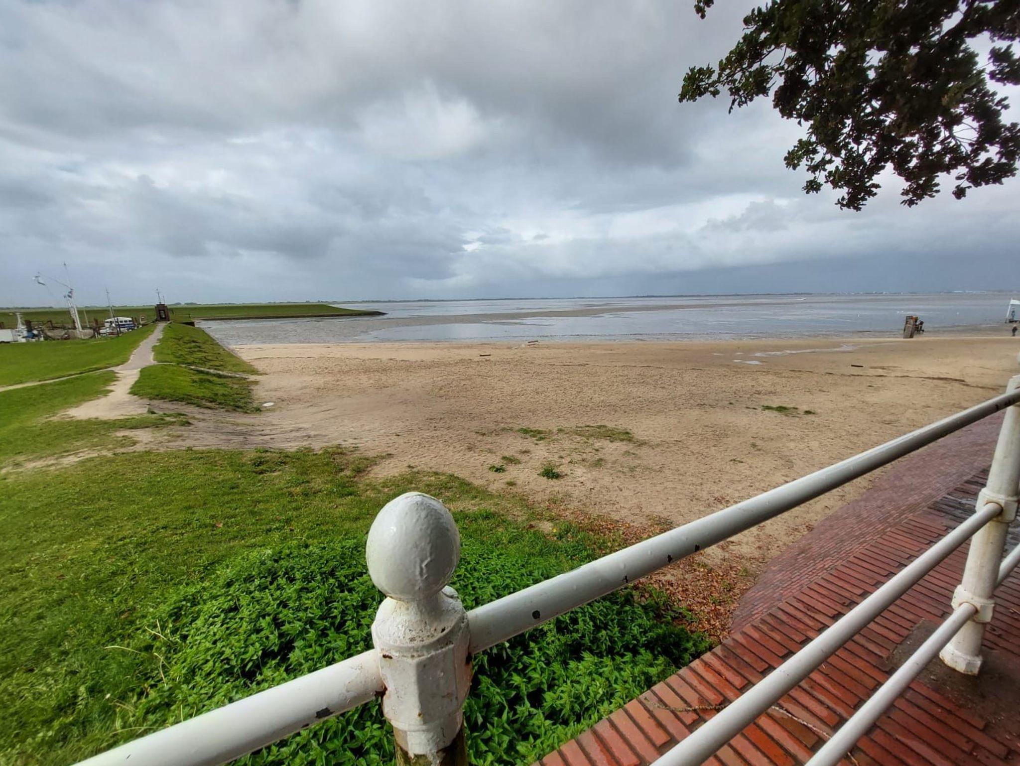 Vom Wohnzimmer aus hat man Zugang zur geräumigen, überdachten Terrasse und zu dem mit einer Hecke eingefriedeten Rasen. Von hier kann man bis zum Deich blicken. Für sonnige Tage stehen ein Sonnenschirm sowie eine Sitzgarnitur mit Auflagen bereit.
