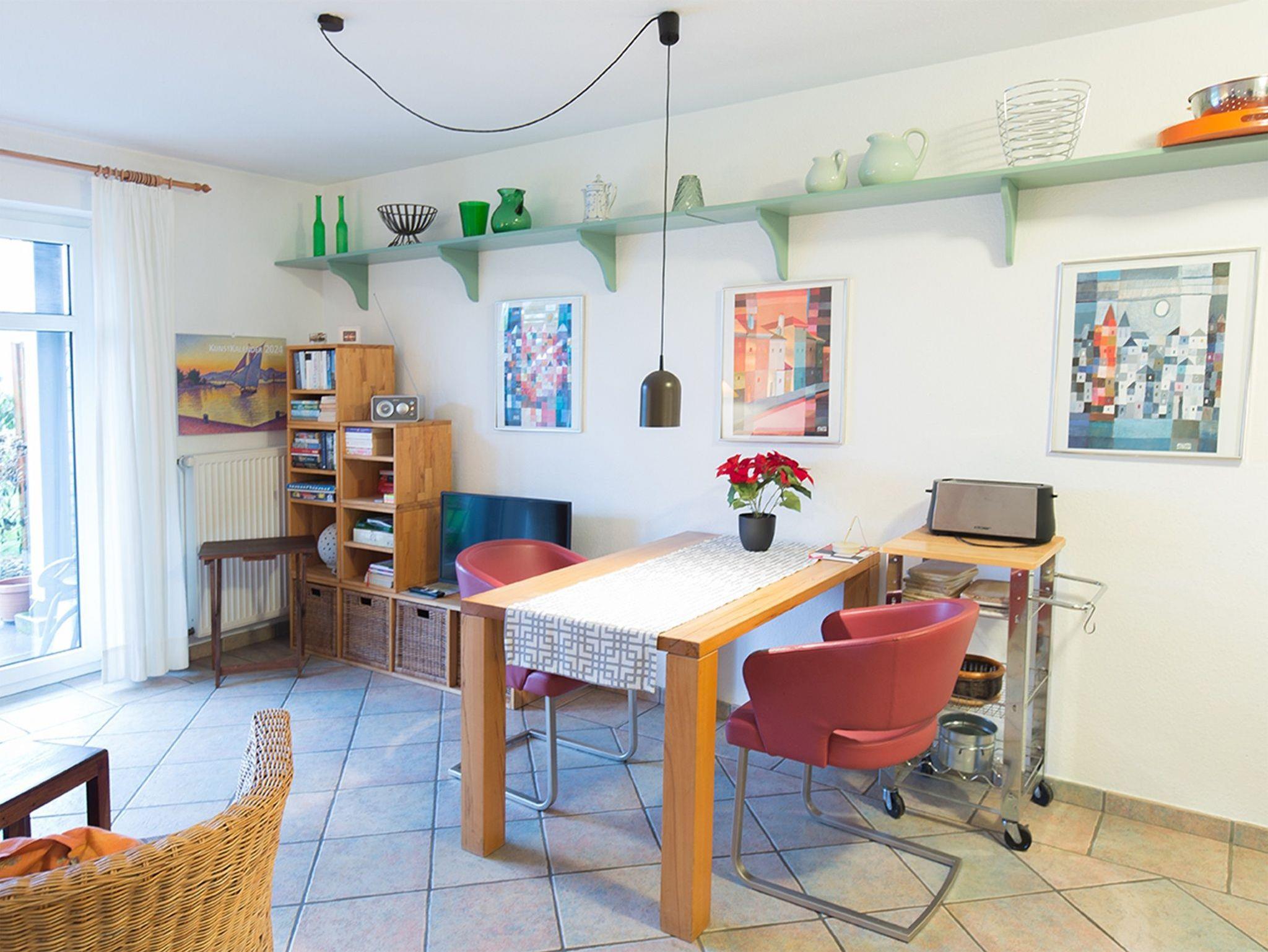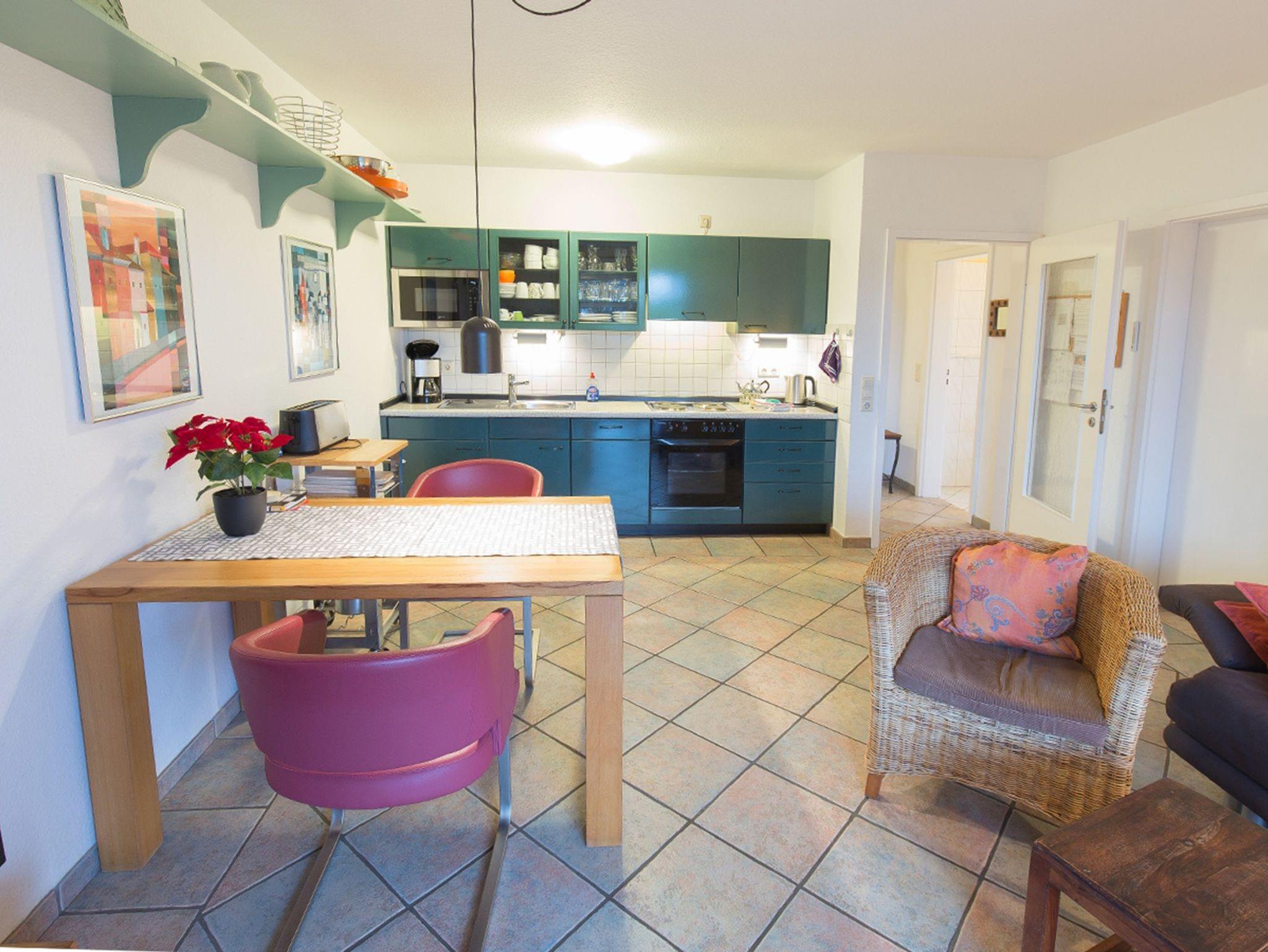 Sie betreten diese freundliche Erdgeschoss-Ferienwohnung durch eine geräumige Diele. Geradeaus gelegen das Fenster-Duschbad mit viel Platz und Stauraum sowie Waschmaschine und Trockner. Nach rechts bieten wir eine komfortable Küchenzeile im Landhausstil mit kompletter Grundausstattung. Geradeaus geht es in den mediterran sonnig gestalteten Wohn-/Essbereich mit Flachbild-TV und Ausgang zur Terrasse. Der Doppelschlafraum bietet ein bequemes Doppelbett mit genügend Kleiderschränken. Es gibt eine zusätzliche Schlafgelegenheit für zwei Personen auf dem ausziehbaren Sofa im Wohnzimmer. Entspannen Sie in der Ferienwohnung auf der geschützten Ostterrasse mit Garten zur Alleinnutzung. Direkt neben dem Haus befindet sich Ihr Fahrzeugstellplatz Nr. 2