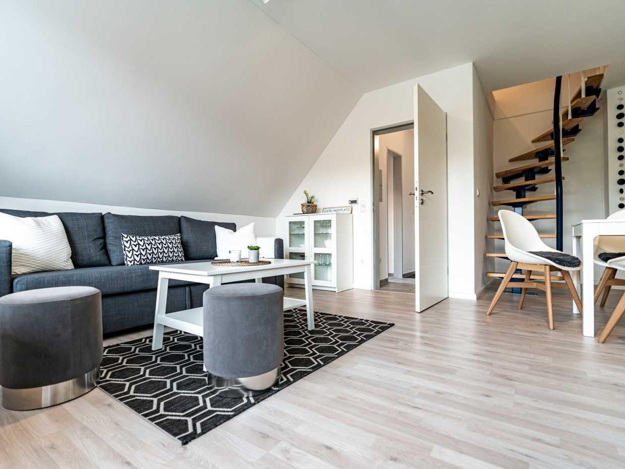 Diese schicke sanierte Oberwohnung mit Stellplatz vor dem Haus in der Humenser Str. 4 garantiert einen entschleunigten Urlaub. Vom Dielenbereich mit Garderobe gelangen Sie in der ersten Ebene ins schicke Wohnzimmer mit vorgelagertem Essplatz und dem ersten Schlafraum mit Doppelbett. Sie genießen dort Blick auf den möblierten Balkon mit Sonnenschutz. Die separat gelegenen Küchenzeile ist klein, aber fein, und für die Zielgruppe gedacht, die eher weniger Kochambitionen hat.