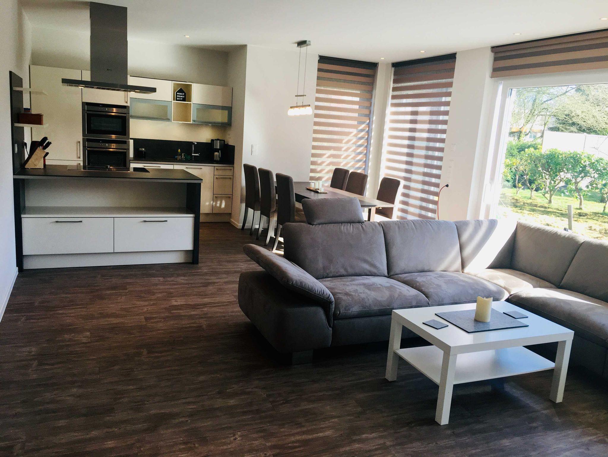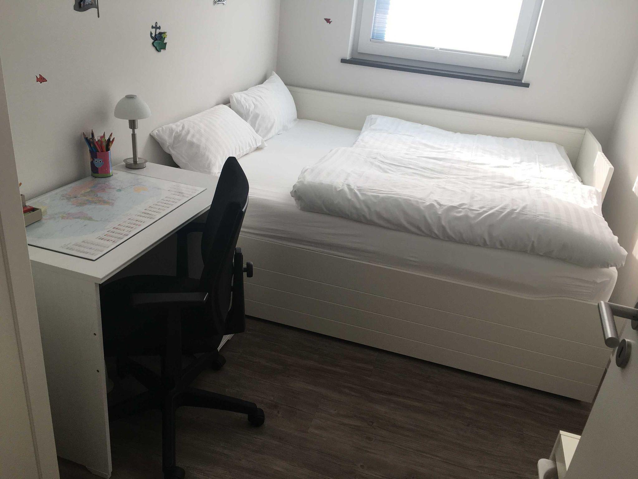Willkommen An Bord!Unsere Ferienwohnung hat eine Größe von 85 qm und ist aufgeteilt in folgende Räume: Ein großes Wohn- und Esszimmer mit offener moderner Küche. Hier steht eine Essgruppe mit 6 Stühlen und einem Kinderhochstuhl, sowie eine Couchecke mit einem großen LED-Fernseher. Das Elternschlafzimmer ist ausgestattet mit einem hochwertigen 180 x 200 cm 5-Sterne-Hotelbett (Box-Swing-Bett), einem Kleiderschrank, sowie einem kleinen Schreibtisch. Hier besteht auch die Möglichkeit noch ein Kinderreisebett aufzustellen. Im Kinderzimmer (max. 2 Kinder) steht ein Ausziehbett (180 x 200 cm) mit komfortablen Matratzen zur Verfügung, sowie ein Schreibtisch, ein kleiner Kleiderschrank, sowie ein Regal mit diversen Spielsachen und Büchern. Das moderne Badezimmer zeichnet sich durch modernes Design und hochwertige Sanitäreinrichtung aus. Ein Föhn ist selbstverständlich auch vorhanden. Im Flur befindet sich eine Garderobe sowie ein großer Schrank für Jacken, Schuhe, usw.. In einem kleinen Abstellraum finden Sie diverse Putzutensilien, Staubsauger, Wäscheständer,... . Durch das Wohnzimmer gelangen Sie auf die großzügige möblierte Terrasse mit schönem Garten zur sonnigen Südseite zum Erholen und Entspannen.
