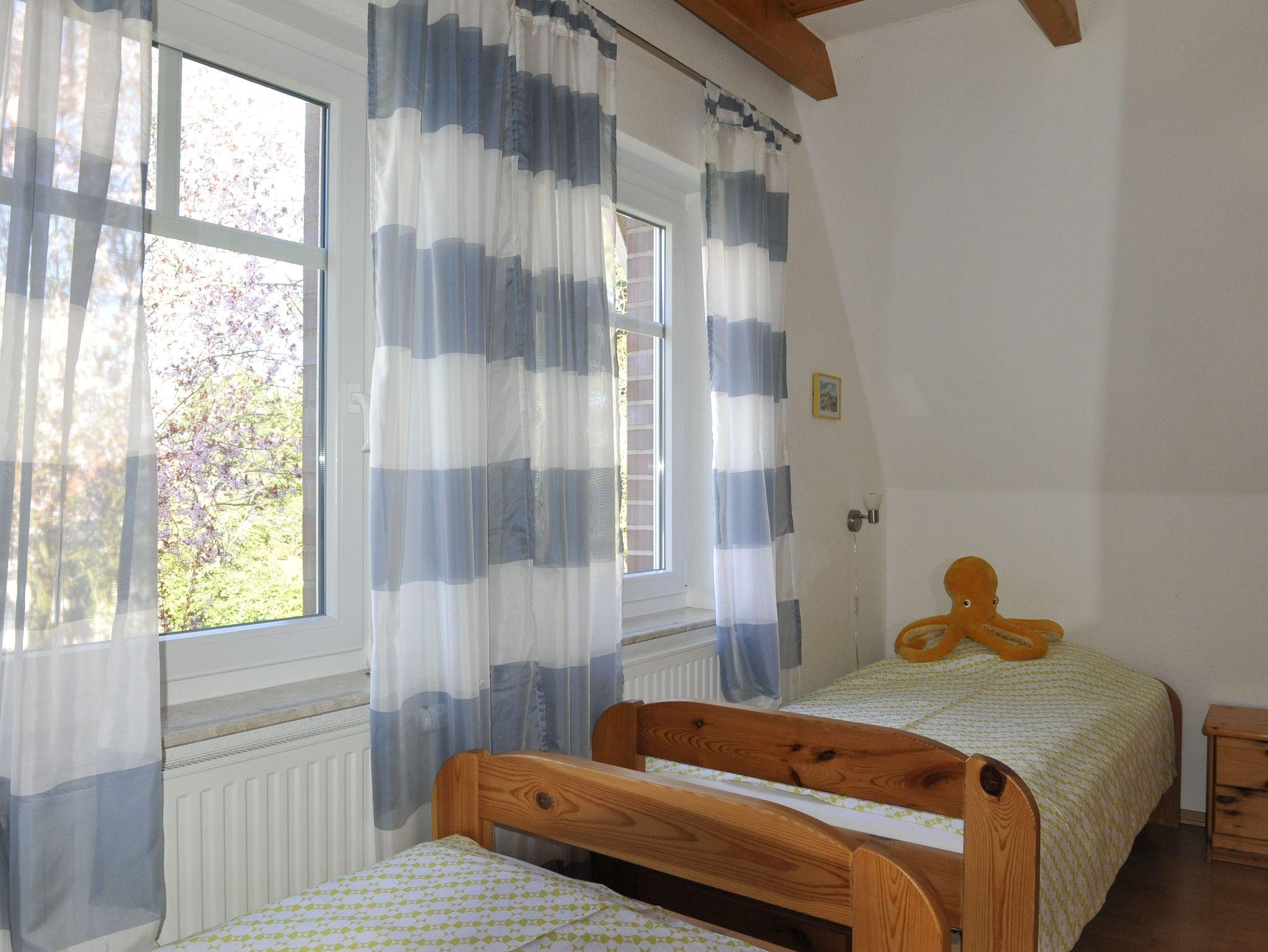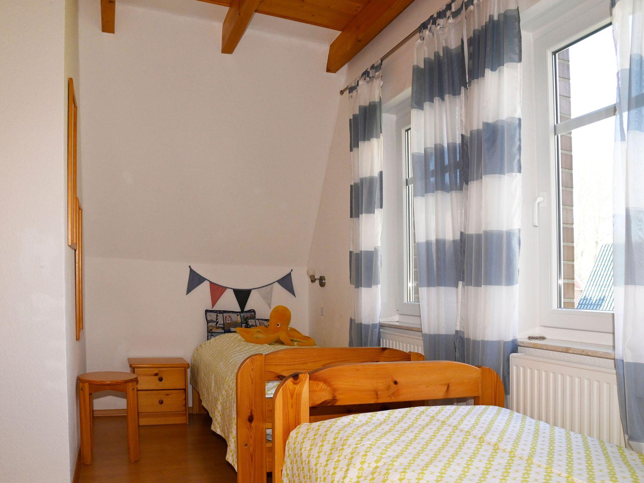 Der dritte Schlafraum im Dachgeschoss Es stehen zwei vollwertige Einzelbetten zur Verfügung. Der Raum ist mit zwei Kippfenstern ausgerüstet, eines davon verfügt über Insektenschutzgitter.