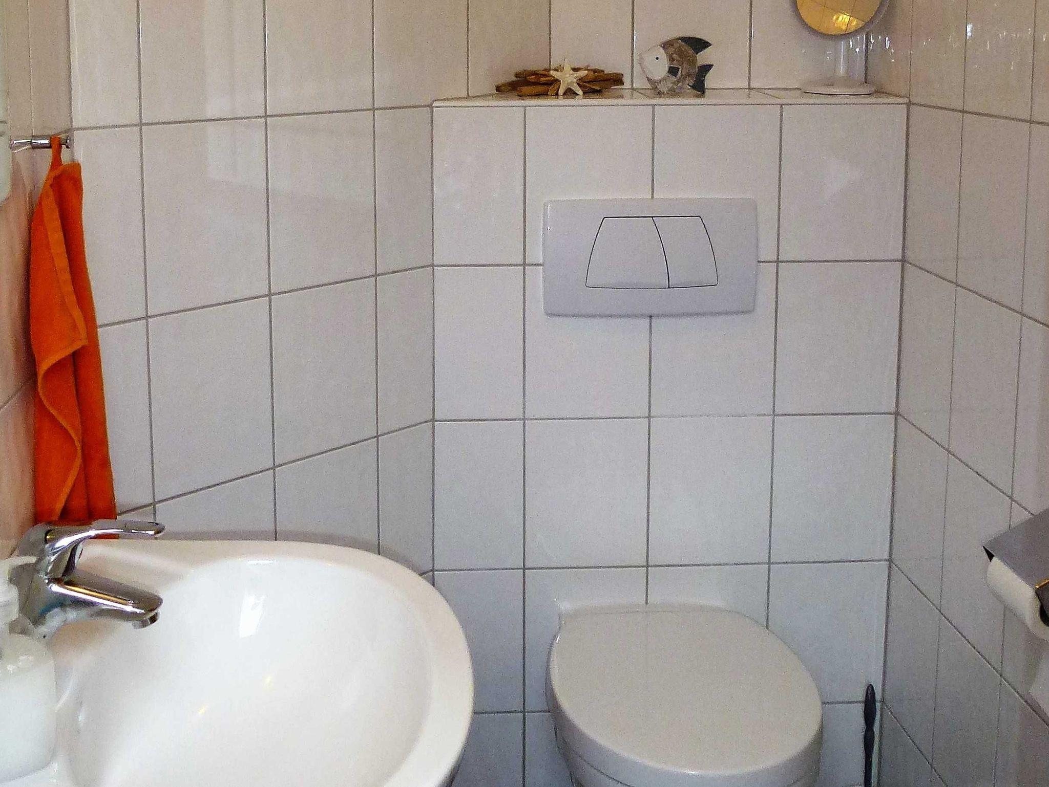 Das Badezimmer ist mit einer modernen Dusche und einem WC ausgestattet. Zusätzlich zum Heizkörper ist eine Fußbodenheizung vorhanden. Der Raum lässt sich über ein großes Fenster mit Sichtschutz und Insektenschutzgitter lüften. Darüber hinaus steht im Erdgeschoss ein separates Gäste-WC zur Verfügung.